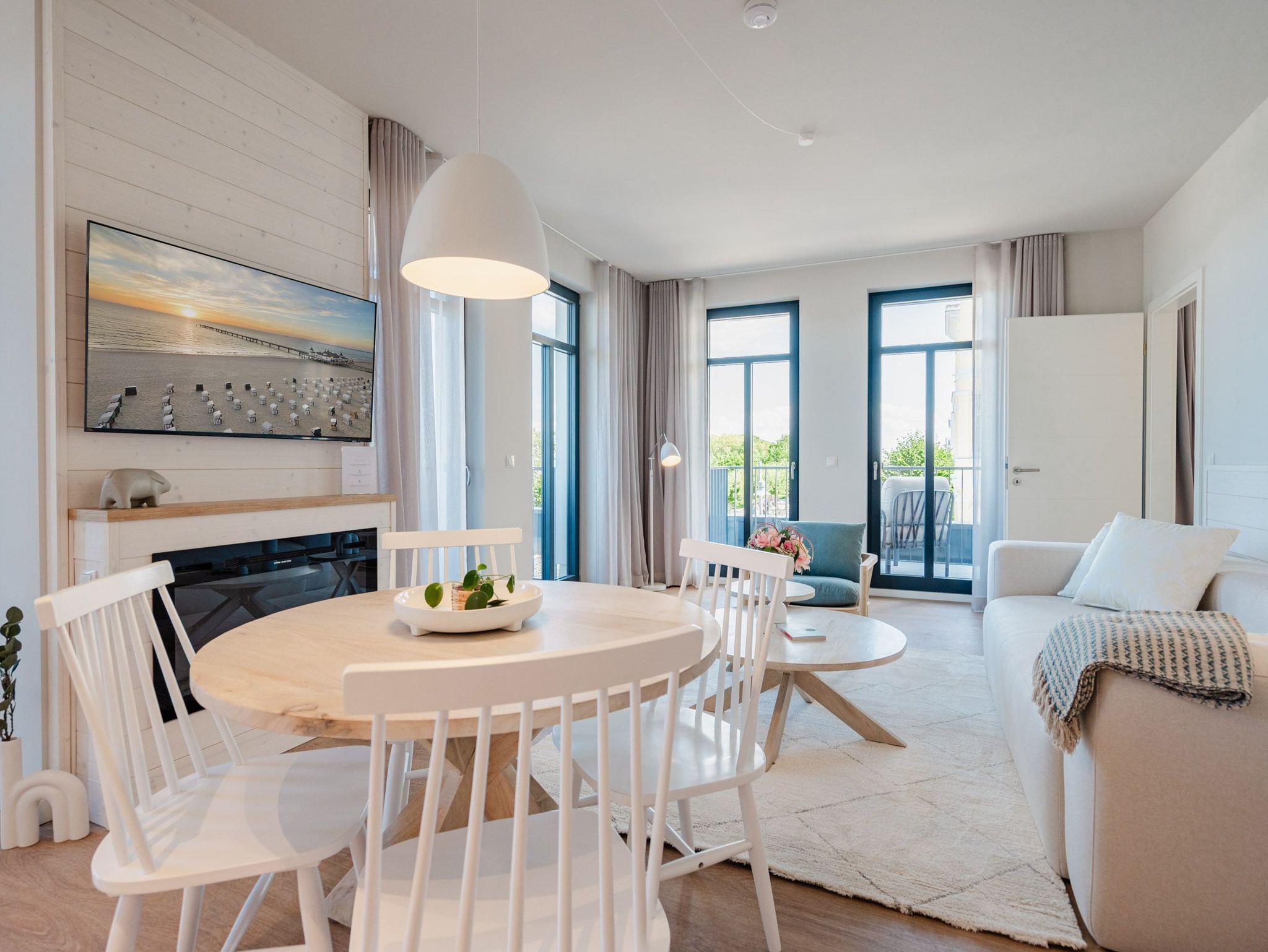 Die 2024 fertig gestellte Strandterrasse liegt direkt an der belebten Strandpromenade und bietet einen einzigartigen Ausblick auf die Grand Dame der historischen Seebrücken sowie die historische Konzertmuschel, einem beliebten Treffpunkt für Kunst und Kultur. Dahinter liegt die Ostsee ? ein Panorama, das zu den schönsten in den Kaiserbädern gehört. Es ist wie das Abtauchen in eine andere Zeit. In eine Zeit, in der man mit Stock, Sonnenschirm und Hut fürs „Sehen und gesehen werden“ über die Promenade schlenderte; aber auch in eine Zeit, in der ? damals wie heute ? Zeit einmal für eine kurze Weile keine Rolle spielt. Weil man angekommen ist im Loslassen, Entspannen und Genießen. Es ist dieser besondere Geruch nach Meeresluft und Freiheit, der in Erinnerung bleibt. Dazu die Bilder, die man mitnimmt. Von langen Strandspaziergängen, vom Lachen in fröhlich schäumenden Ostseewellen, von der Zeit in einem wunderschönen Urlaubsdomizil. Denn genau das ist die Strandterrasse mit ihren 56 modernen und exklusiven Ferienappartements direkt gegenüber der Ahlbecker Seebrücke. Die Ein-, Zwei- oder Dreizimmerwohnungen ? zwischen 40 und 70 Quadratmeter groß ? sind von einer Innenarchitektin gemeinsam mit unserem Erfahrungsschatz an Gästewünschen mit viel Liebe zum Detail und ganz individuell konzipiert worden. Entspannung und Wohlfühlen stehen an erster Stelle. Alles ist aufeinander abgestimmt und sorgt für eine gemütliche Atmosphäre. Wählen Sie zwischen einem Domizil in einem hellen, sandfarbenen Designkonzept oder einem Appartement mit anthrazitfarbenen Farbakzenten. Alle Appartements verfügen gleichermaßen über eine stilvolle und komfortable Einrichtung, die passgenau angefertigt worden ist, sowie über moderne Küchen und Bäder. Jedem Schlafzimmer ist ein eigenes Bad mit Dusche zugeordnet (außer App. B4.5). Die Appartements besitzen fast alle einen Balkon ? viele schauen sogar zur Ostsee hinaus. Die meisten Feriendomizile haben einen Elektrokamin und Infrarotsaunen. Im Erdgeschoss befindet sich ein separater Gemeinschaftsraum für Fahrräder. Außerdem besteht die Möglichkeit, im Gemeinschaftswaschraum 2 Waschmaschinen [&] Trockner zu nutzen. Ergänzt wird das Angebot durch eine Gemeinschaftssauna, die täglich von 11:00 bis 22:00 Uhr nutzbar ist. In der Tiefgarage (Einfahrtshöhe 2,03 Meter) steht für jede Wohnung 1 Pkw-Stellplatz zur Verfügung. Ist alles zur Zufriedenheit untergebracht? Dann kann der Urlaub ja beginnen. Und beim Blick vom Balkon über die Ostsee treffen sich zum Sonnenaufgang das Heute und das Damals. Gelassenheit legt sich beim Gang hinunter an den Strand auf die Seele. Jetzt darf die Zeit stehenbleiben.