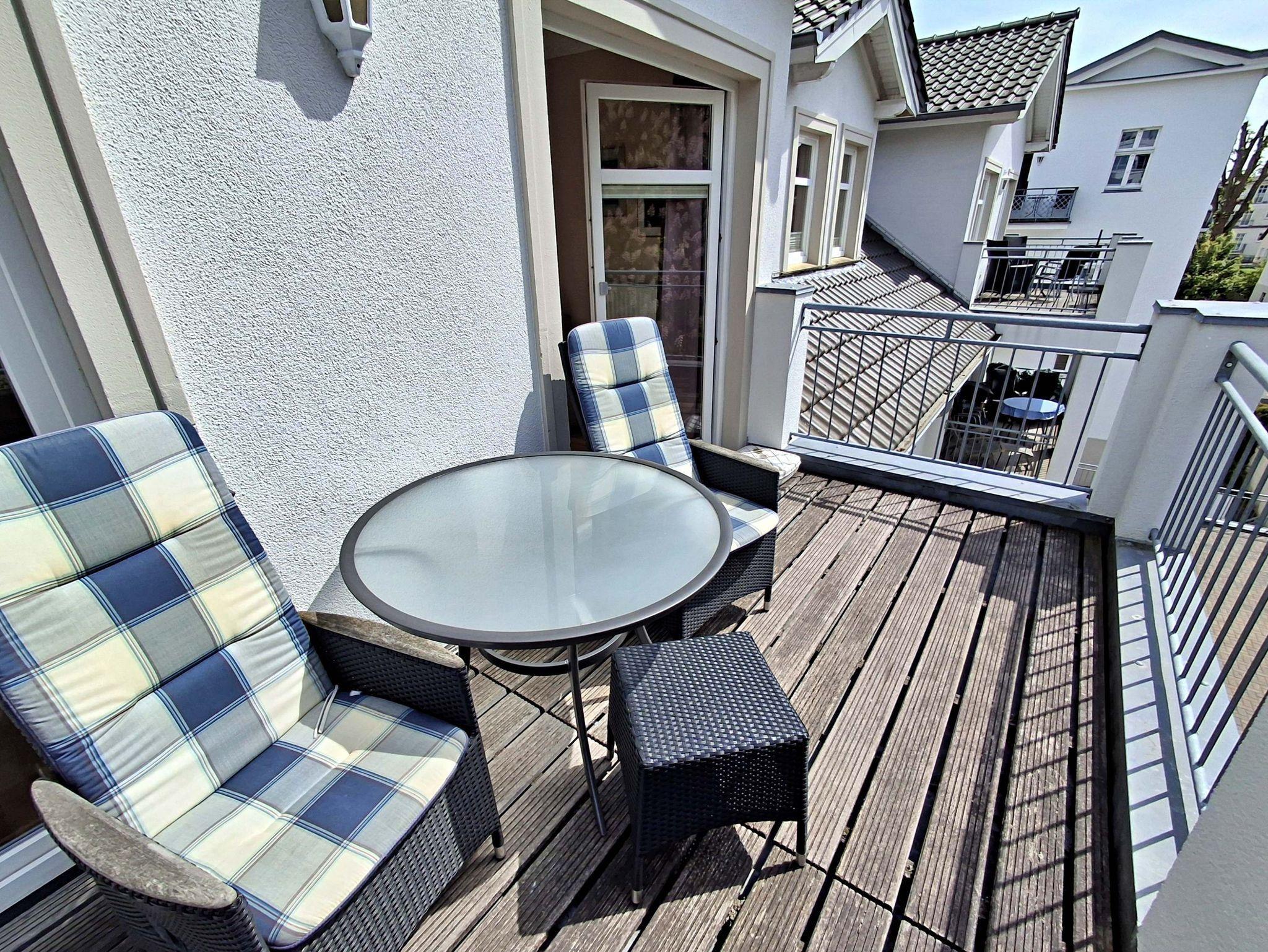 Die gemütliche 2-Zimmer-Wohnung Seeschwalbe im 3. Obergeschoss mit Balkon für max. 3 Erwachsene und 1 Kind bis 8 Jahre befindet im Nebengebäude der stilvoll restaurierten Villa Ahlbeck - nur wenige Schritte von der Promenade und dem Strand entfernt. Im Wohnbereich befinden sich neben der Couch auch ein Sessel mit passendem Fußhocker sowie ein Esstisch mit 4 Stühlen, der genügend Platz für 4 Personen bietet. Das Highlight der Wohnung ist der großzügige Balkon in West-Ausrichtung, wo Sie bei schönem Wetter bereits morgens Ihren Kaffee genießen oder den Abend bei einem Glas Wein ausklingen lassen können. Die moderne Küchenzeile mit Ceranherd, Backofen, Geschirrspüler, Mikrowelle, Kaffeemaschine, Wasserkocher und Toaster lässt keine Wünsche offen. Für die Unterhaltung sorgen ein Flachbild-TV, Radio-CD-Player und kostenfreies W-LAN. Das Schlafzimmer verfügt über ein Doppelbett und das Badezimmer hat DU/WC.