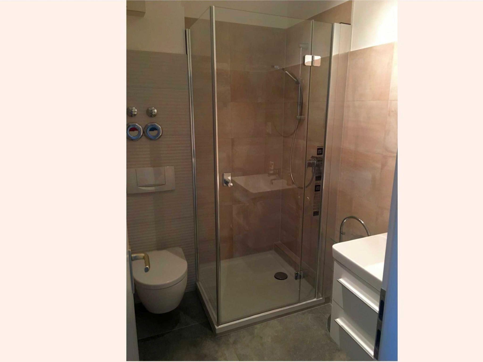 Das Badezimmer ist ebenfalls sehr modern eingerichtet und verfügt über eine ebenerdige Dusche, ein Waschbecken, ein WC, ein Föhn und einen kleinen Schrank für Ihre Toilettenartikel.