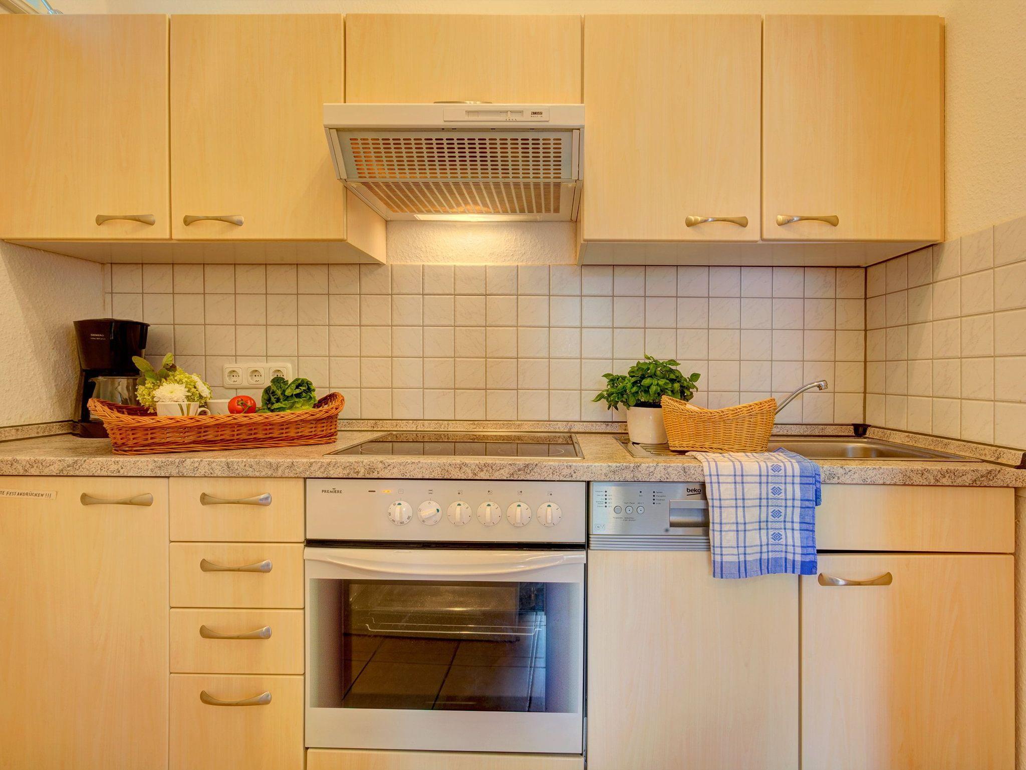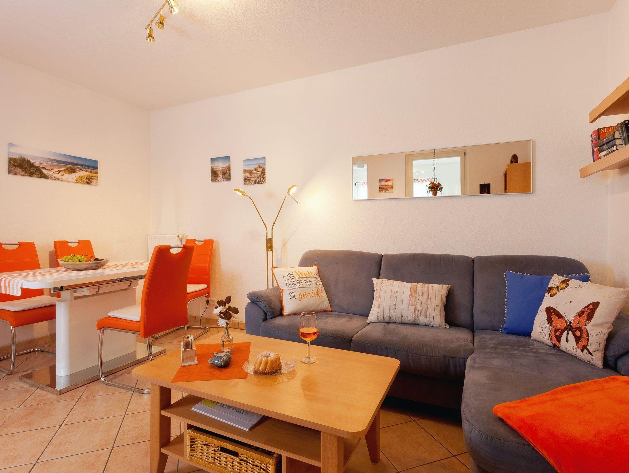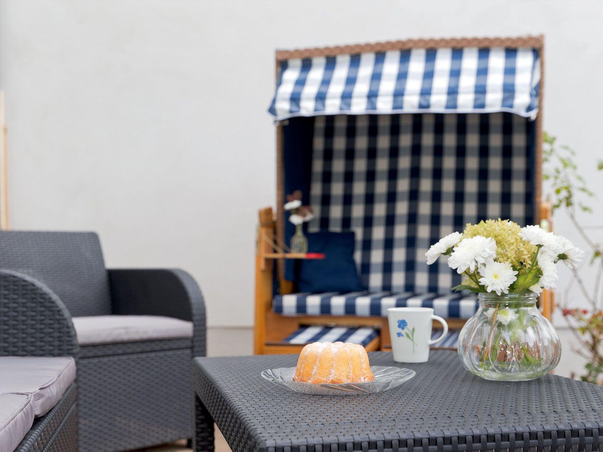 Das großzügige Wohnzimmer mit bequemer Couch (mit Schlaffunktion), Flat TV und Esstisch für 4 Personen lädt zum gemütlichen Beisammensein ein. Vom Sofa aus genießen Sie Ihre Lieblingsserie oder ziehen Sie sich mit einem spannenden Buch in die angrenzende Loggia mit Couch (mit Schlaffunktion) und zwei Korbsesseln zurück. Die separate Küche lässt keine Wünsche offen: Kühlschrank mit Gefrierfach, 4fach-Kochfeld, Backofen, Geschirrspülmaschine, Kaffeemaschine, Toaster und Wasserkocher, Mikrowelle u.v.m.. Das freundliche Schlafzimmer verfügt über ein Doppelbett (180 x 200cm / zwei getrennte Matratzen), einen geräumigen Kleiderschrank für Ihr Reisegepäck sowie Flat TV. Dank der Schlafcouch in der Loggia können bis zu vier Personen gemeinsam Ihren Urlaub in dem Appartement verbringen und sind durch die ideale Aufteilung der Räumlichkeiten dennoch etwas für sich.