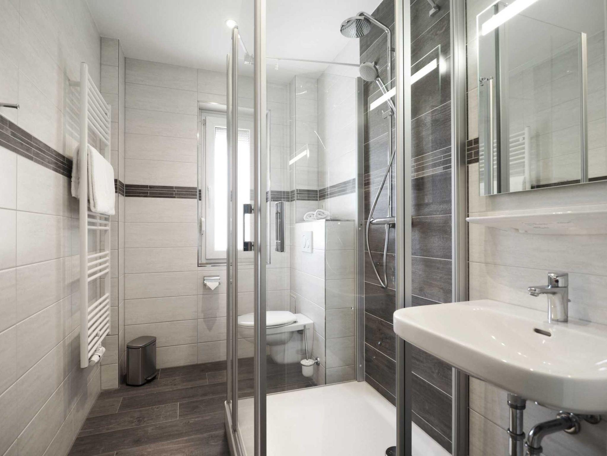 - Badezimmer vom Flur begehbar mit Dusche, WC und Haarfön.