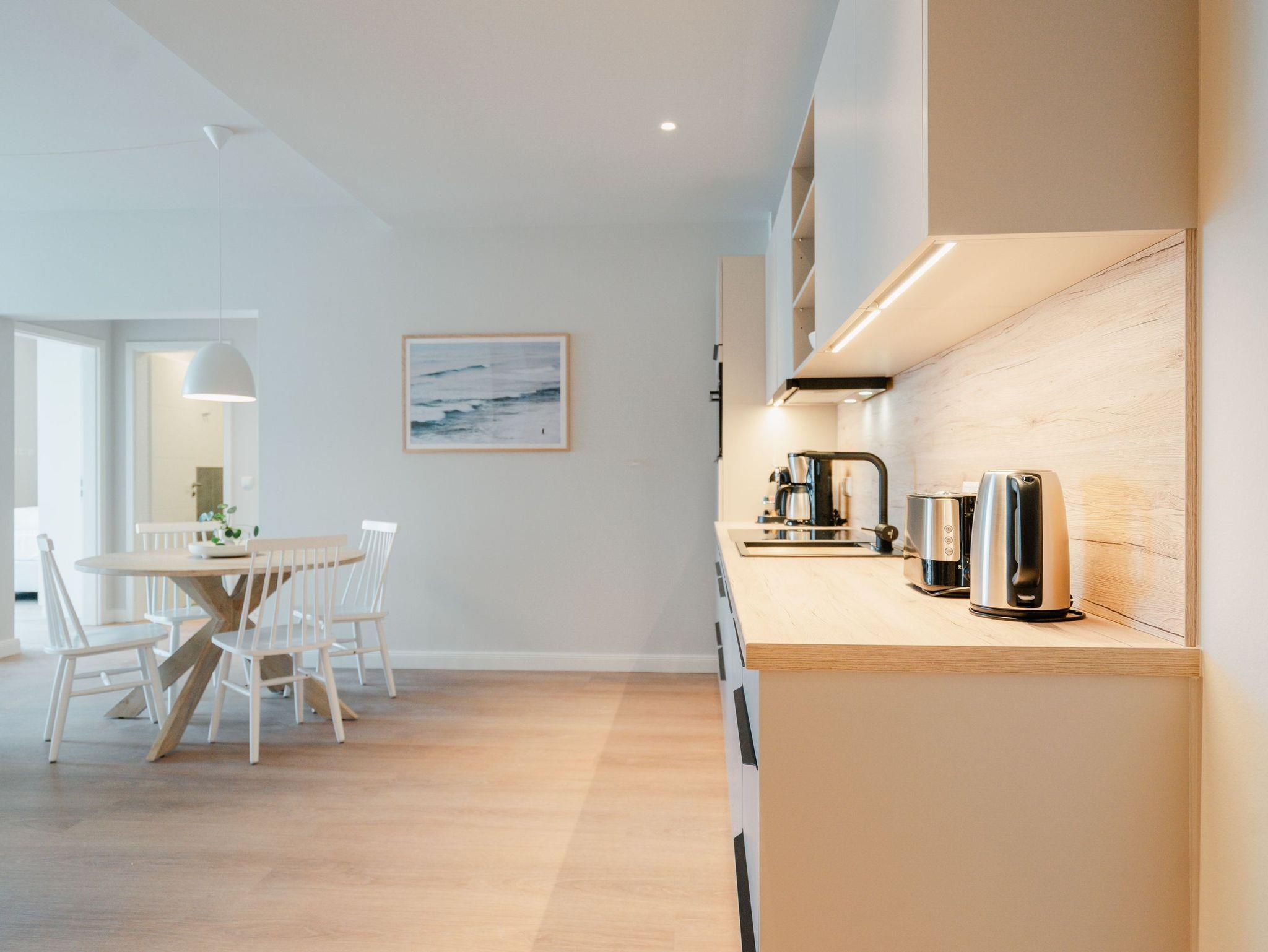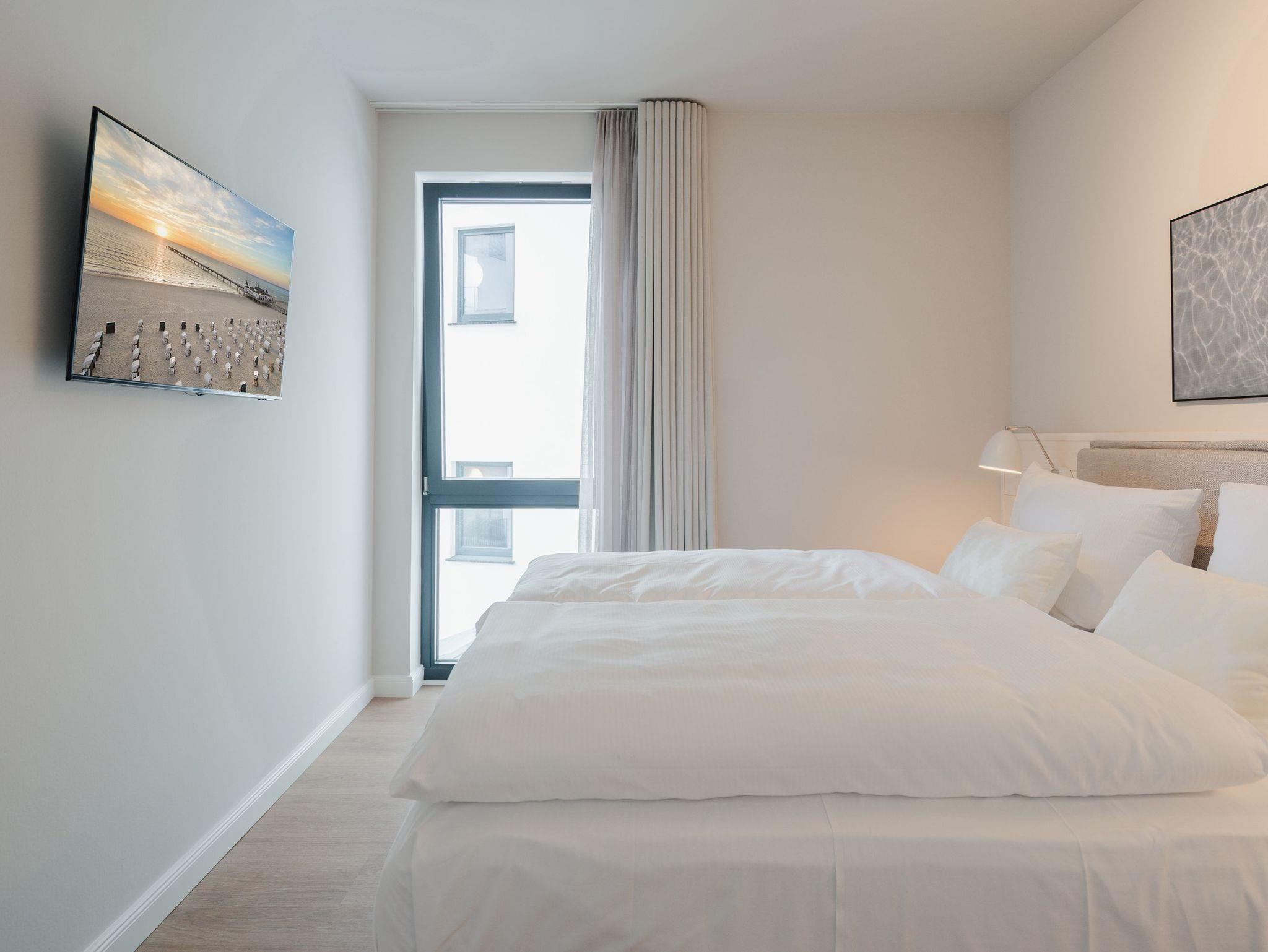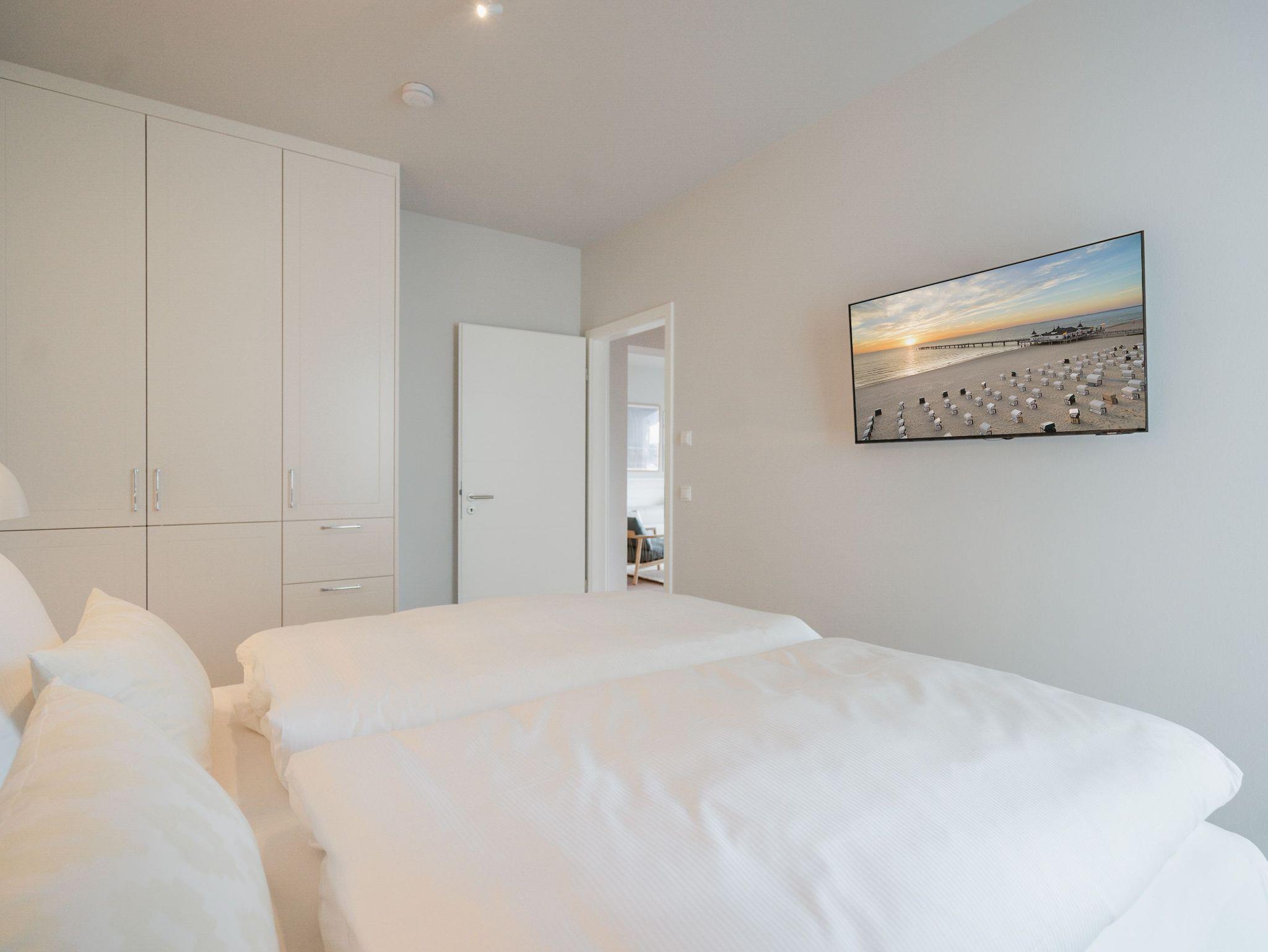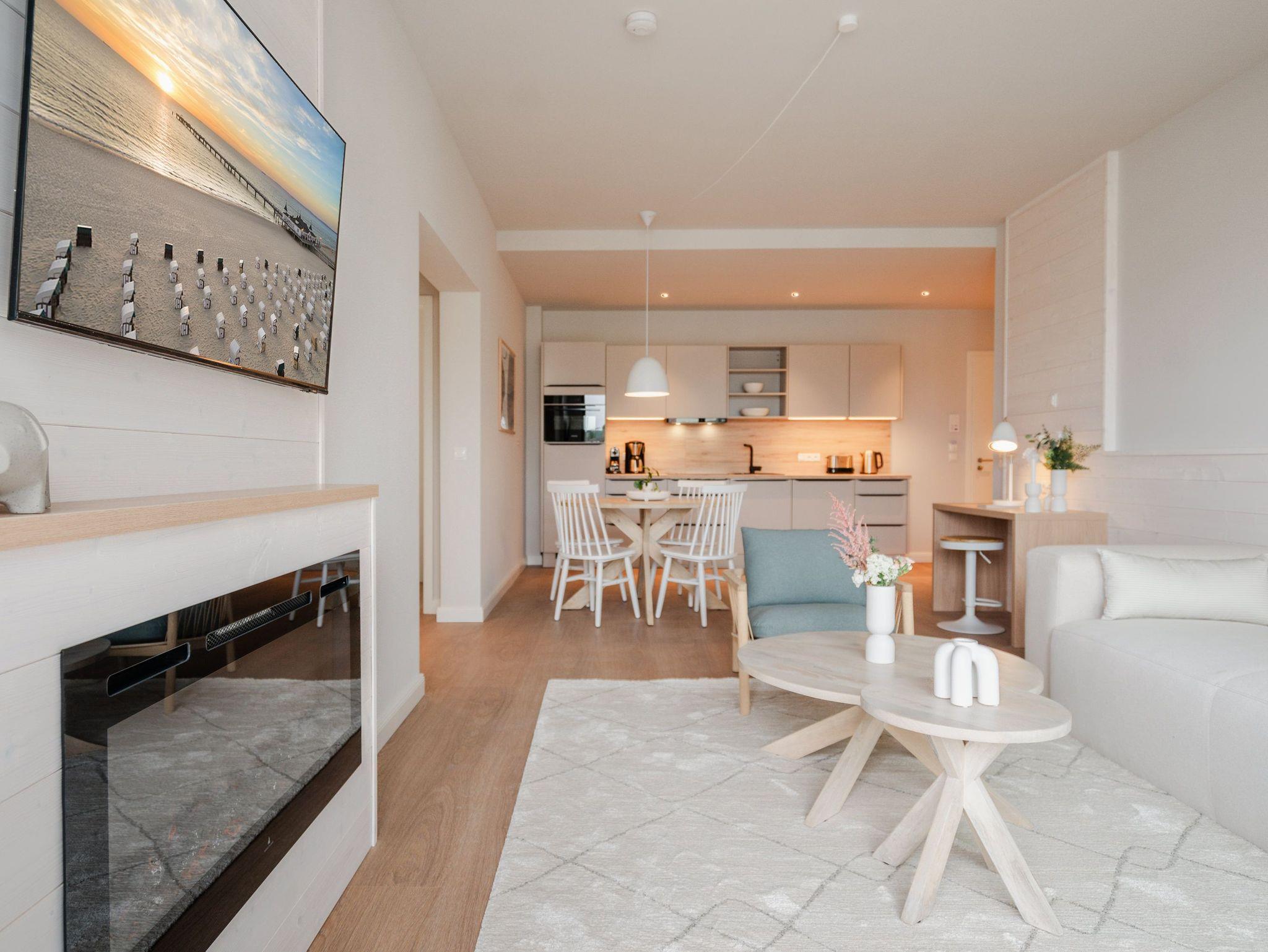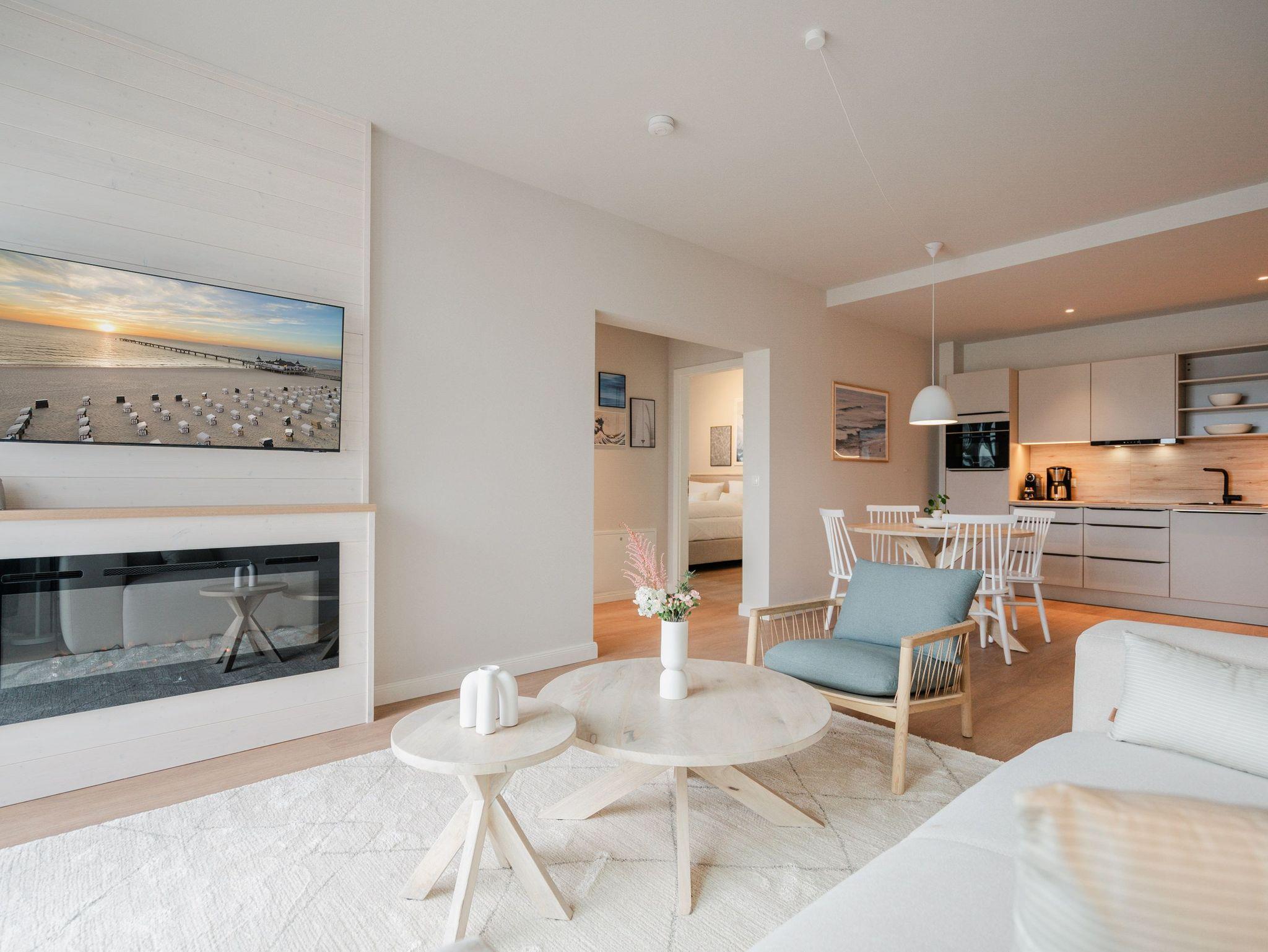 82 großzügige Quadratmeter warten im Appartement B 2.1 im Haus B der Strandterrasse im 2. Obergeschoss nur darauf, seinen bis zu 4 Gästen eine unvergessliche Auszeit direkt an der Ahlbecker Strandpromenade zu bescheren. Freuen Sie sich auf viel Platz, Komfort und Eleganz in diesem 3-Raum-Appartement. Es ist ein kleines Auszeitparadies mit jeder Menge Schick und Noblesse. Ein großes Wohn-Esszimmer ist der ideale Raum für gemeinsame Mußestunden ? auf dem stylischen und äußerst bequemen Sofa oder dem dazu gehörenden Sessel oder am schönen großen Esstisch. Ein Elektrokamin (ohne Wärmeabgabe) sorgt für Gemütlichkeit und um das Entertainment kümmert sich der 50 Zoll Flat-TV. Eine kleine Arbeitsstation ergänzt den Raum funktional. Viel Spaß beim Postkarten schreiben. Die zum Wohnzimmer hin offene Küchenzeile ist mit allen modernen Markengeräten ausgestattet. Ein Backofen, ein 4-Platten-Induktionsherd, ein Toaster, eine Geschirrspülmaschine, eine Kaffeemaschine sowie eine Nespresso-Kapselmaschine sind nicht nur Helfer beim Kochen und Zubereiten der Mahlzeiten, sie sorgen auch für Spaß in der Küche. Ist das Wetter schön, eignet sich der West-Balkon zum Essen unter freiem Himmel bestens. Das Meeresrauschen der nahen Ostsee gehört zum Service dazu. Zugang zum Balkon haben Sie sowohl vom Wohnzimmer als auch von einem der beiden Schlafzimmer. Hier können Sie also schon direkt nach dem Aufstehen einen tiefen Atemzug frische Ostseeluft genießen. Beide Schlafzimmer verfügen gleichermaßen über ein komfortables Boxspringdoppelbett (eines davon 1,80m x 2,00m), einen Kleiderschrank sowie einen weiteren Flat-TV (43 Zoll). Die Wohnung verfügt zudem über zwei moderne Duschbäder mit Waschtisch und WC. Eine kleine Wellnessoase in Form einer Infrarotsaunakabine wartet in einem der Bäder auf entspannungssehnsüchtige Wärmeliebhaber. Zum Appartement gehört in der Tiefgarage ein PKW-Stellplatz. Sie sehen, es ist alles bereit für eine erholsame Auszeit an der Ostsee.