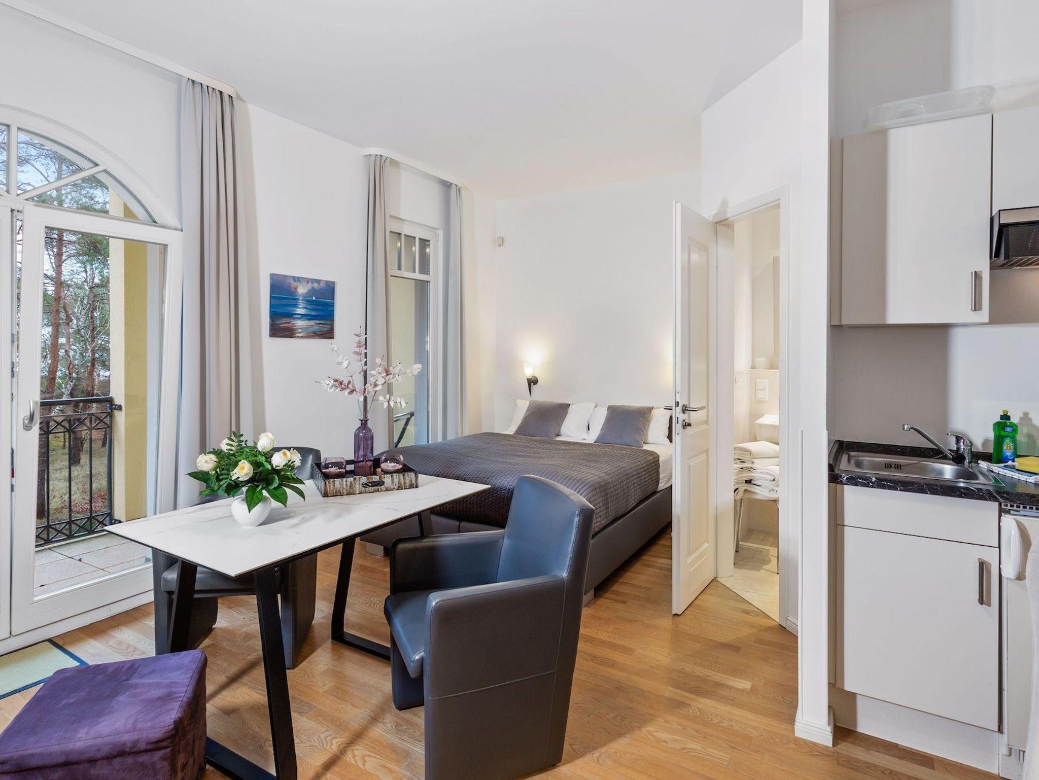 Das 25 m² große 1-Raum-Appartement Oie in der 2. Etage begrüßt Sie mit dem beruhigenden Klang der Ostseewellen. Im Sommer erleben Sie den Sonnenaufgang bequem aus dem Bett ? ein perfekter Start in den Tag. Der über die gesamte Breite des Appartements reichende, eingebaute Balkon lädt zu gemütlichen Stunden ein, ob mit Sonnenhut oder Kuscheldecke. Vom bequemen Ohrensessel genießen Sie den Blick aufs Meer, während Sie lesen, fernsehen oder einfach entspannen. Die kompakte Küchenzeile (1 m breit) mit 2-Platten-Cerankochfeld, Spüle und Kühlschrank mit Gefrierfach ist mit allem ausgestattet, was Sie für die Zubereitung kleiner Mahlzeiten zu zweit benötigen. Als Gast haben Sie jederzeit Zugang zum hauseigenen Wellnessbereich mit Ruheraum ? ideal zum Lesen, Entspannen oder einfach zum Abschalten nach einem Strandtag. Ihre leeren Gepäckstücke können Sie bequem in einer Abstellkammer auf derselben Etage unterbringen. Ein eigener PKW-Stellplatz am Haus steht Ihnen während des gesamten Aufenthalts zur Verfügung.