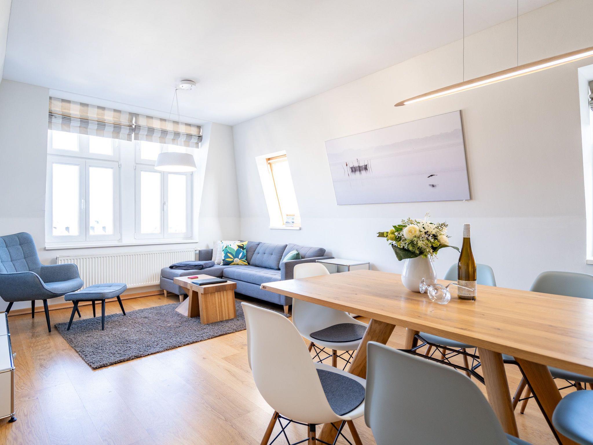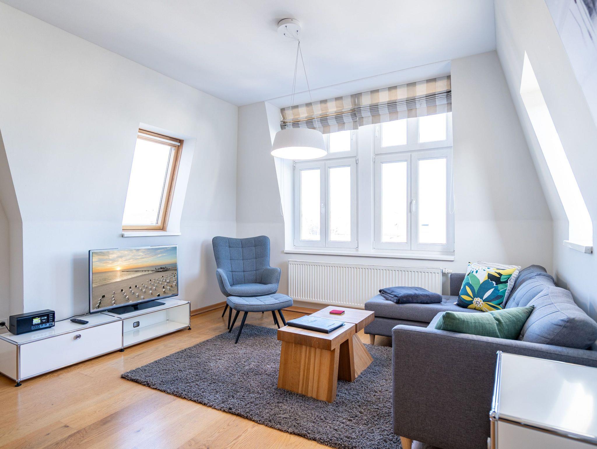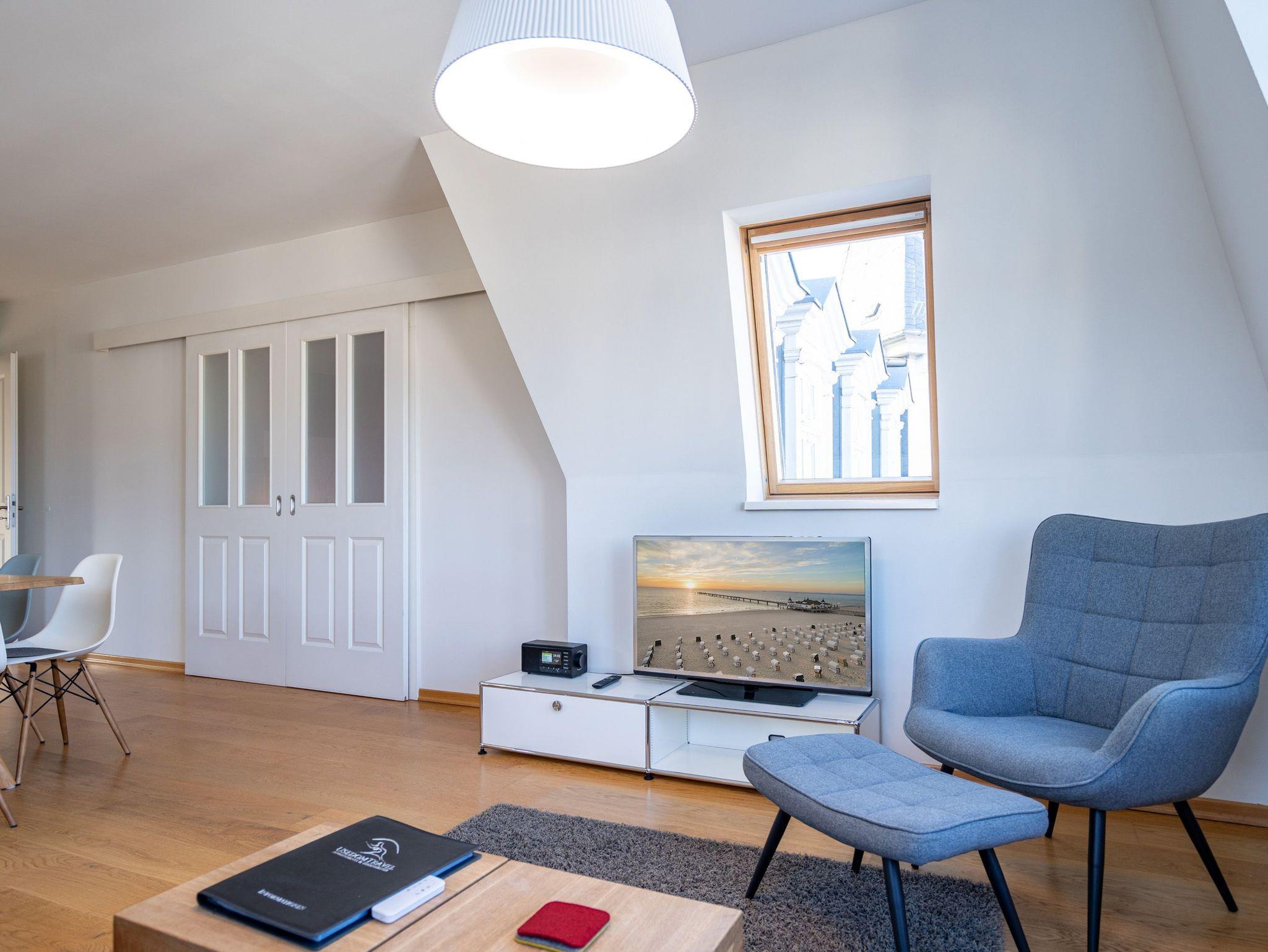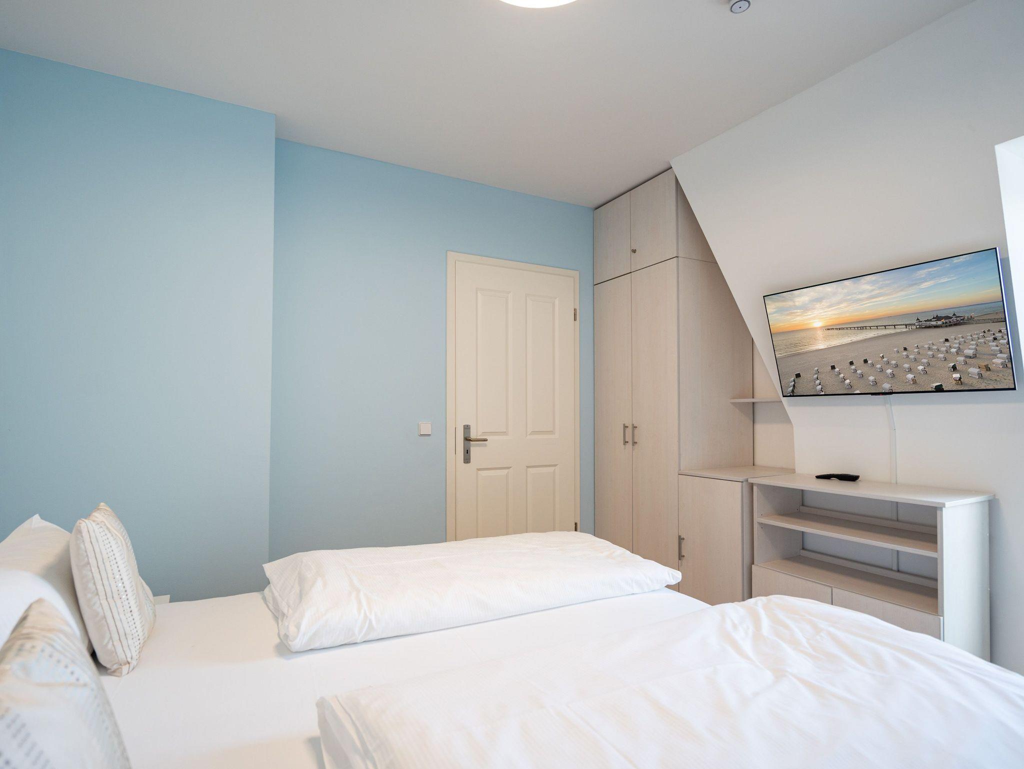 Logieren Sie im Schloss am Meer und genießen Sie eine stilvolle, moderne Atmosphäre mit einem wunderschönen Blick auf die Ostsee und Ahlbeck. Die hochwertig renovierte Ferienwohnung 5 bietet Ihnen ein großzügiges Wohnzimmer, eine exklusive und komplett ausgestattete Küche sowie zwei komfortable Schlafzimmer. Eines ist mit einem Doppelbett (1,80 m x 2,00 m) sowie einen zusätzlichen Flat-TV ausgestattet, das zweite verfügt über ein Doppelbett (1,40 m x 2,00 m). Das elegante Badezimmer bietet sowohl eine Dusche als auch eine Badewanne sowie ein WC. Ein besonderes Highlight ist der großzügige Südbalkon mit seitlichem Blick auf die Ostsee, der zum Entspannen einlädt. Für unsere kleinen Gäste stellen wir auf Wunsch ein Kinderreisebett (ohne zusätzliche Matratze und Bettzeug) sowie einen Kinderhochstuhl gegen Aufpreis zur Verfügung. Für maximalen Komfort sind die Betten bei Ihrer Anreise bereits bezogen, und Handtücher liegen bereit (Erstausstattung). WLAN nutzen Sie kostenfrei. In der Tiefgarage steht zwischen den Stellplätzen 2 und 5 eine Wallbox mit einem Ladepunkt zur Verfügung, die für beide Wohnungen zugänglich ist.