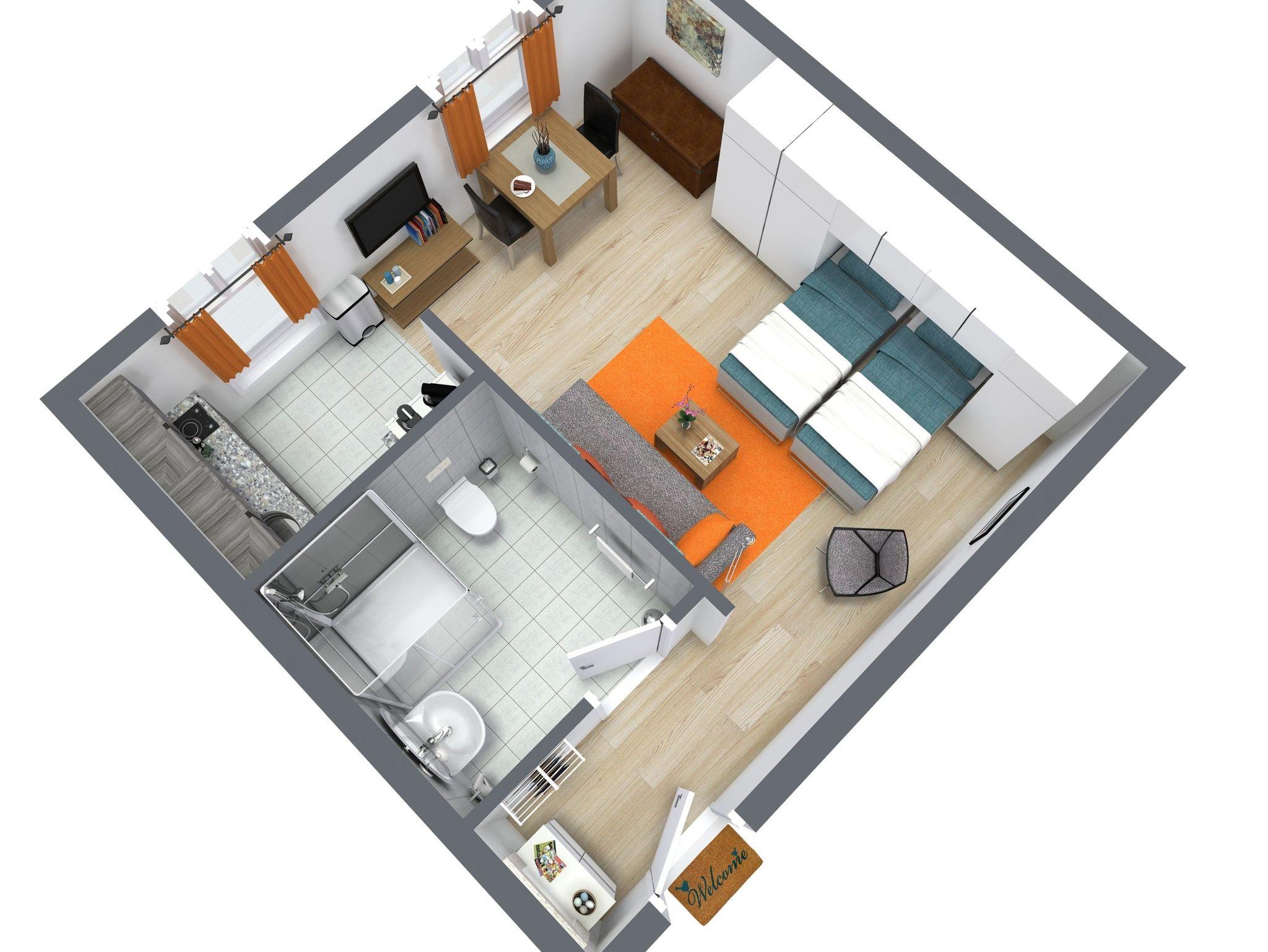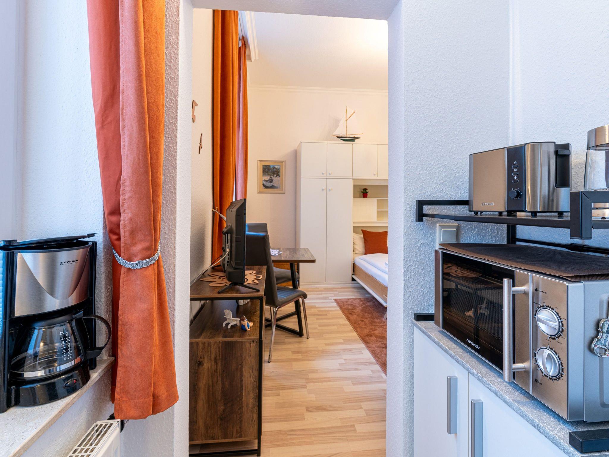 Die 25 qm große Ferienwohnung, geeignet für max. 2 Personen, befindet sich im Hochpaterre (5 Stufen) der historischen Villa Schloss Hohenzollern. Die Wohnung verfügt über einen kleinen Eingangsbereich als Flur mit Garderobe, einen Wohnschlafraum sowie einer separaten Küche und Bad. Der Wohnschlafraum ist ausgestattet mit zwei einzeln klappbaren Schrankbetten, einen gemütlichen Wohnbereich zum Entspannen sowie einen Essplatz. In der Küche finden Sie technische Geräte wie Kühlschrank mit Gefrierfach, 2 Herdplatten, Mikrowelle mit Grillfunktion, Wasserkocher, Toaster, Kaffeemaschine und einen Einerkocher vor.