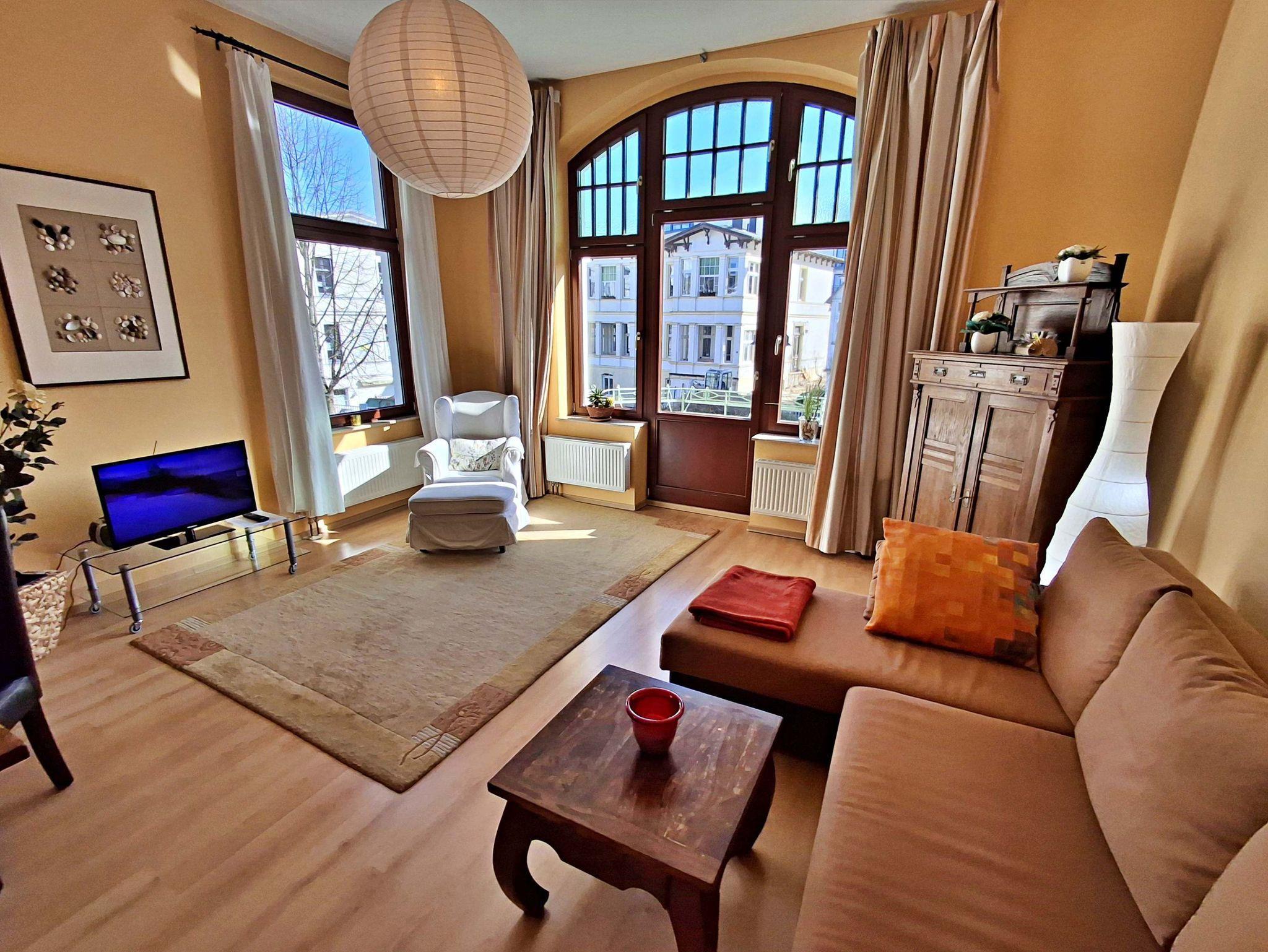 Auf 60 qm erwartet Sie eine stilvolle und charmante Unterkunft, die mit hochwertigen und geschmackvollen Möbelstücken ausgestattet ist und dem Villencharakter perfekt entspricht. Der kombinierte Wohn- und Essbereich lädt zum Entspannen ein und bietet Ihnen eine bequeme Couch, einen Sessel, einen Flachbild-TV sowie einen Esstisch mit vier Stühlen ? ideal für gesellige Abende. Die gut ausgestattete Küchenzeile verfügt über einen Herd, Backofen, Spülmaschine, Kühlschrank, Wasserkocher, Toaster und Kaffeemaschine, sodass Sie sich ganz nach Belieben selbst versorgen können. Im Schlafzimmer erwartet Sie ein gemütliches Doppelbett und ein geräumiger Kleiderschrank für Ihre persönlichen Dinge. Das Badezimmer ist mit einer Dusche/WC und einer Badewanne ausgestattet und rundet die komfortable Ausstattung ab.