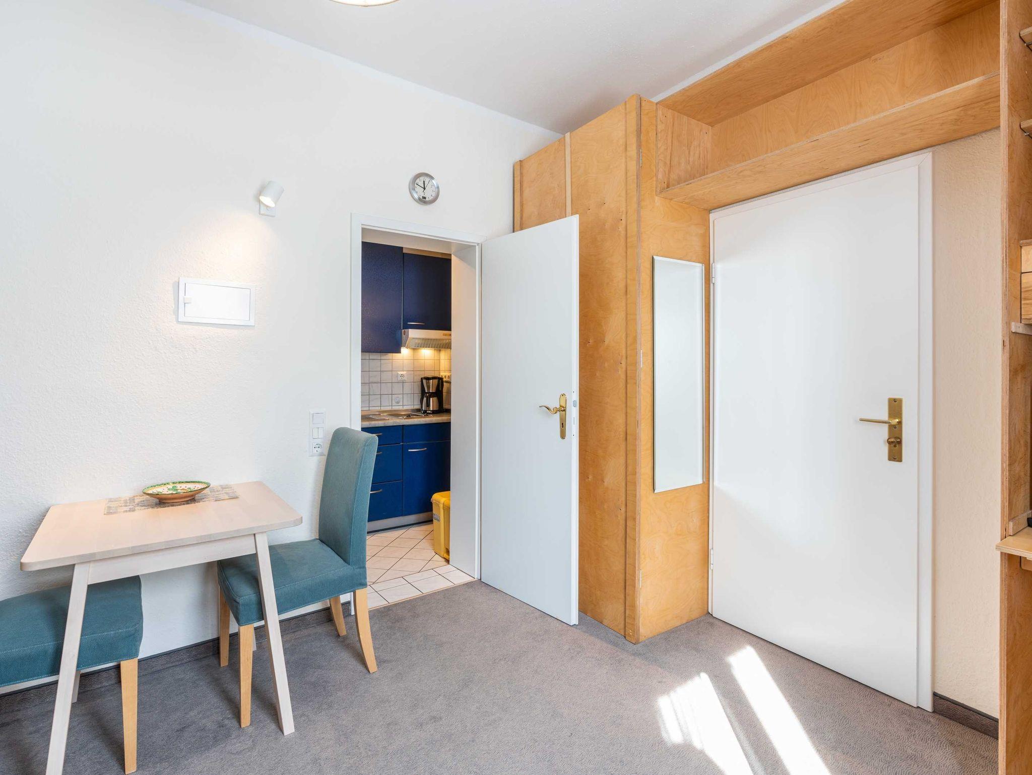 Das 20 m² große Appartment im 1. Obergeschoss bietet Platz für 2 Personen, es verfügt über ein Wohnzimmer mit Schlafcouch, einen Essbereich, eine vollausgestattete Küche, einem Duschbad und einen Balkon.