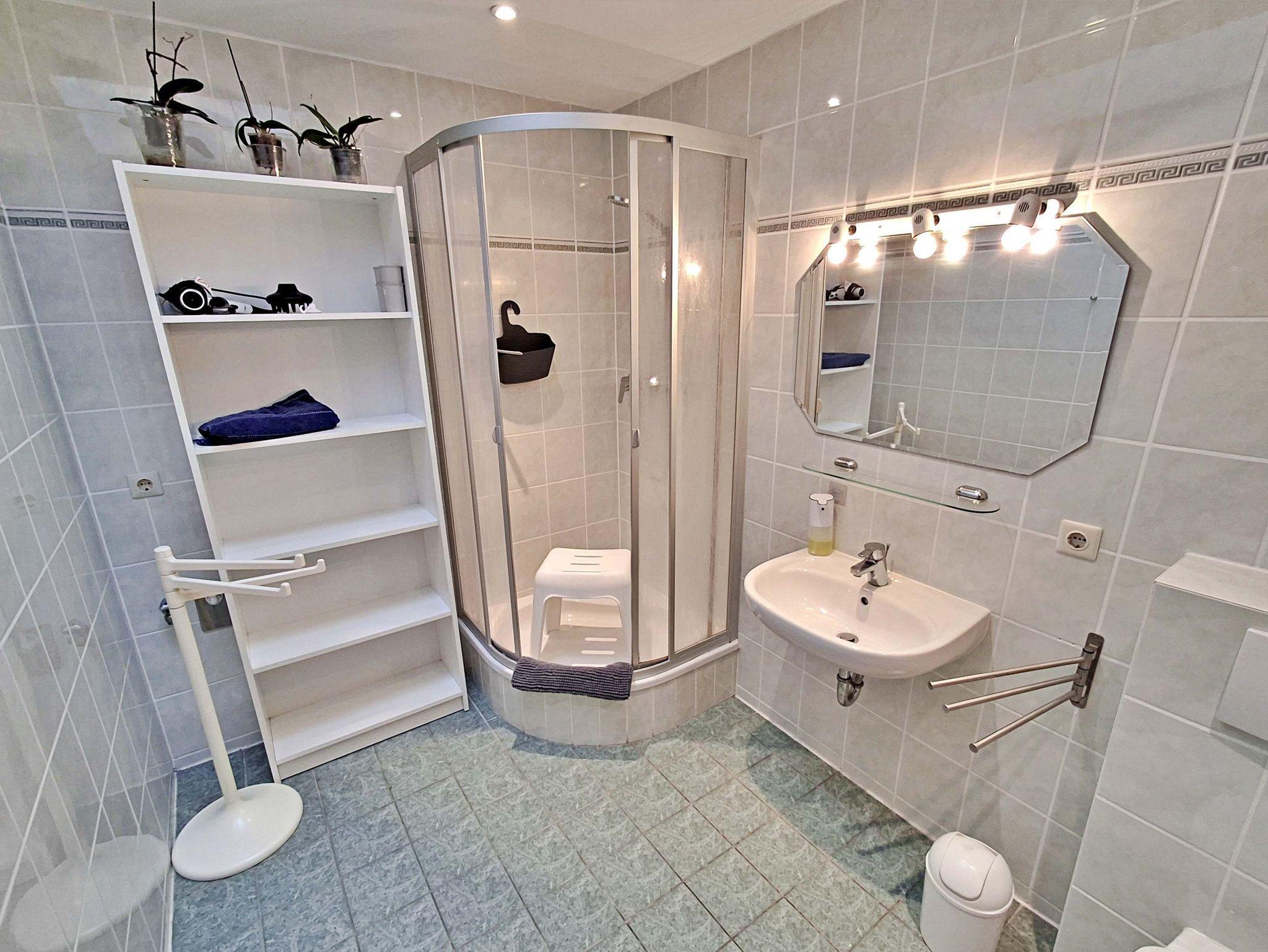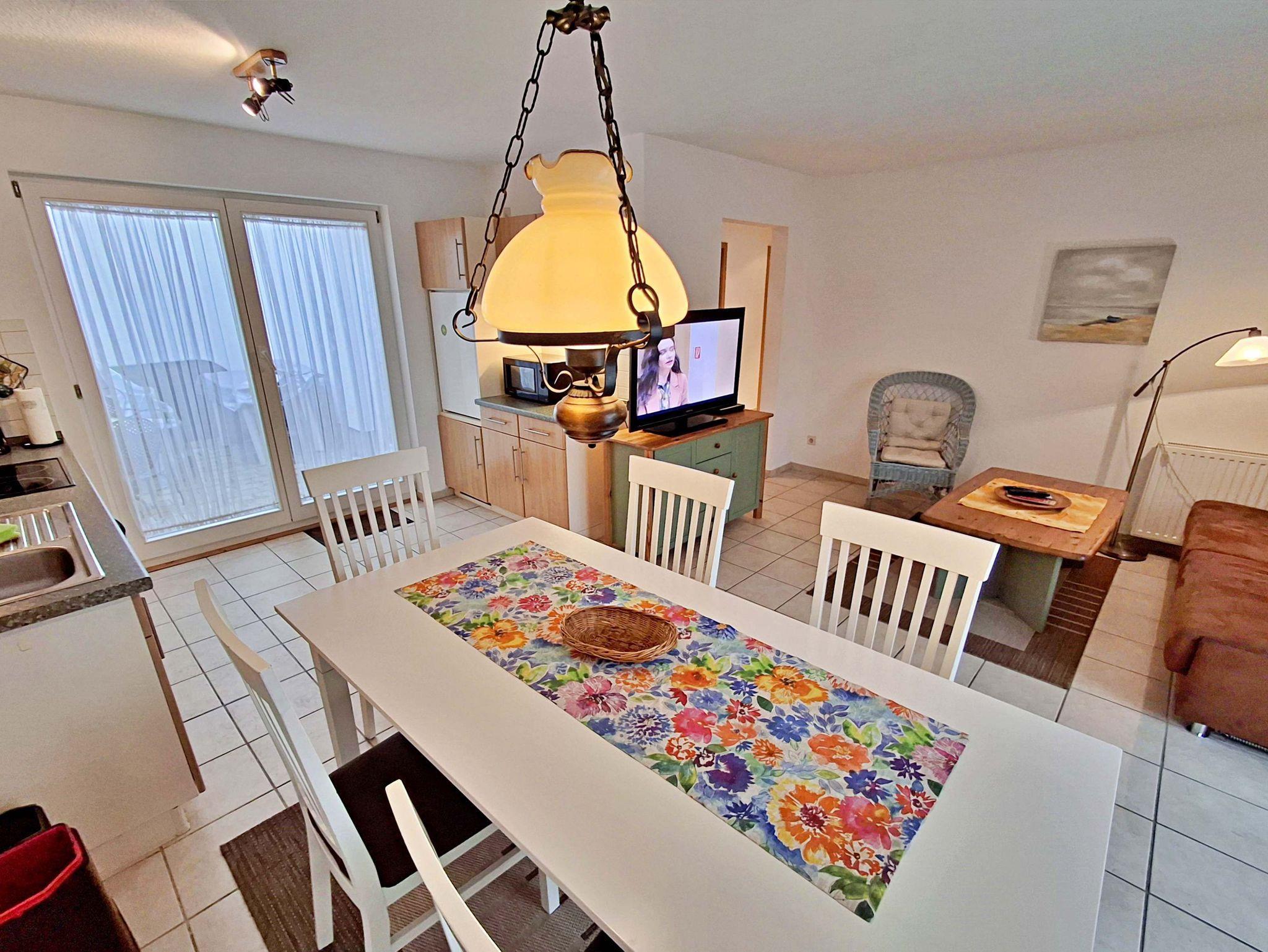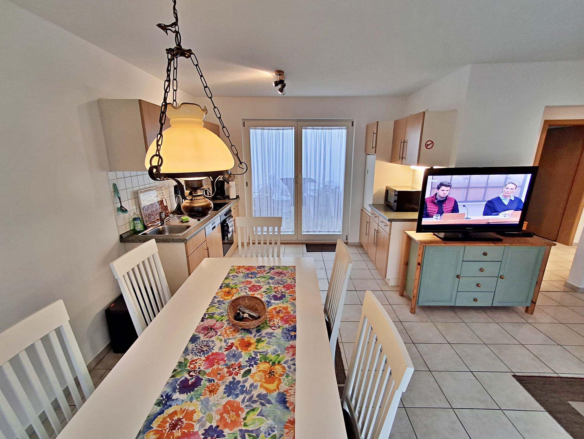Diese moderne 65qm große 3-Raum-Ferienwohnung im Erdgeschoss verfügt über einen kombinierten Wohn- und Schlafraum (Schlafcouch für max. 1 Kind bis acht Jahre) mit Sat-TV und Radio, zwei Schlafzimmer mit jeweils einem Doppelbett sowie eine Küchenzeile mit 4-Platten-Ceranherd, Backofen, Spülmaschine, Mikrowelle, Kühlschrank mit Gefriermöglichkeit, Kaffeemaschine, Wasserkocher, Toaster und Geschirr. Das Badezimmer hat Dusche/WC und Fußbodenheizung. Die Terrasse, sowie die nnenliegende Terrasse mit Sitzmöbeln lädt zum Verweilen ein und vervollständigt die gemütliche Ausstattung der Wohnung. Ihren Pkw können Sie gern an der Ferienwohnung parken (nicht für Kleinbusse und Anhänger geeignet).