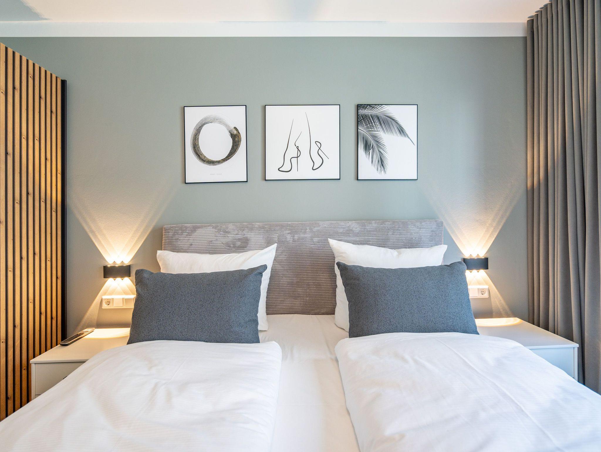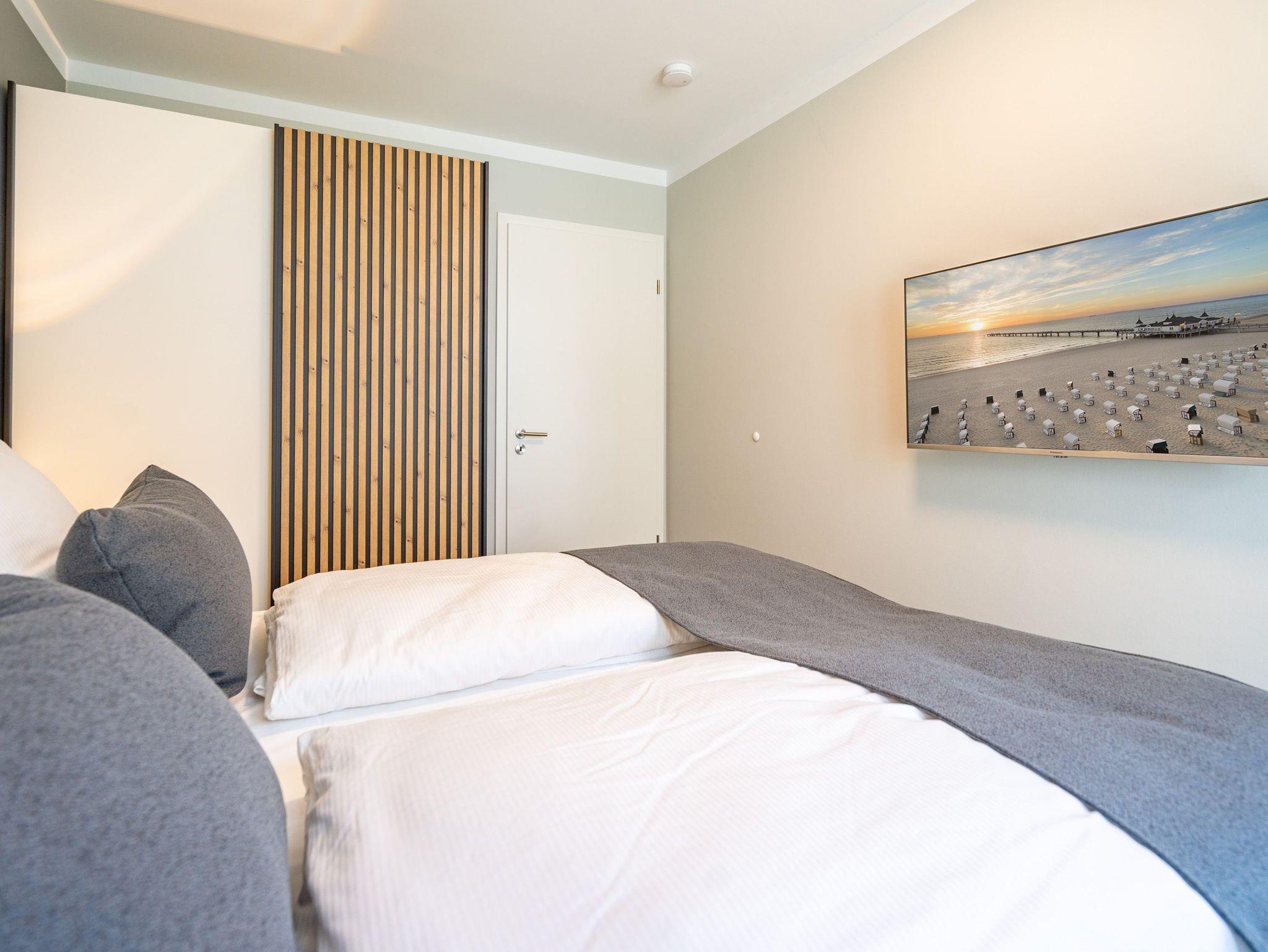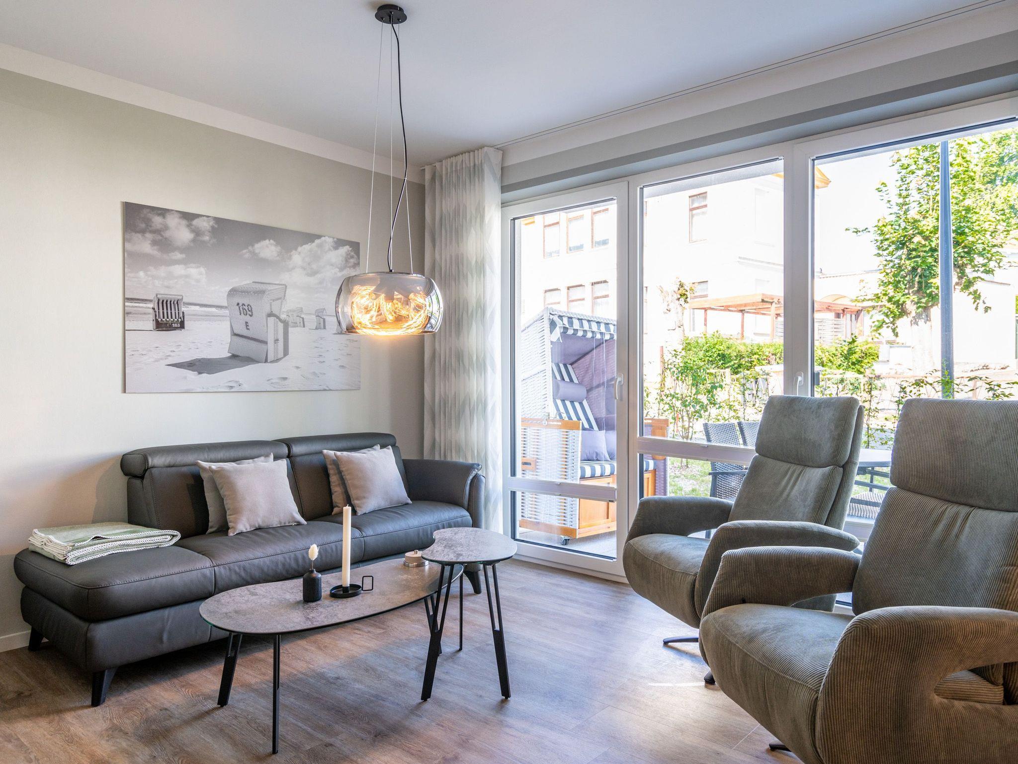 Herzlich willkommen in unserem 3-Raum-Appartement N° 1 im Erdgeschoss des Quartier 6! Auf 72 Quadratmetern bietet dieses gemütliche Domizil Platz für bis zu 4 Personen. Der offene Wohnbereich lädt mit einer voll ausgestatteten Küchenzeile, einem Essplatz für 4 Personen und einer gemütlichen Sitzgruppe zum Verweilen ein. Ein Flat-TV mit 50 Zoll und ein Gas-Kamin mit Fernbedienung sorgen für entspannte Abende. Von hier aus haben Sie direkten Zugang zur Nord-West-Terrasse, die mit Gartenmöbeln und einem Strandkorb ausgestattet ist. Die beiden Schlafzimmer sind mit komfortablen Boxspringdoppelbetten (1,80 m x 2,00 m), Kleiderschränken und weiteren Flat-TVs ausgestattet und garantieren erholsamen Schlaf. Für Ihr Wohlbefinden sorgen zudem zwei moderne Duschbäder, eines davon mit einer Finnischen Sauna ? ideal für entspannte Stunden nach einem ereignisreichen Tag. Zu Ihrer Unterkunft gehört ein PKW-Stellplatz in der Tiefgarage sowie ein eigener Abstellraum für Fahrräder. Selbstverständlich steht Ihnen kostenfreies WLAN zur Verfügung, sodass Sie auch im Urlaub stets verbunden bleiben können. Wir freuen uns darauf, Sie in unserem Appartement willkommen zu heißen!