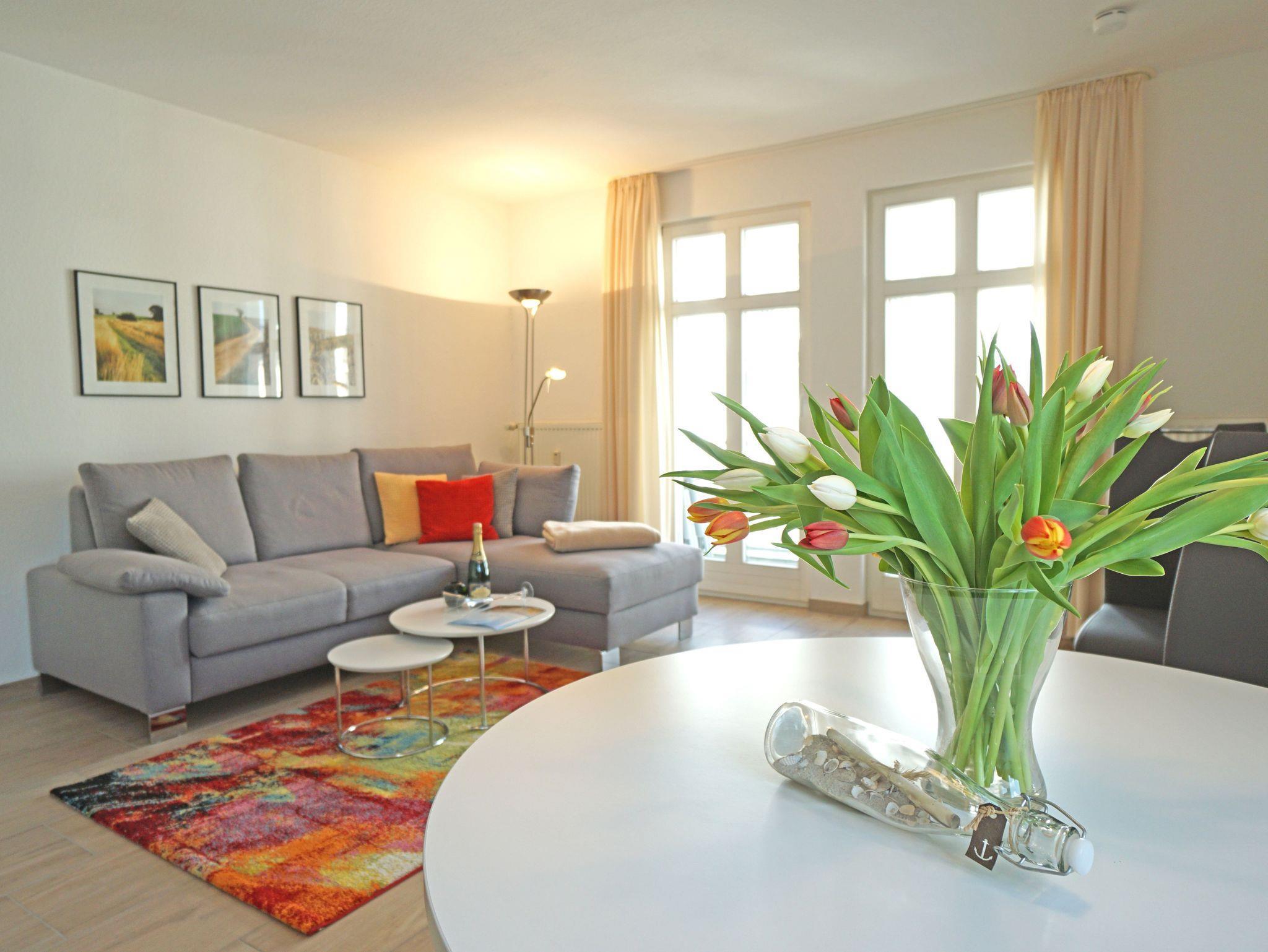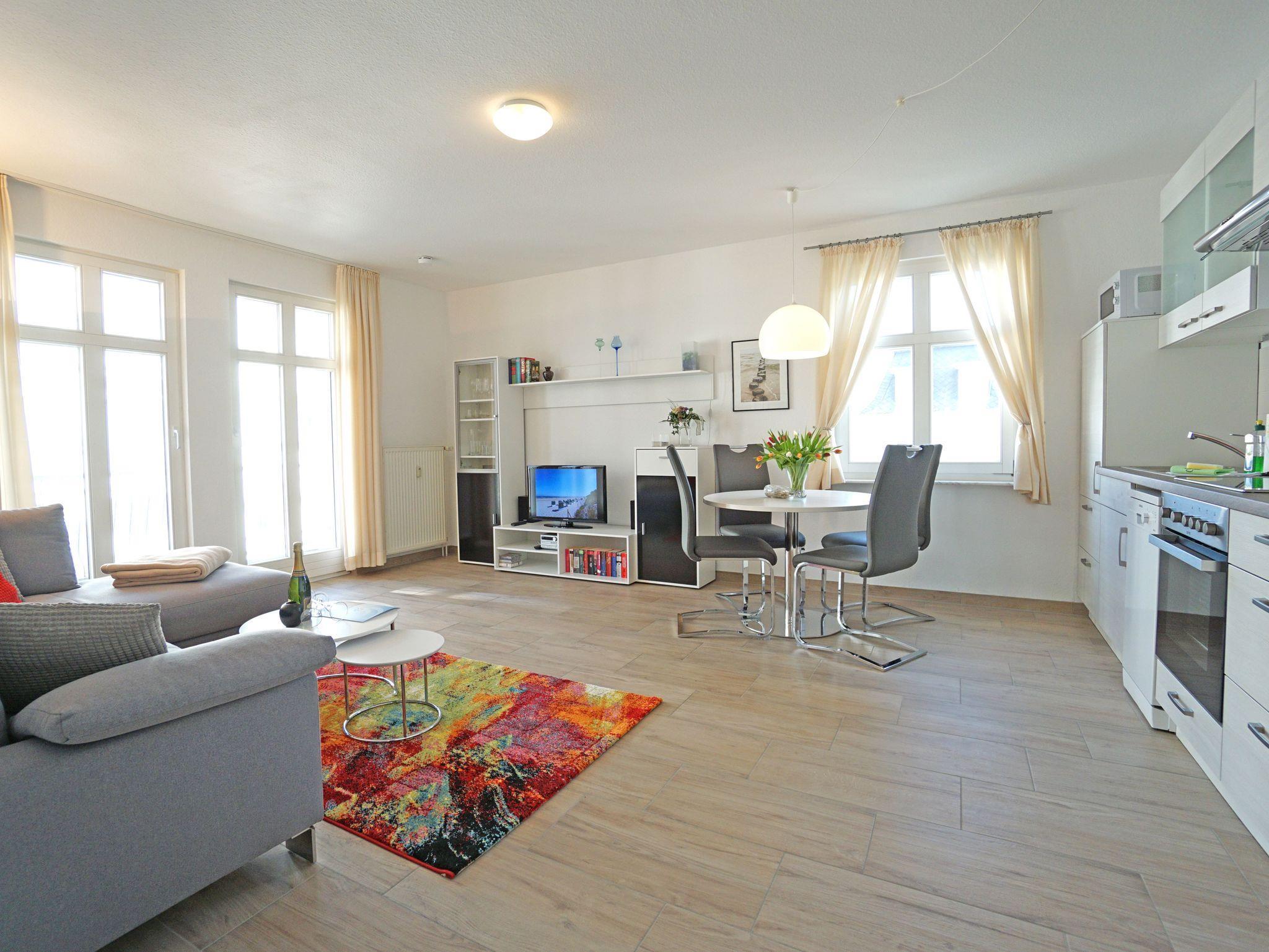 Im Wohnbereich befinden sich eine Couchecke, Couchtisch, Fernseher und Radio. Die offene Küche ist in den Wohnbereich integriert. Der möblierte Balkon schließt sich an den Wohnbereich an. Durch die nordöstliche Lage eignet er sich besonders gut für ein gemütliches Frühstück in der Morgensonne.