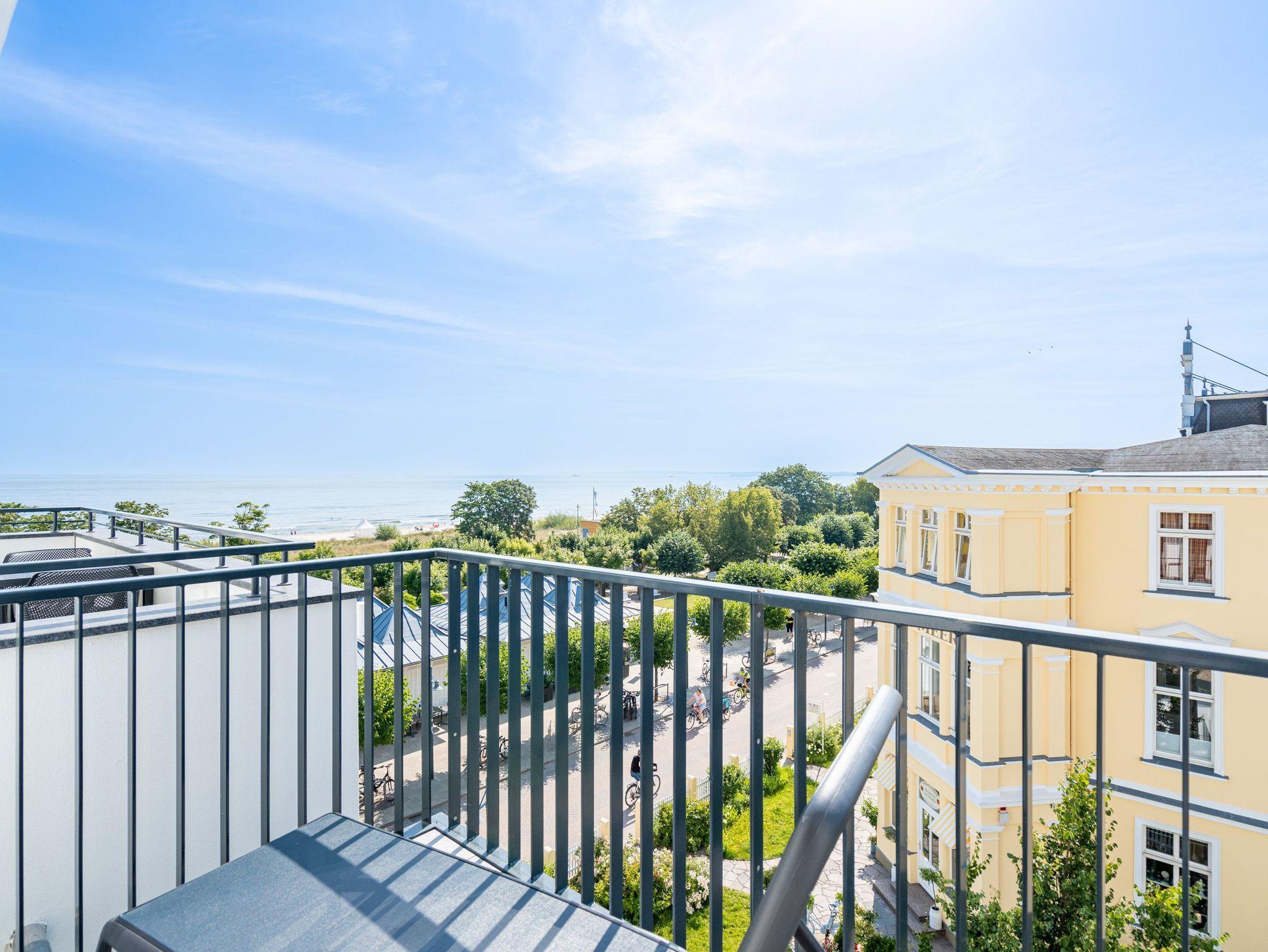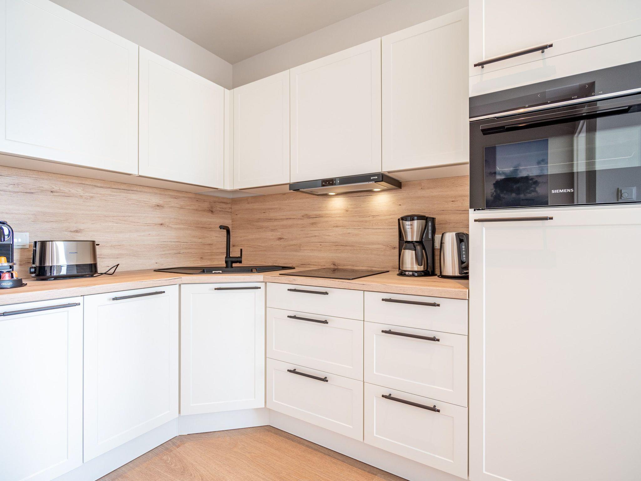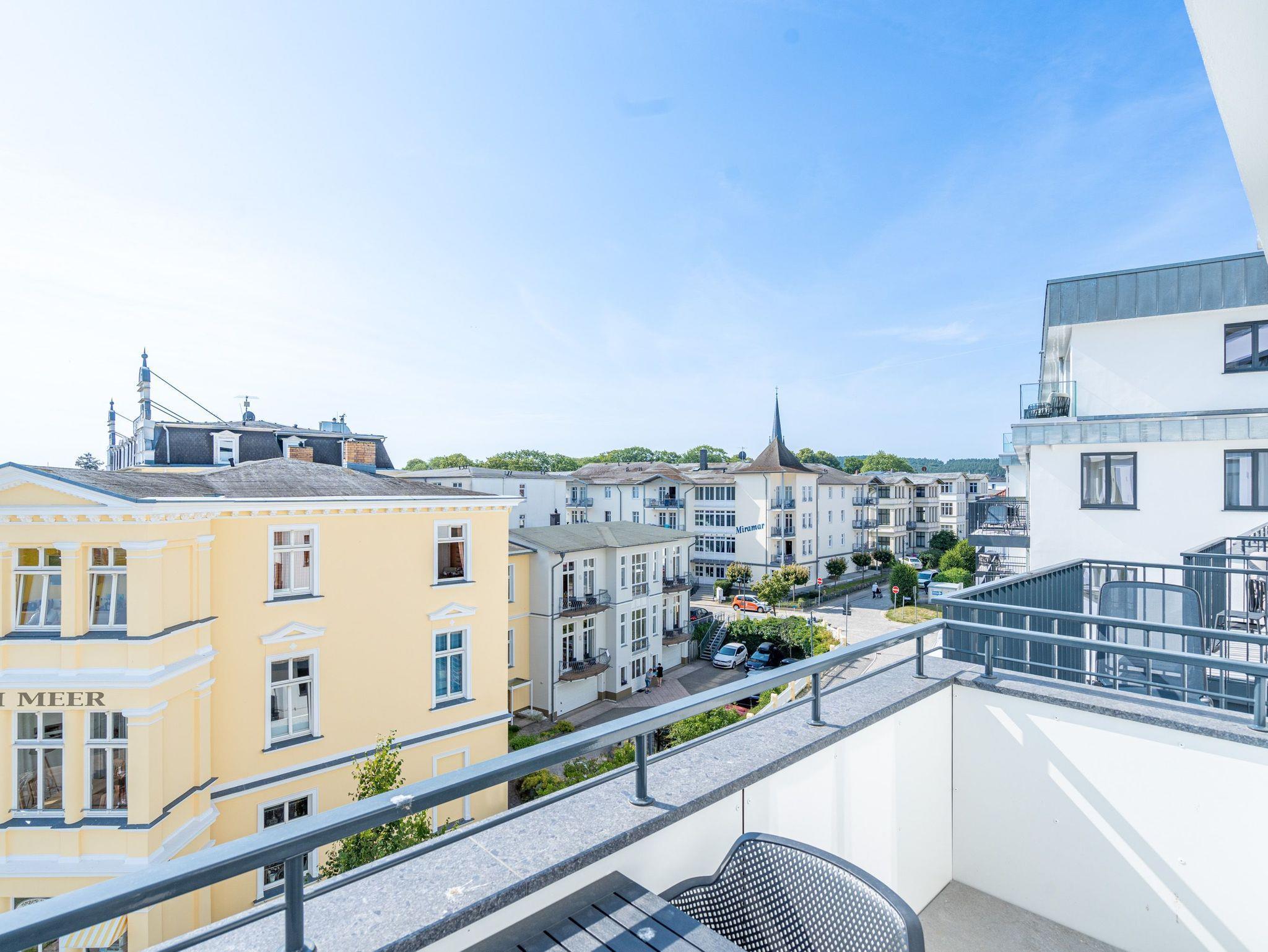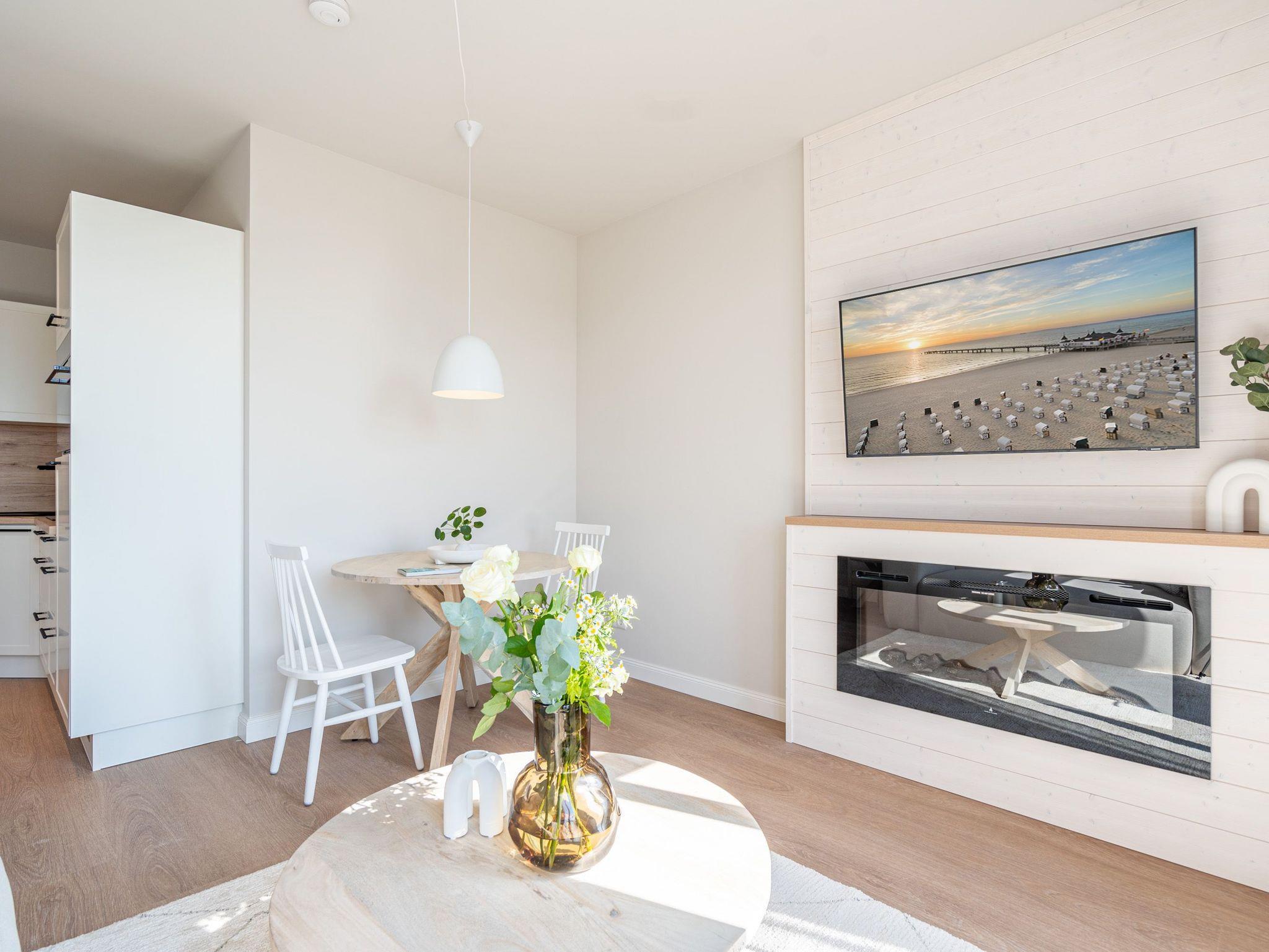 Willkommen im Strandterrasse - Appartement A 3.5 (Haus A). In dieser bezaubernden 2-Zimmer-Ferienwohnung in der 3. Etage werden sich bis zu zwei Gäste vom ersten Moment an pudelwohl fühlen. Denn die Einrichtung des 51 Quadratmeter großen Auszeitdomizils ist einfach zum Wohlfühlen gemacht. Dazu gibt es einen Meerblick, der atemberaubend ist. Der offene Wohnbereich ist nämlich direkt zur Ostsee hin ausgerichtet, so dass Sie aus den bodentiefen Fenstern das Wasser und das Wahrzeichen der Insel, die Ahlbecker Seebrücke, fast von allen Seiten sehen können. Das reicht Ihnen nicht? Dann treten Sie auf einen der beiden Balkone Richtung Osten hinaus und spüren die frische Ostseebrise wahrhaftig im Gesicht. Einen Balkon ? ausgestattet mit Tisch und zwei Stühlen ? können Sie vom Wohnzimmer aus betreten, den anderen von Ihrem Schlafzimmer aus. Hier lädt eine Gartenliege zum Sonnenbaden ein. Doch auch, wenn es einmal gar nicht nach draußen gehen soll, bietet das Appartement viel Gemütlichkeit. Machen Sie es sich auf der komfortablen Couch vor dem Elektrokamin (ohne Wärmeabgabe) oder dem 50-Zoll-Flachbildfernseher gemütlich. Die moderne Küchenecke ist voll ausgestattet und bietet mit einem Backofen, einem 3-Platten-Induktionskochfeld, einer Spülmaschine und einer Nespresso-Kapselmaschine allen Komfort, den man sich nur wünscht. Ein gemütlicher Essplatz lädt zu gemeinsamen Mahlzeiten ein. Das angrenzende Schlafzimmer lädt mit seinem bequemen Boxspringdoppelbett (1,80m x 2,00m) zu kuscheligen Stunden und erholsamen Träumen ein. Im eigens angefertigten Kleiderschrank und einer geräumigen Kommode ist viel Platz für die Urlaubsgarderobe. Auch aus dem Bett heraus ist Entertainment auf einem 43-Zoll-Flachbildfernseher möglich. Das Bad ist mit Dusche, Waschtisch und WC Ihre ganz persönliche Frischeoase. In der Tiefgarage steht Ihnen ein reservierter PKW-Stellplatz zur Verfügung. Kommen Sie also in aller Ruhe an und vergessen in diesem charmanten Appartement für ein paar Tage die Hektik der Welt.