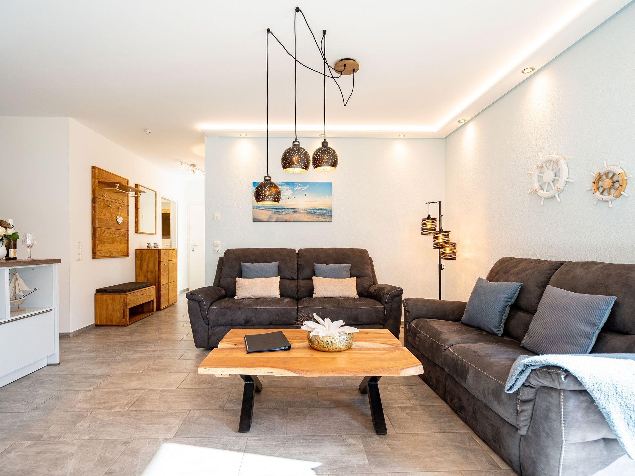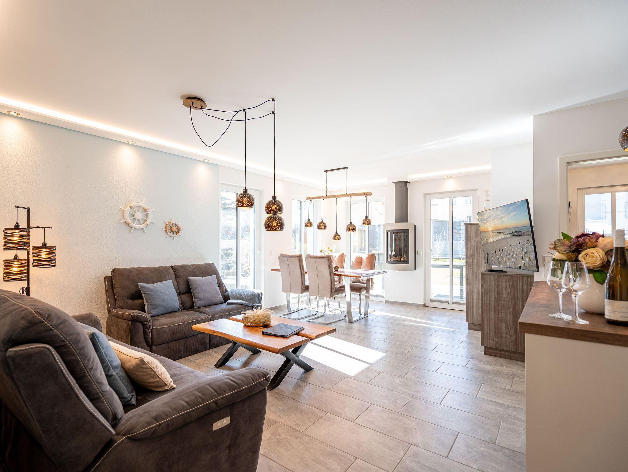 Ein gemütliches Raumkonzept und liebevoll eingerichtete Zimmer erwarten Sie im Appartement 06 im Domizil Meerzeit. Die 76qm, aufgeteilt in 3-Zimmer, eignen sich hervorragend für Familien oder befreundete Paare, die neben Ruhe und Entspannung den Charme der Kaiserbäder erleben wollen. Der offene Wohn-Essbereich ist mit zwei elektrisch verstellbaren Sofas ausgestattet. Der großzügige Zoll Flat-TV sorgt für entsprechende Unterhaltung in den Abendstunden. Ein besonderes Highlight des Appartements ist der hängende Gaskamin, den Sie bequem mit der Fernbedienung steuern können. Genießen Sie seine wohlige Wärme, ob auf dem Sofa oder beim Beisammensein am Essplatz . Die schlichte Küche ist mit neuesten Elektrogeräten (Induktionskochfeld, Backofen, Mikrowelle, Spülmaschine, Kühlschrank) ausgestattet und lässt keine Wünsche beim Zubereiten Ihrer Speisen offen. Touchbedienung und die im Herd integrierte Dunstabzugshaube runden die Exklusivität des Kochbereiches ab. Dank der Boxspringbetten (1,80m x 2,00m) in beiden Schlafzimmern müssen Sie auch in Ihrem Urlaub nicht auf Schlafkomfort verzichten. Geräumige Kleiderschränke und Flat-TVs runden die Ausstattung in den Schlafzimmern ab. Eine finnische Sauna im Masterbad lädt Sie besonders an kühlen Tagen ein Ihrem Körper etwas Gutes zu tun. Die Regendusche sorgt für die entsprechende Abkühlung im Anschluss. Einen LED-beleuchteten Waschtisch sowie einen beheizten Spiegel und ein WC finden Sie ebenso im Hauptbad. Das vollwertige zweite Badezimmer verfügt ebenfalls über eine Regendusche, einen Waschtisch und ein WC. Bei richtiger Windrichtung und entsprechendem Wellengang können Sie von Ihrer schönen Süd-Terrasse, die sowohl vom Wohnzimmer als auch vom Schlafzimmer begehbar ist, dem Rauschen der Ostsee zuhören. Kostenfreies W-Lan und ein Stellplatz in der hauseigenen Tiefgarage runden Ihren perfekten Urlaub auf der Insel Usedom ab.