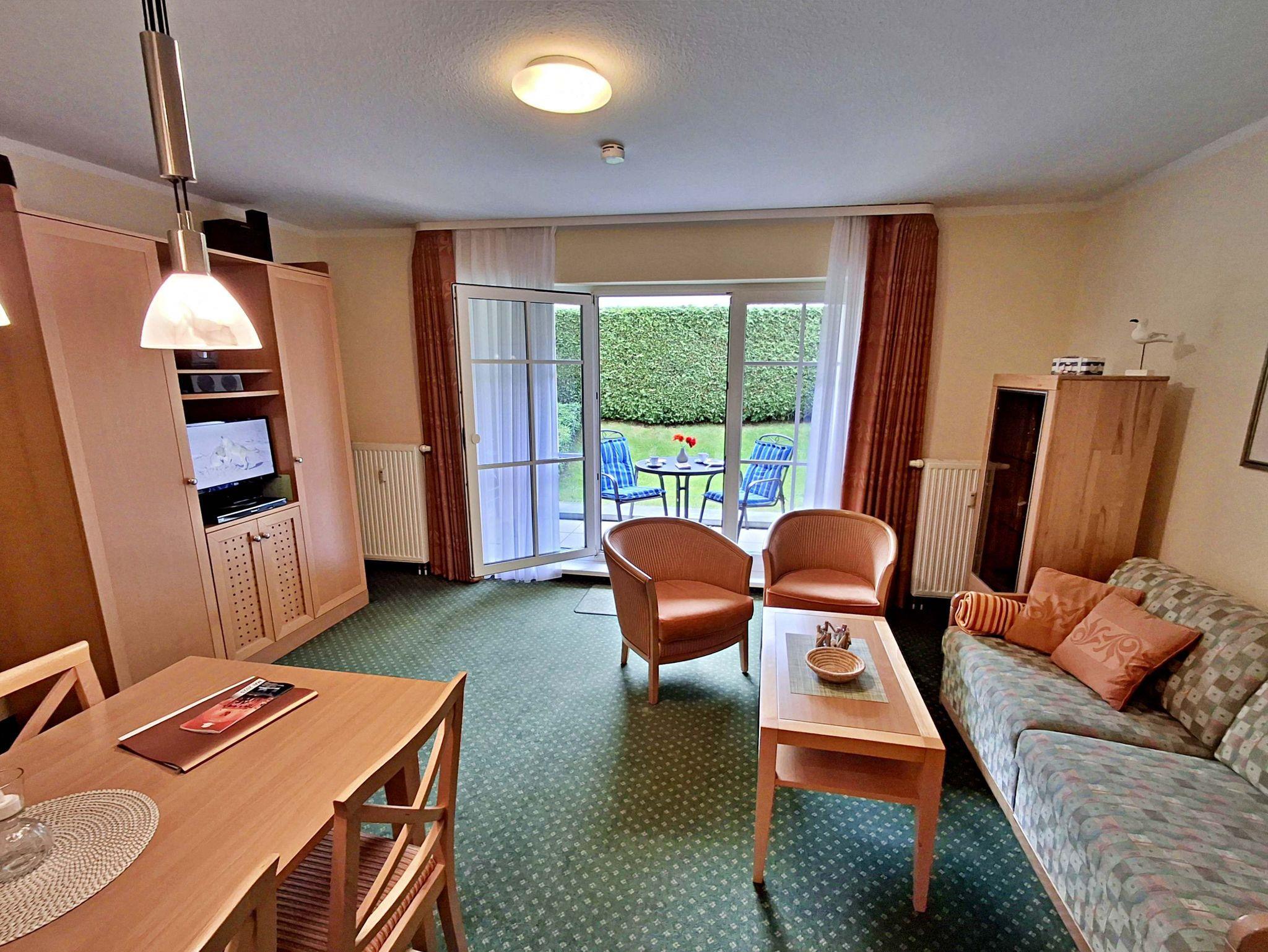 Die komfortabel ausgestattete Wohnung für bis zu 4 Personen (61 qm) erstreckt sich über zwei Etagen (EG und 1.OG). Dies trennt in angenehmer Weise Wohn- und Schlafbereich. Die Wohnung mit Südausrichtung verfügt im Erdgeschoss über ein Wohnzimmer mit Couch, welche auch zum Schlafen geeignet ist, eine Essecke mit 4 Stühlen sowie bequeme Sessel. Für die Unterhaltung sorgt ein Flachbild-TV und HiFi-Anlage. Die Die vollständig ausgestattete Küche mit Ceranherd mit Backofen, Geschirrspülmaschine, Mikrowelle, Kühlschrank mit Gefrierfach, Kaffeemaschine, Wasserkocher und Toaster lässt keine Wünsche offen. Vom Wohnzimmer besteht Zugang zur überdachten Terrasse (Loggia zum Innenhof). Über eine Wendeltreppe gelangen Sie in das 1. OG, wo sich auch das Schlafzimmer mit Doppelbett (2,20 m lang mit offenem Fußende) und zusätzlichem 55 LCD-TV, ein Abstellraum sowie das 2024 vollständig erneuerte Bad mit DU/WC und Kosmetikspiegel. Eine gemütliche Sitzmöglichkeit mit zwei Sesseln und kleinem Tisch komplettiert die Ausstattung der Wohnung. Zusätzlich ist im 1. OG ein zweiter Eingang eingebaut worden, um leichter aus dem großen Glastreppenhaus ins Obergeschoss zu gelangen. Das Internet (W-LAN) ist kostenfrei nutzbar. Ein Kinderbett mit Wäsche (im Elternschlafzimmer) sowie ein Hochstuhl können auf Anfrage gegen eine Gebühr von einmalig 50 € vom Verwalter zur Verfügung gestellt werden.