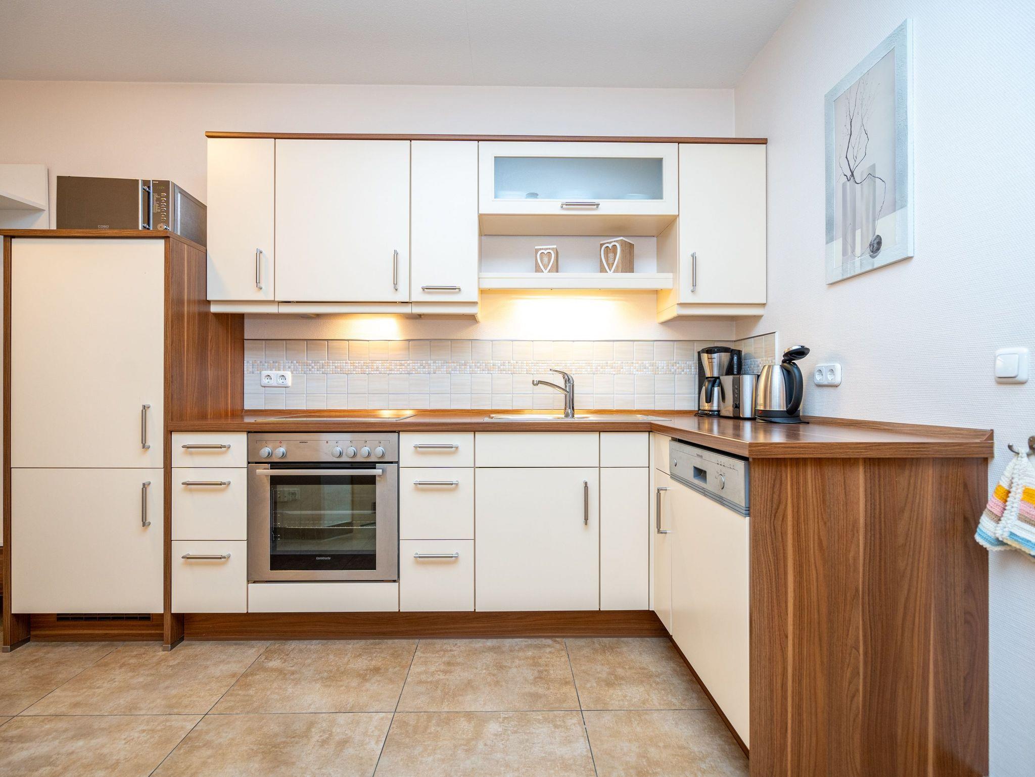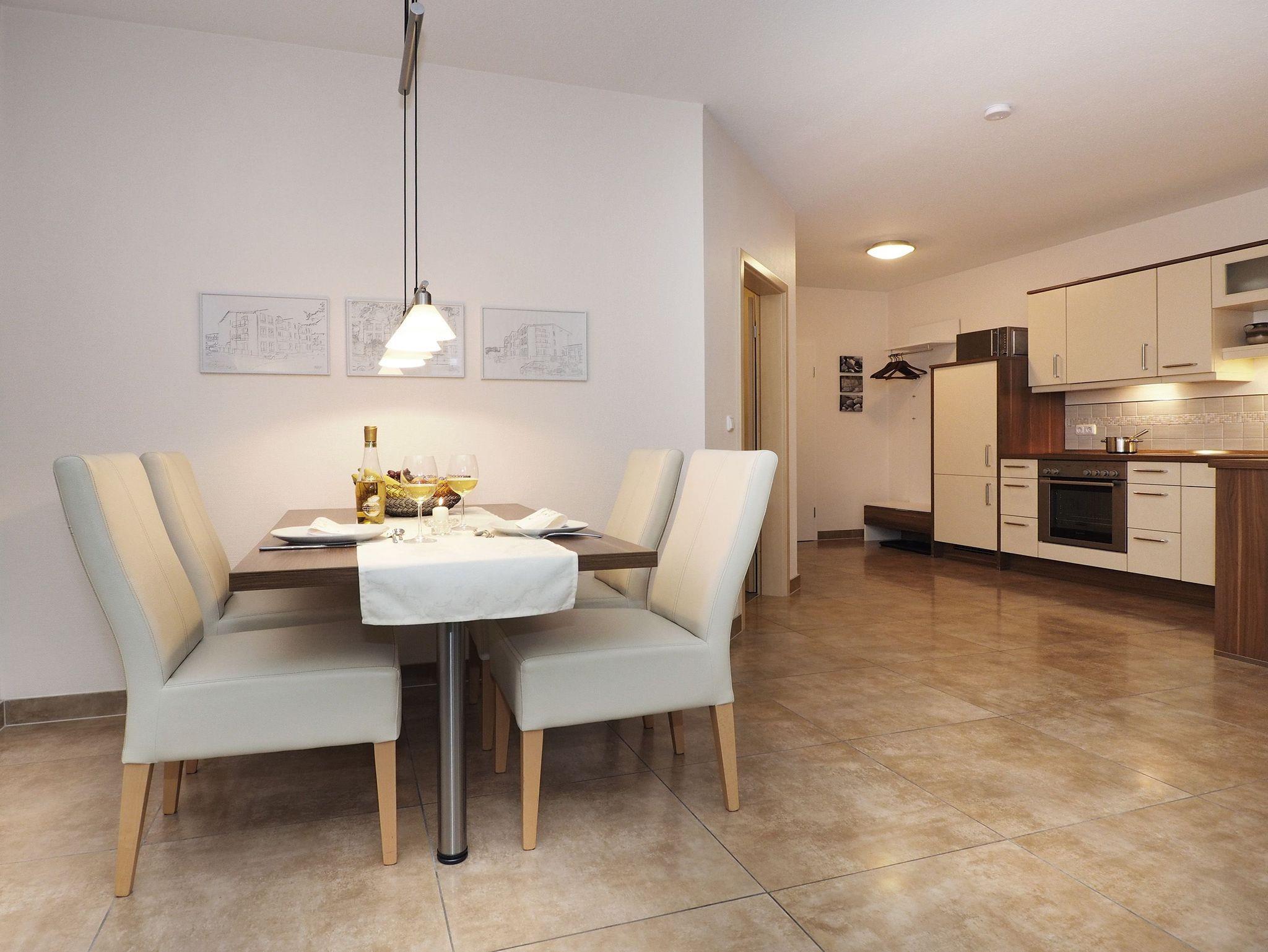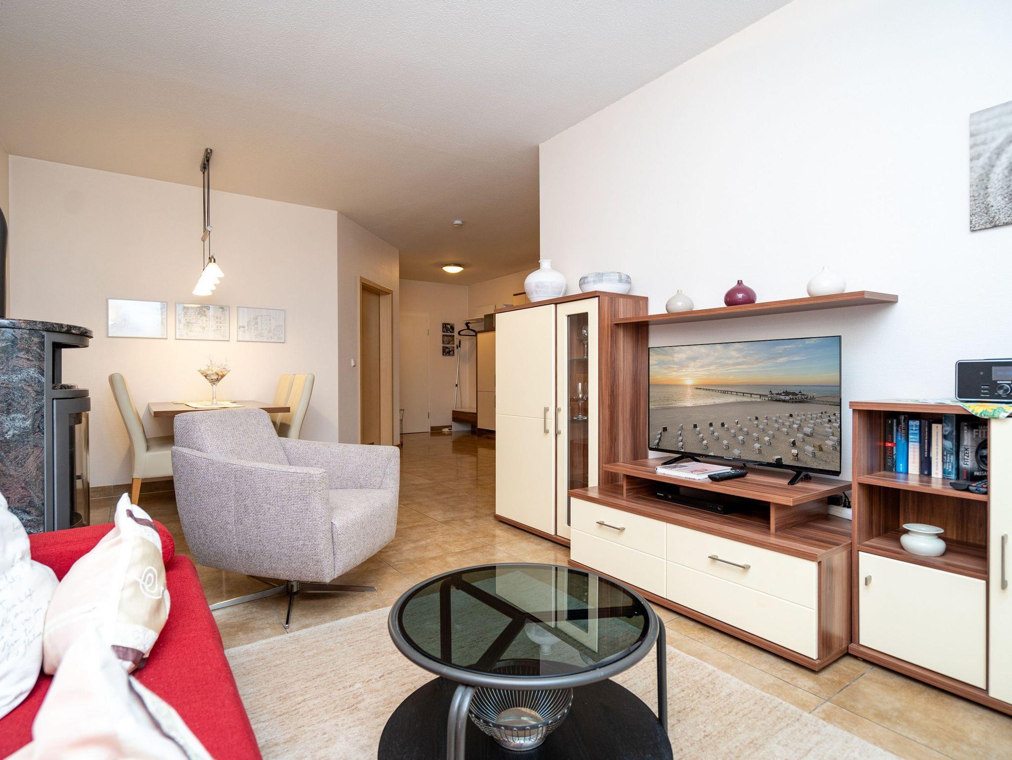 Das gemütliche Appartement 02 in der Weißen Düne bietet auf 47 qm ein stilvolles und komfortables Urlaubszuhause für 2 Personen. Es befindet sich im Hochparterre und besticht durch einen hellen, offenen Wohnbereich. Die voll ausgestattete Küchenzeile verfügt über alles, was Sie für die Zubereitung köstlicher Mahlzeiten benötigen: Backofen, Mikrowelle, 4-Platten-Cerankochfeld und einen Kühlschrank mit Gefrierfach. Der angrenzende Essplatz bietet Platz für 4 Personen, und die gemütliche Sitzgruppe lädt mit Kaminofen und Flat-TV zu entspannten Stunden ein. Vom Wohnbereich aus gelangen Sie direkt auf den sonnigen Süd-Ost-Balkon ? der perfekte Ort für ein Frühstück im Freien oder ein Glas Wein am Abend. Das Schlafzimmer ist mit einem komfortablen Doppelbett (1,80m x 2,00m), einem geräumigen Kleiderschrank und einem weiteren Flat-TV ausgestattet. Zur Anreise sind die Betten mit der Erstausstattung an Wäsche bereits bezogen, und frische Handtücher liegen für Sie bereit. Das moderne Badezimmer bietet eine Dusche, einen Waschtisch, WC und Bidet. Ein reservierter Außenstellplatz (Nr. 2) auf dem Hof sorgt für bequemes Parken, und kostenfreies WLAN steht Ihnen ebenfalls zur Verfügung. Zudem befindet sich im Haus ein Waschraum mit Waschmaschine und Trockner, die gegen eine Gebühr genutzt werden können. Genießen Sie Ihren Aufenthalt in dieser einladenden Ferienwohnung und erleben Sie erholsame Tage an der Ostsee.