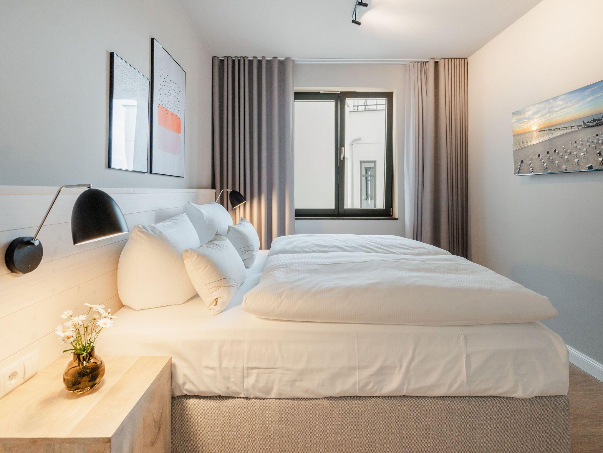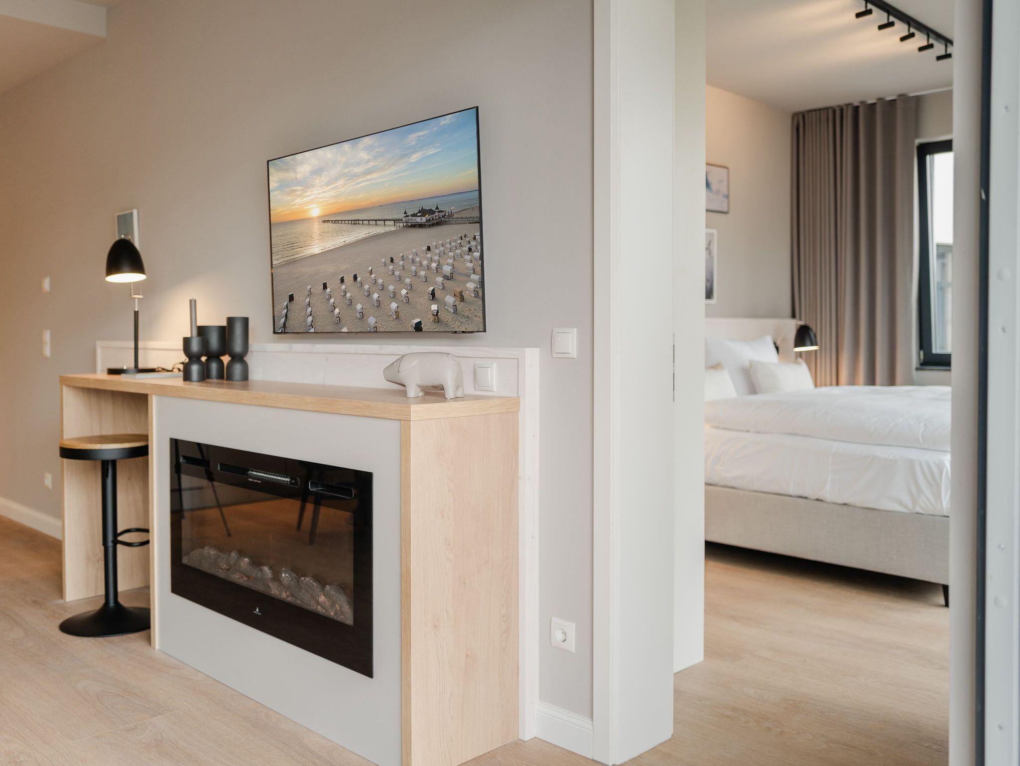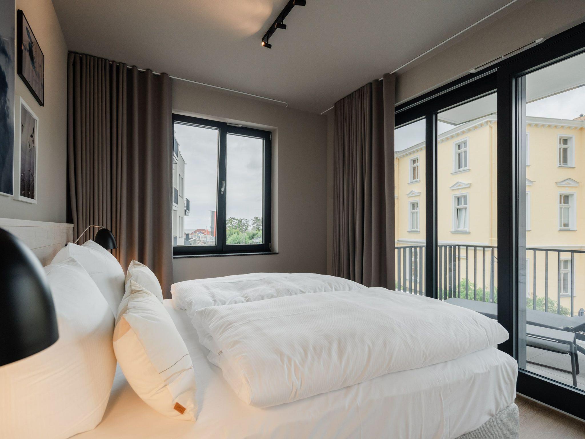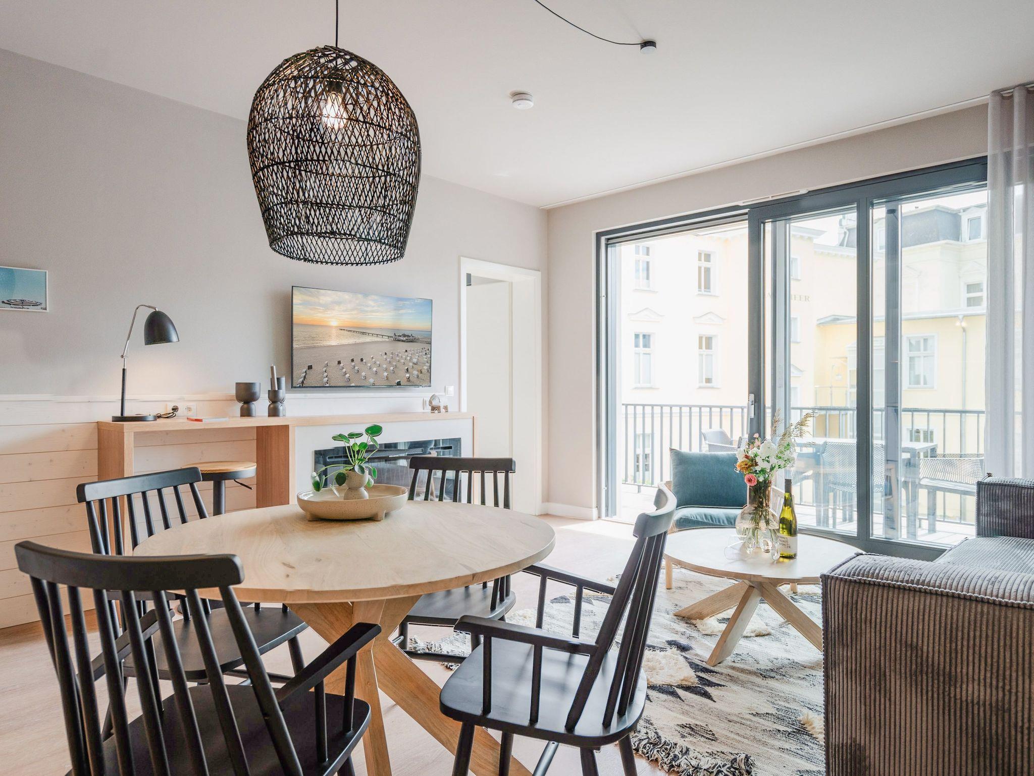 Eine lichtdurchflutete und großzügige 3-Raum-Wohnung erwartet Sie im Appartement B 1.2 in der 1. Etage der Strandterrasse im Haus B. Freuen Sie sich auf viel Gemütlichkeit und ein modernes Design. Die 78 Quadratmeter sind von unserer Inneneinrichterin mit viel Liebe und dem Händchen fürs nordisch Noble eingerichtet worden. Bis zu 4 Personen bietet das Appartement ein stilvolles Zuhause auf Zeit direkt an der Ostsee. Von gleich zwei Balkonen können Sie die frische Ostseebrise genießen und das Rauschen der Wellen vom nur 80 Meter entfernten Strand hören. Der geräumige Wohn-Essbereich ist mit einem schönen Esstisch und einem gemütlichen Sofa mit Sessel ausgestattet. Das elegante Grau kombiniert mit Weiß und den Farben der Ostsee sorgt für eine außergewöhnliche Designnote. Zum Wohnzimmer gehört eine offene Küche, die mit einem Backofen, einem 4-Platten-Induktionsherd und einer Nespresso-Kapselmaschine bestens bestückt ist. Hier macht das Zubereiten der Mahlzeiten Spaß. An einer kleinen Workingstation können Sie alles auf eine Karte schreiben, was Sie in Ihrer Auszeit erlebt haben. Ein nostalgisches Hobby, das zunehmend wieder in Mode kommt. Ein großer Flat-TV (50 Zoll) verwandelt das Wohnzimmer in ein privates Kino. Romantische Akzente setzt der Elektrokamin (ohne Wärmeabgabe). So kann man sich auch im Sommer im wunderbaren Flackern verlieren. Die beiden Balkone bieten einen seitlichen Ausblick Richtung Ostsee und sind mit einem Gartentisch, 4 Stühlen und einer Gartenliege ausgestattet. Das Wohnzimmer hat einen Zugang und eines der beiden Schlafzimmer hat einen weiteren Zugang zu den Balkonen. Beiden Schlafzimmern gleichermaßen eigen ist ein bequemes Boxspringdoppelbett (1,80m x 2,00m) und ein Kleiderschrank. Ein Schlafzimmer verfügt über einen 43 Zoll Flat-TV, das zweite Schlafzimmer über einen 32 Zoll Flat-TV. Ihr Domizil besitzt zwei moderne Duschbäder mit Waschtisch und WC. In einem Bad befindet sich eine Infrarotsaunakabine für entspannende Auszeitmomente. Zu dem Appartement gehört in der Tiefgarage ein PKW-Stellplatz. Nun müssen Sie nur noch heil und gesund in ihrer Unterkunft ankommen und der Urlaub kann beginnen. Meer geht eben immer!