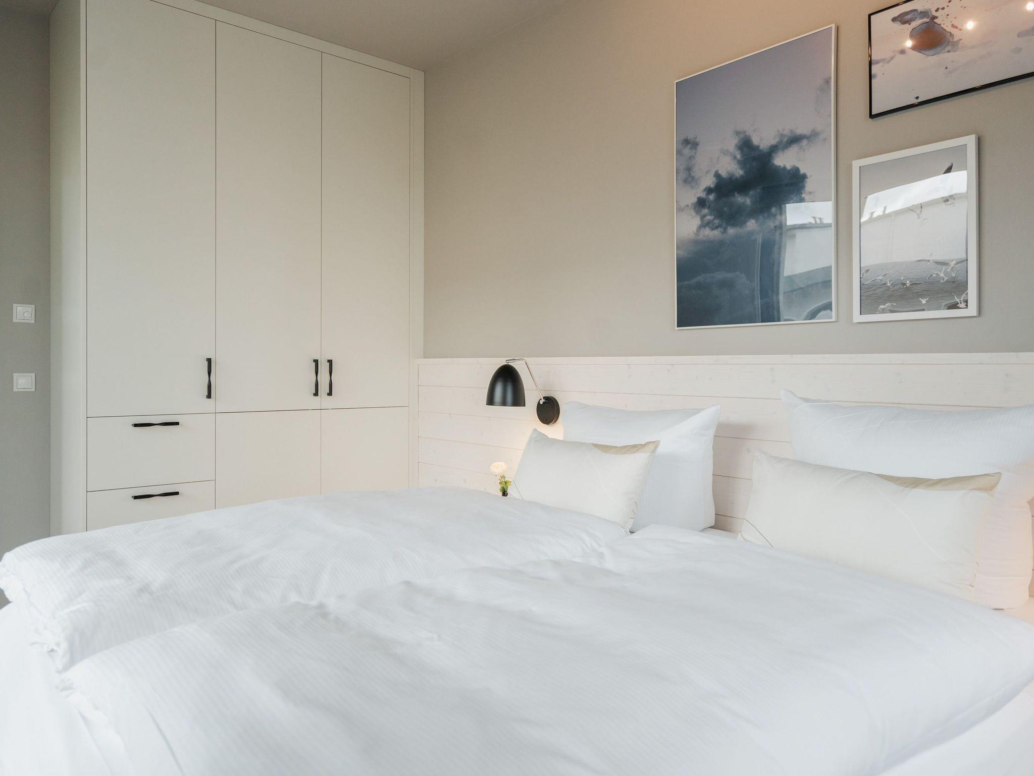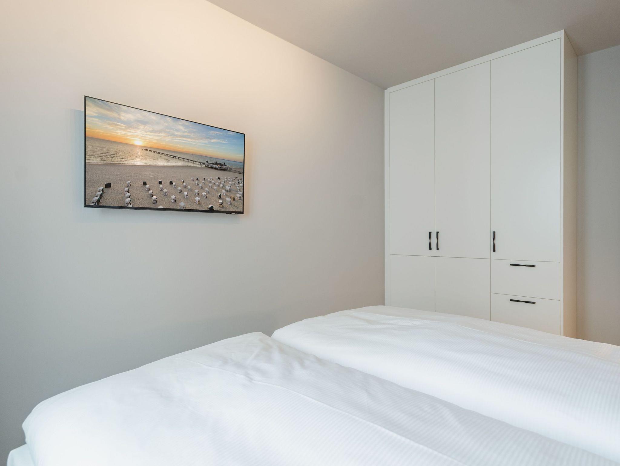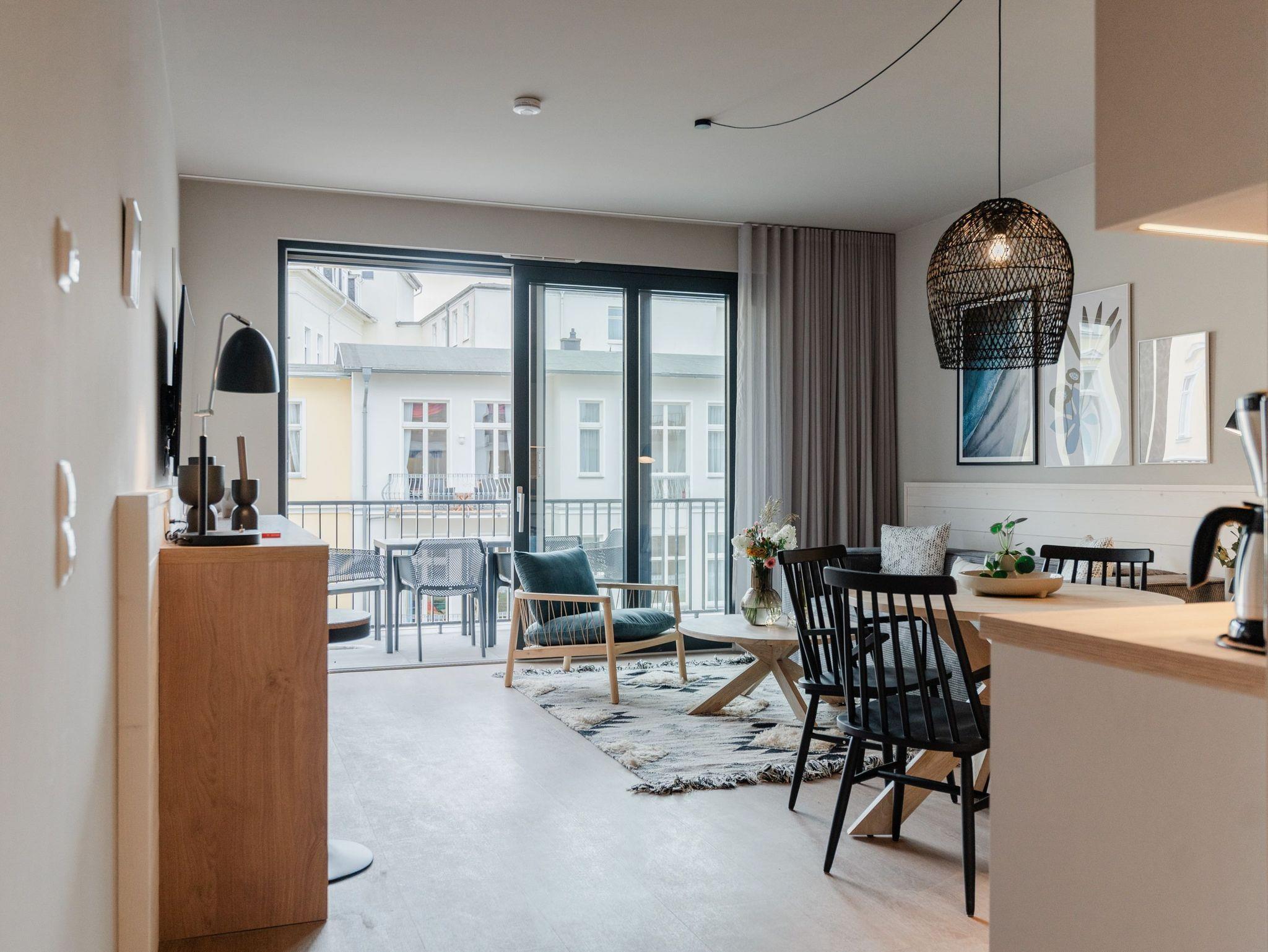 Eine lichtdurchflutete und großzügige 3-Raum-Wohnung erwartet Sie im Appartement B 1.2 in der 1. Etage der Strandterrasse im Haus B. Freuen Sie sich auf viel Gemütlichkeit und ein modernes Design. Die 78 Quadratmeter sind von unserer Inneneinrichterin mit viel Liebe und dem Händchen fürs nordisch Noble eingerichtet worden. Bis zu 4 Personen bietet das Appartement ein stilvolles Zuhause auf Zeit direkt an der Ostsee. Von gleich zwei Balkonen können Sie die frische Ostseebrise genießen und das Rauschen der Wellen vom nur 80 Meter entfernten Strand hören. Der geräumige Wohn-Essbereich ist mit einem schönen Esstisch und einem gemütlichen Sofa mit Sessel ausgestattet. Das elegante Grau kombiniert mit Weiß und den Farben der Ostsee sorgt für eine außergewöhnliche Designnote. Zum Wohnzimmer gehört eine offene Küche, die mit einem Backofen, einem 4-Platten-Induktionsherd und einer Nespresso-Kapselmaschine bestens bestückt ist. Hier macht das Zubereiten der Mahlzeiten Spaß. An einer kleinen Workingstation können Sie alles auf eine Karte schreiben, was Sie in Ihrer Auszeit erlebt haben. Ein nostalgisches Hobby, das zunehmend wieder in Mode kommt. Ein großer Flat-TV (50 Zoll) verwandelt das Wohnzimmer in ein privates Kino. Romantische Akzente setzt der Elektrokamin (ohne Wärmeabgabe). So kann man sich auch im Sommer im wunderbaren Flackern verlieren. Die beiden Balkone bieten einen seitlichen Ausblick Richtung Ostsee und sind mit einem Gartentisch, 4 Stühlen und einer Gartenliege ausgestattet. Das Wohnzimmer hat einen Zugang und eines der beiden Schlafzimmer hat einen weiteren Zugang zu den Balkonen. Beiden Schlafzimmern gleichermaßen eigen ist ein bequemes Boxspringdoppelbett (1,80m x 2,00m) und ein Kleiderschrank. Ein Schlafzimmer verfügt über einen 43 Zoll Flat-TV, das zweite Schlafzimmer über einen 32 Zoll Flat-TV. Ihr Domizil besitzt zwei moderne Duschbäder mit Waschtisch und WC. In einem Bad befindet sich eine Infrarotsaunakabine für entspannende Auszeitmomente. Zu dem Appartement gehört in der Tiefgarage ein PKW-Stellplatz. Nun müssen Sie nur noch heil und gesund in ihrer Unterkunft ankommen und der Urlaub kann beginnen. Meer geht eben immer!