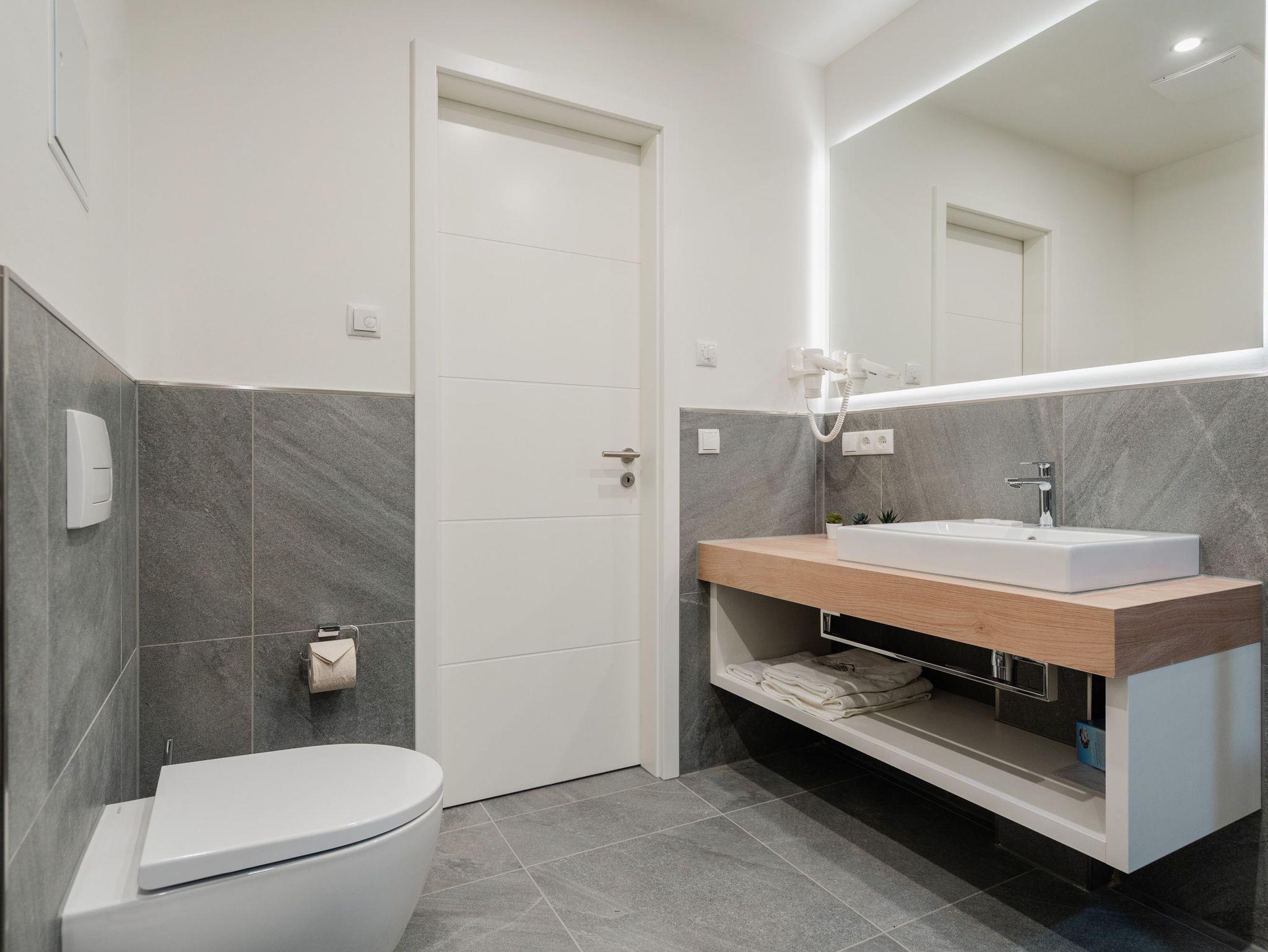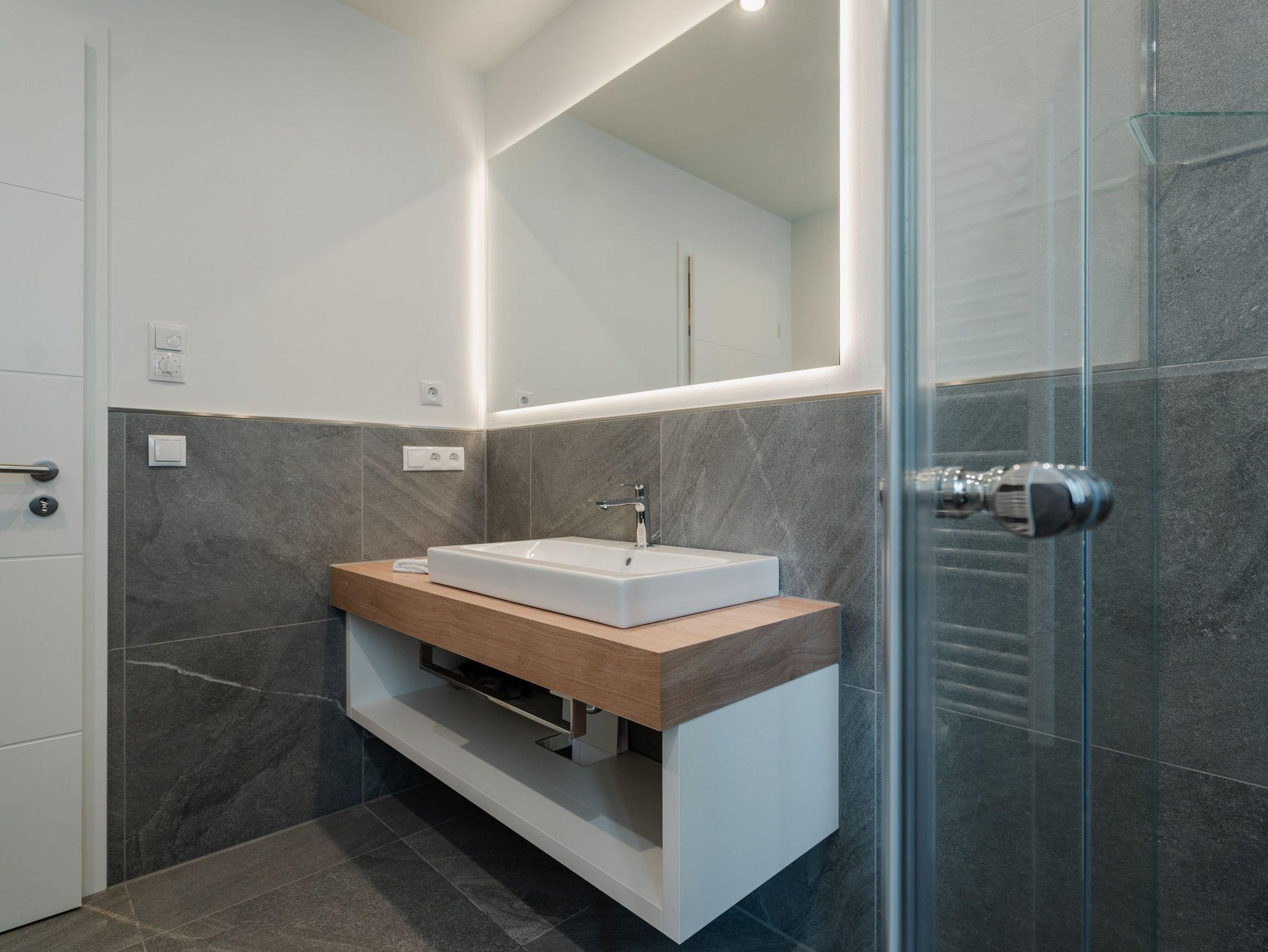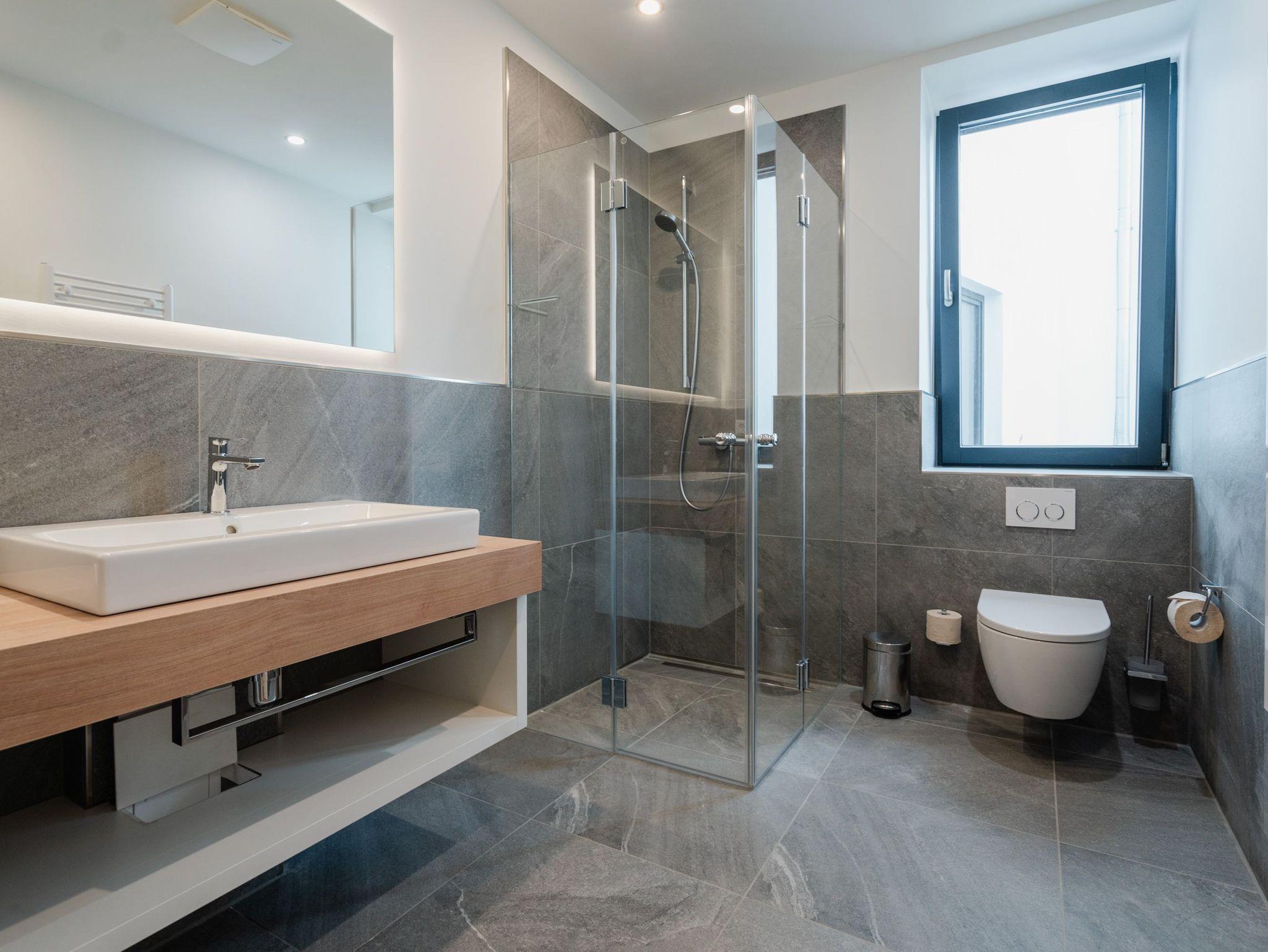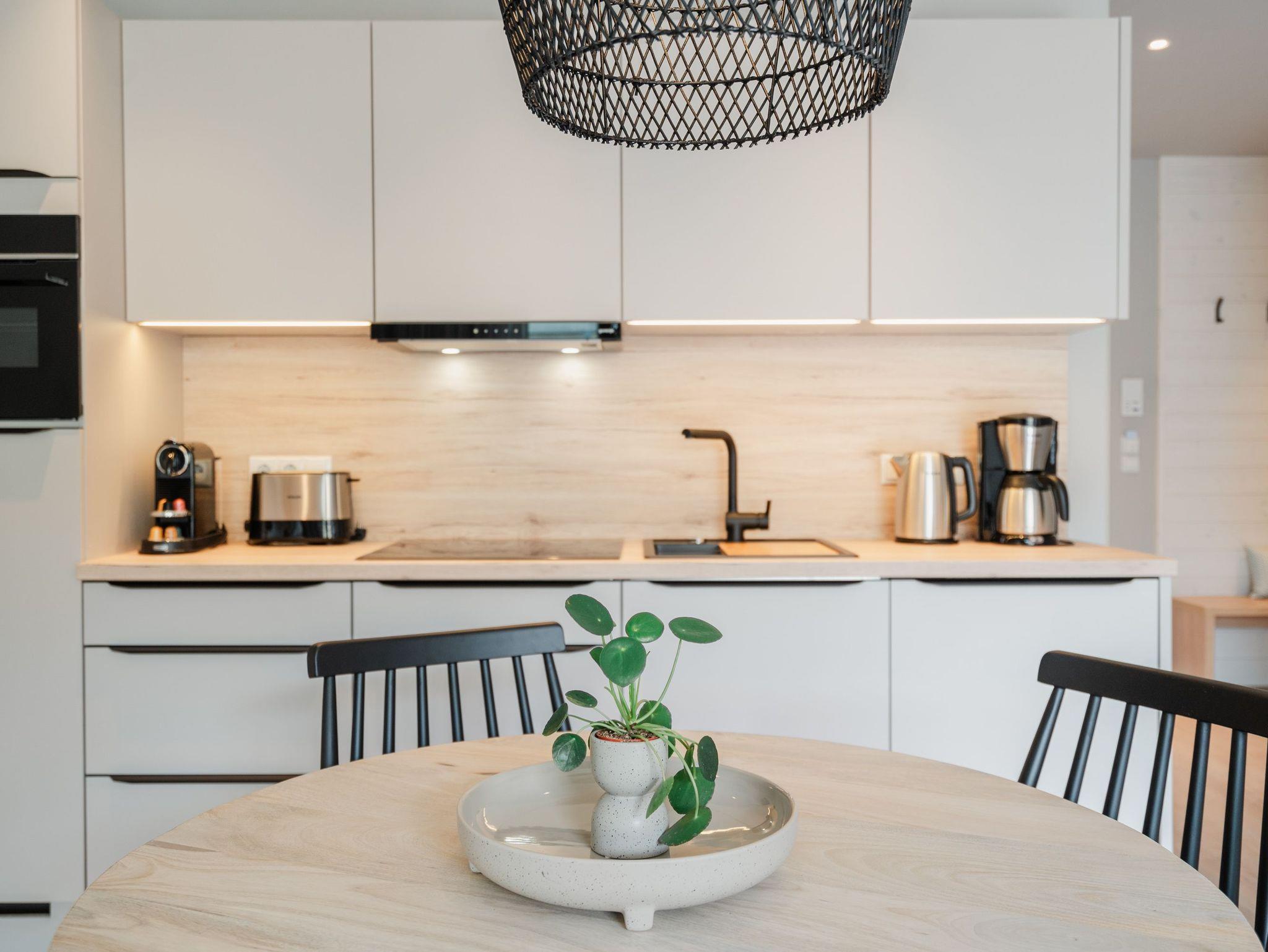 Eine lichtdurchflutete und großzügige 3-Raum-Wohnung erwartet Sie im Appartement B 1.2 in der 1. Etage der Strandterrasse im Haus B. Freuen Sie sich auf viel Gemütlichkeit und ein modernes Design. Die 78 Quadratmeter sind von unserer Inneneinrichterin mit viel Liebe und dem Händchen fürs nordisch Noble eingerichtet worden. Bis zu 4 Personen bietet das Appartement ein stilvolles Zuhause auf Zeit direkt an der Ostsee. Von gleich zwei Balkonen können Sie die frische Ostseebrise genießen und das Rauschen der Wellen vom nur 80 Meter entfernten Strand hören. Der geräumige Wohn-Essbereich ist mit einem schönen Esstisch und einem gemütlichen Sofa mit Sessel ausgestattet. Das elegante Grau kombiniert mit Weiß und den Farben der Ostsee sorgt für eine außergewöhnliche Designnote. Zum Wohnzimmer gehört eine offene Küche, die mit einem Backofen, einem 4-Platten-Induktionsherd und einer Nespresso-Kapselmaschine bestens bestückt ist. Hier macht das Zubereiten der Mahlzeiten Spaß. An einer kleinen Workingstation können Sie alles auf eine Karte schreiben, was Sie in Ihrer Auszeit erlebt haben. Ein nostalgisches Hobby, das zunehmend wieder in Mode kommt. Ein großer Flat-TV (50 Zoll) verwandelt das Wohnzimmer in ein privates Kino. Romantische Akzente setzt der Elektrokamin (ohne Wärmeabgabe). So kann man sich auch im Sommer im wunderbaren Flackern verlieren. Die beiden Balkone bieten einen seitlichen Ausblick Richtung Ostsee und sind mit einem Gartentisch, 4 Stühlen und einer Gartenliege ausgestattet. Das Wohnzimmer hat einen Zugang und eines der beiden Schlafzimmer hat einen weiteren Zugang zu den Balkonen. Beiden Schlafzimmern gleichermaßen eigen ist ein bequemes Boxspringdoppelbett (1,80m x 2,00m) und ein Kleiderschrank. Ein Schlafzimmer verfügt über einen 43 Zoll Flat-TV, das zweite Schlafzimmer über einen 32 Zoll Flat-TV. Ihr Domizil besitzt zwei moderne Duschbäder mit Waschtisch und WC. In einem Bad befindet sich eine Infrarotsaunakabine für entspannende Auszeitmomente. Zu dem Appartement gehört in der Tiefgarage ein PKW-Stellplatz. Nun müssen Sie nur noch heil und gesund in ihrer Unterkunft ankommen und der Urlaub kann beginnen. Meer geht eben immer!