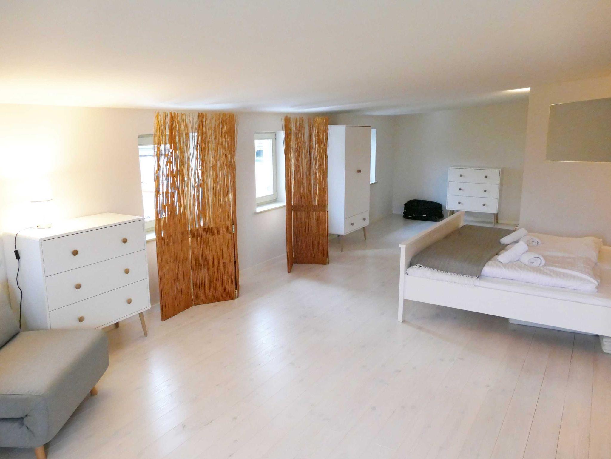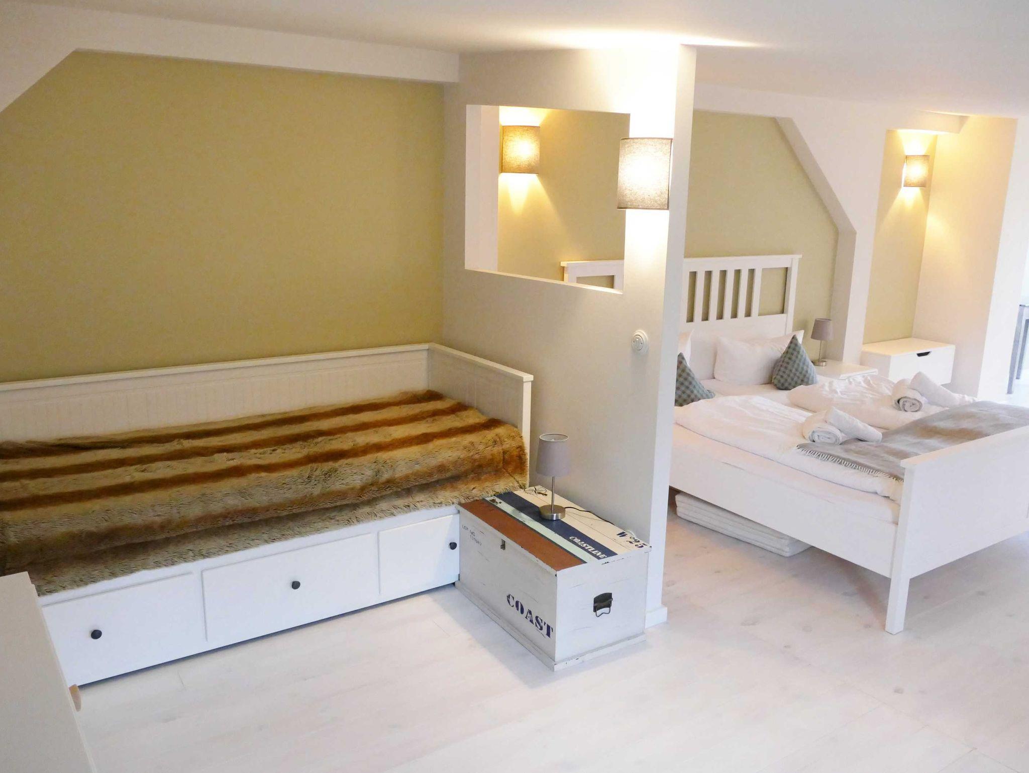 Über eine Treppe erreichen Sie den offenen Schlafbereich mit Doppelbett und Einzelbett.