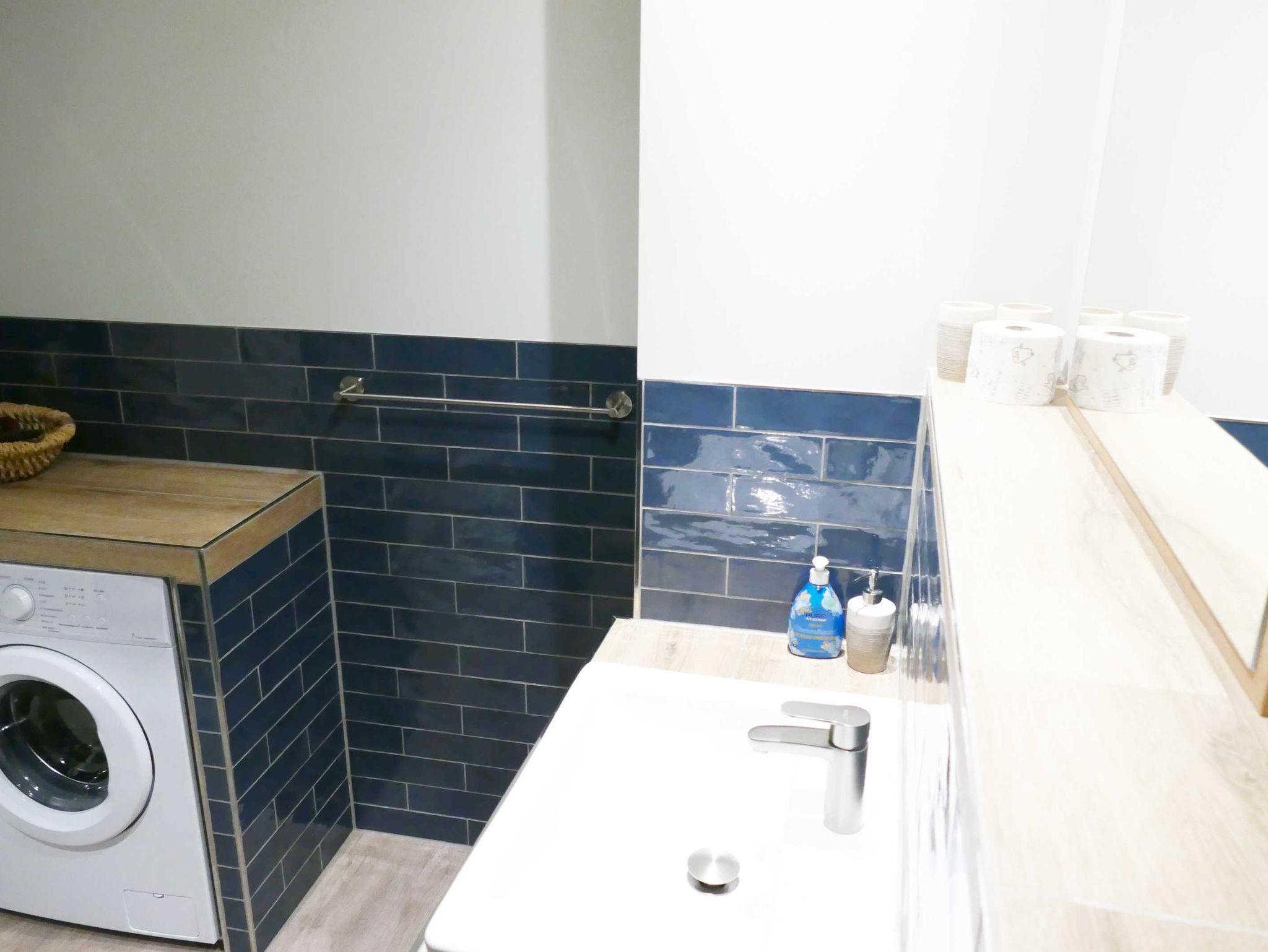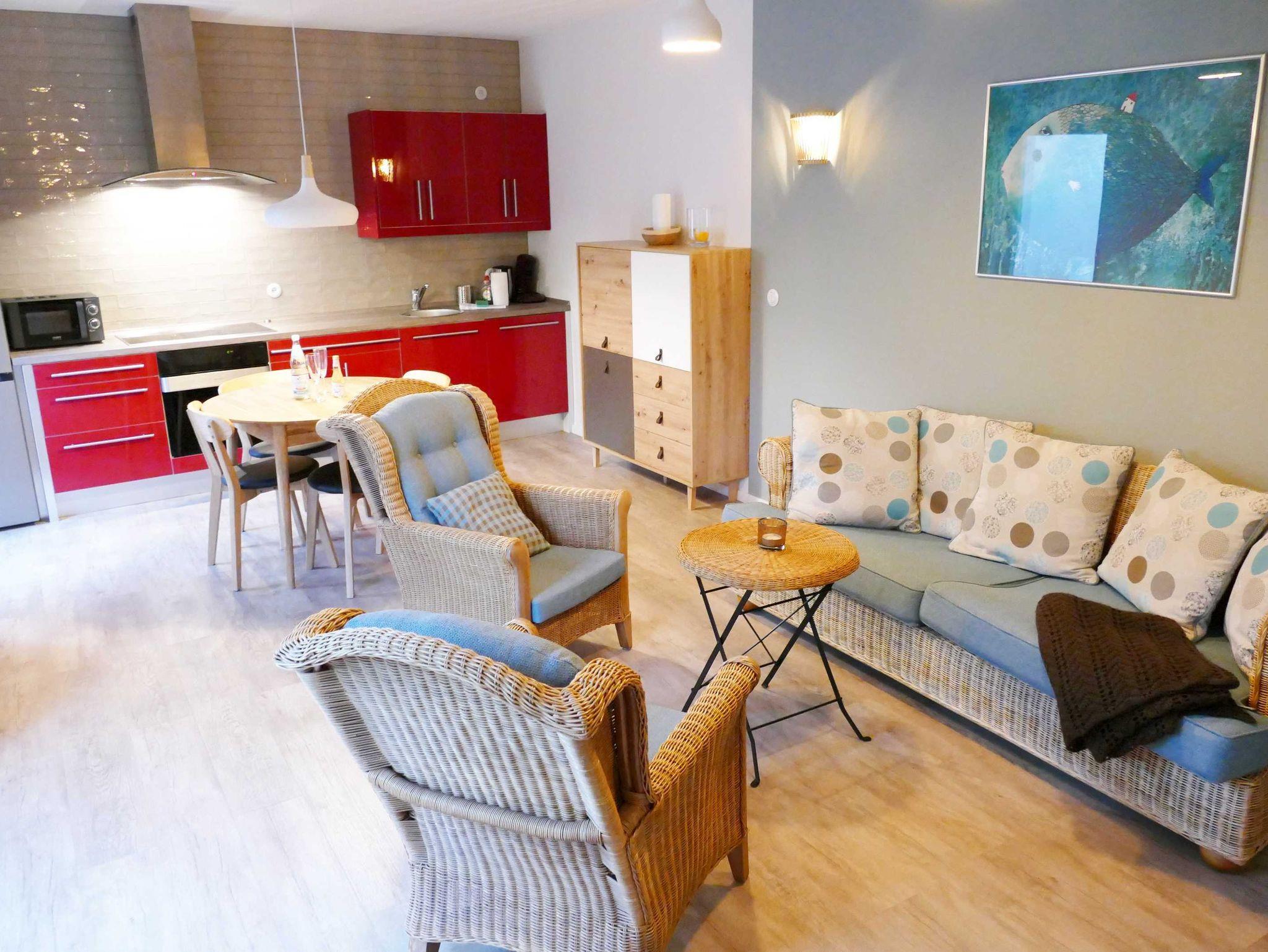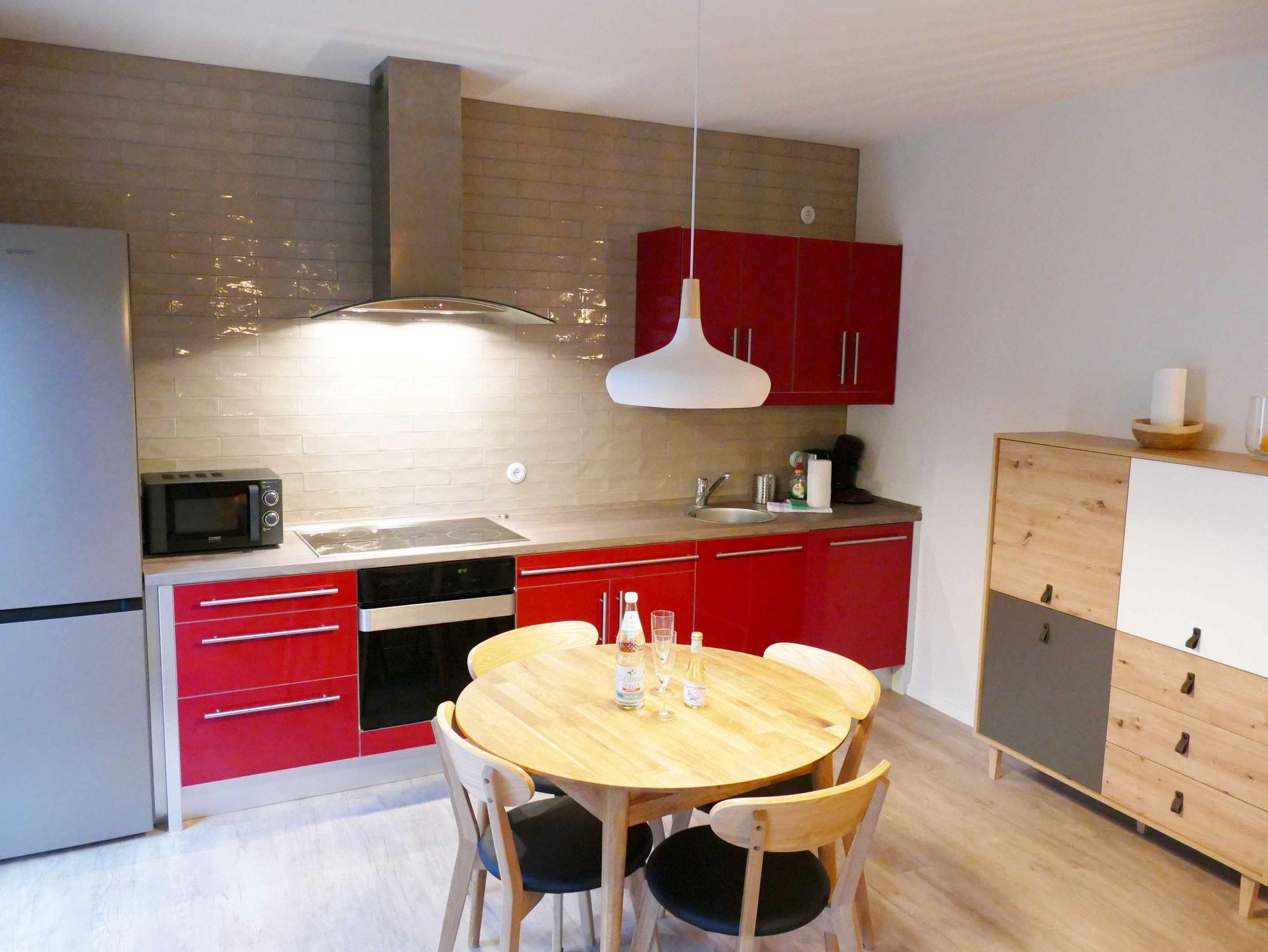 Die Wohnung verfügt im Erdgeschoss über ein großzügiges Wohnzimmer mit Couchecke und offener Küchenzeile mit Kücheninsel. Die Küche ist ausgestattet mit einem 4 Plattenherd, Backofen, Kühlschrank und Spülmaschine. Ein Bad mit ebenerdiger Dusche und WC befindet sich ebenfalls im Erdgeschoss.