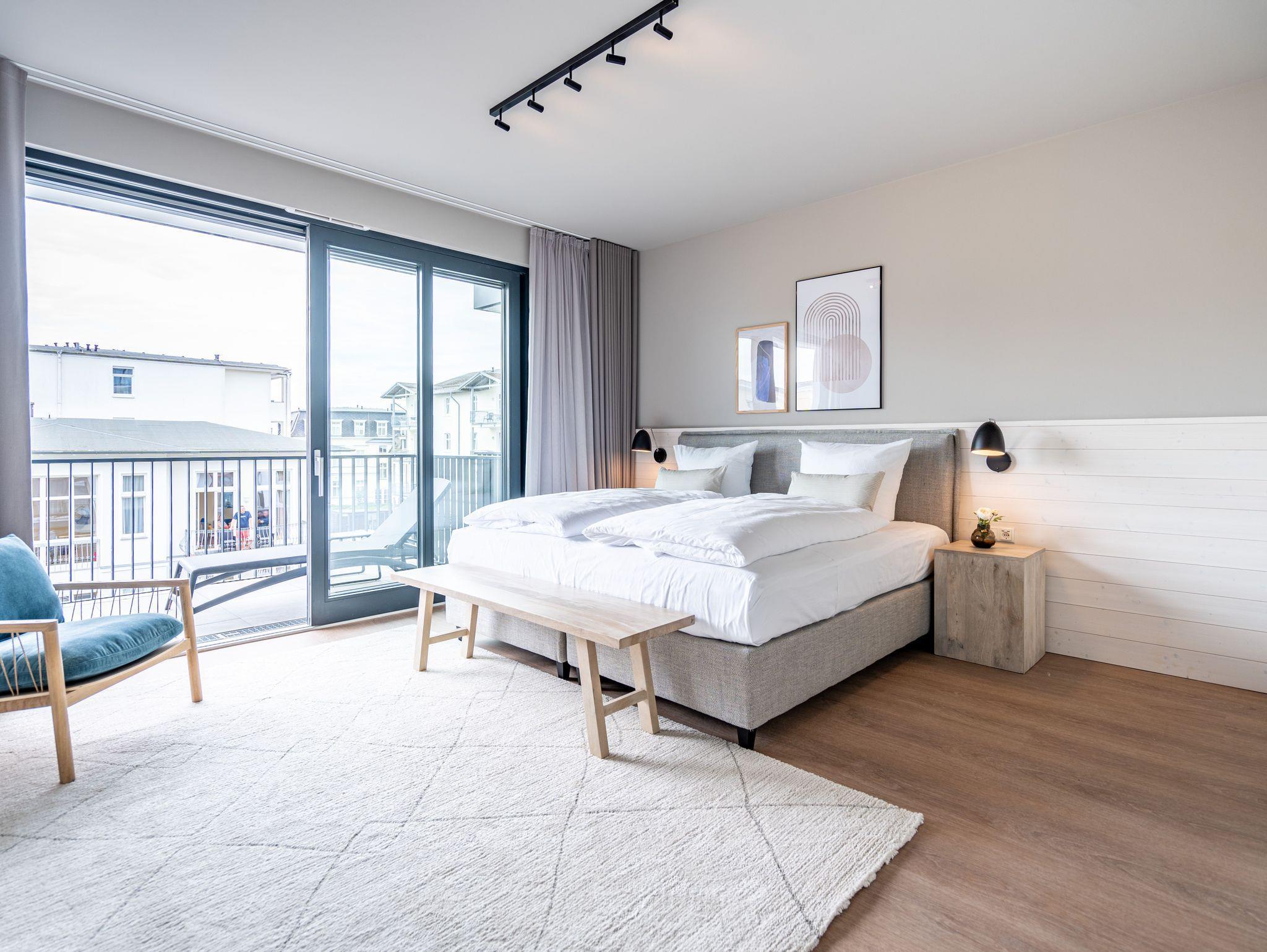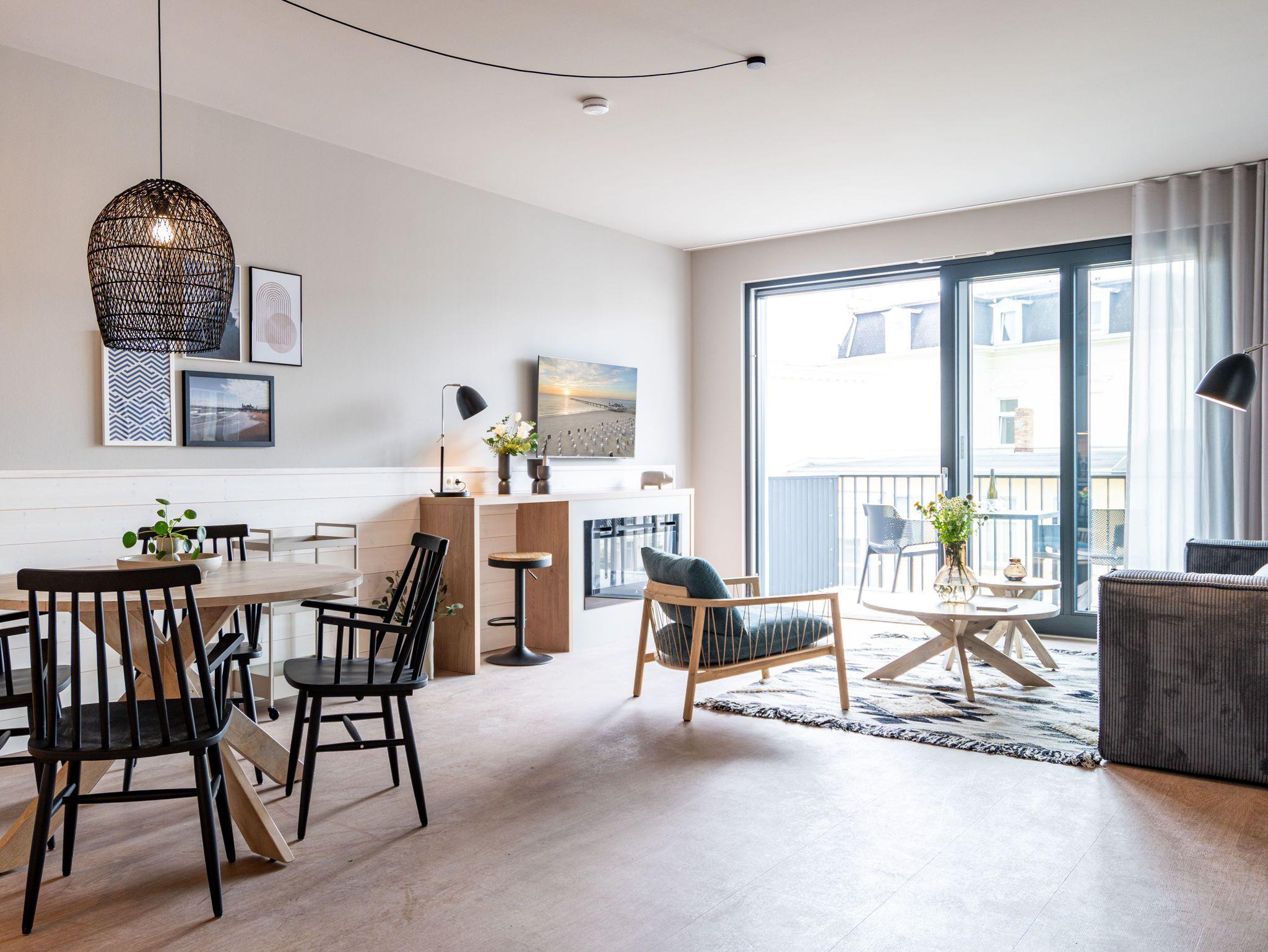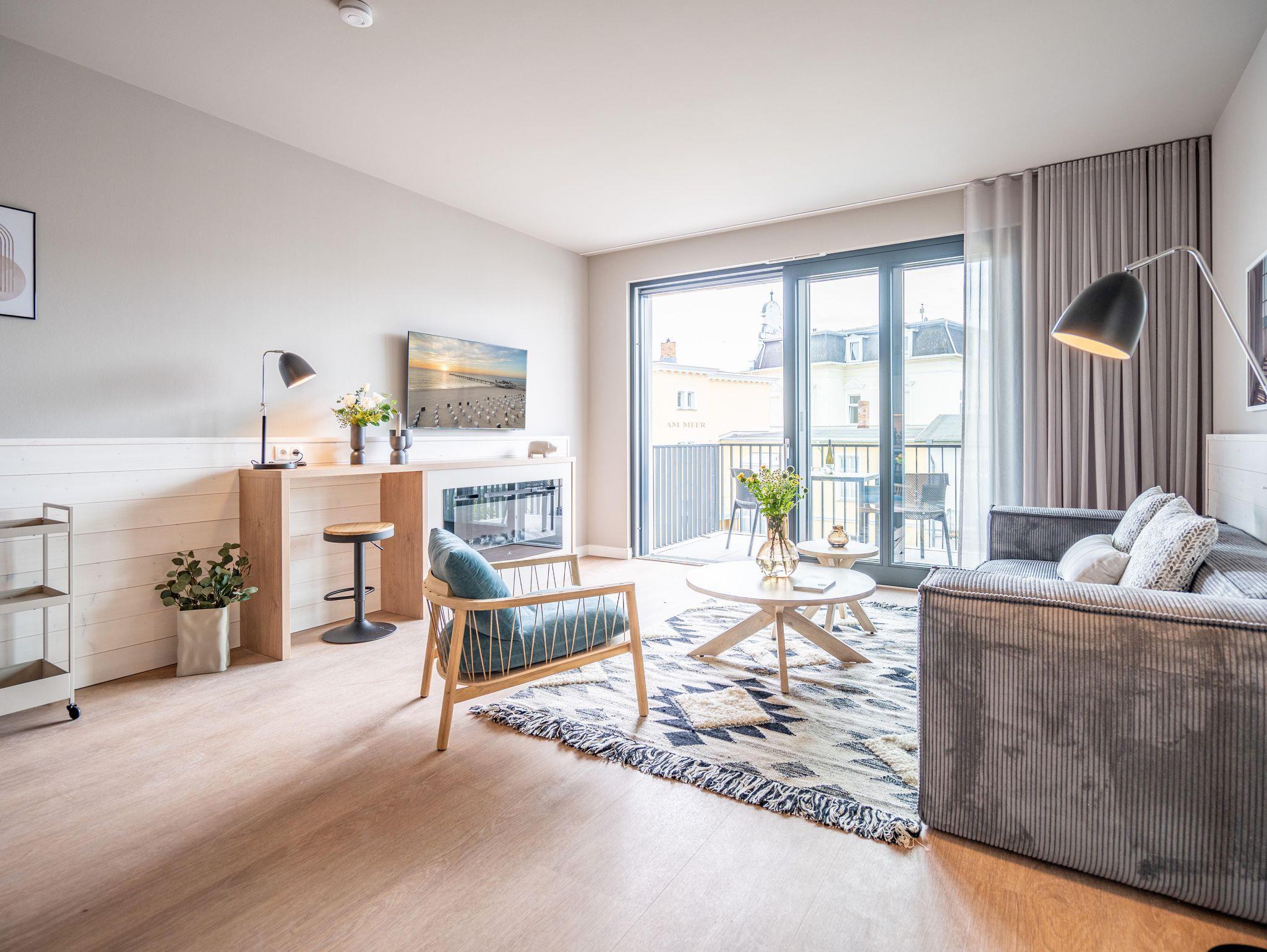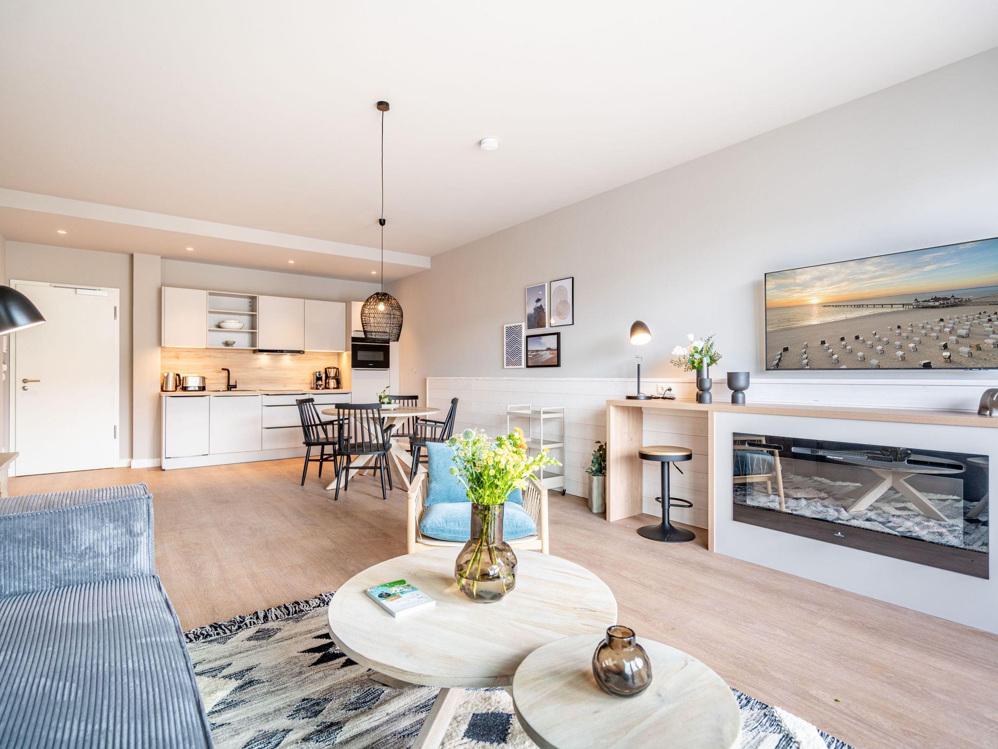 Die 2024 fertig gestellte Strandterrasse liegt direkt an der belebten Strandpromenade und bietet einen einzigartigen Ausblick auf die Grand Dame der historischen Seebrücken sowie die historische Konzertmuschel, einem beliebten Treffpunkt für Kunst und Kultur. Dahinter liegt die Ostsee ? ein Panorama, das zu den schönsten in den Kaiserbädern gehört. Es ist wie das Abtauchen in eine andere Zeit. In eine Zeit, in der man mit Stock, Sonnenschirm und Hut fürs „Sehen und gesehen werden“ über die Promenade schlenderte; aber auch in eine Zeit, in der ? damals wie heute ? Zeit einmal für eine kurze Weile keine Rolle spielt. Weil man angekommen ist im Loslassen, Entspannen und Genießen. Es ist dieser besondere Geruch nach Meeresluft und Freiheit, der in Erinnerung bleibt. Dazu die Bilder, die man mitnimmt. Von langen Strandspaziergängen, vom Lachen in fröhlich schäumenden Ostseewellen, von der Zeit in einem wunderschönen Urlaubsdomizil. Denn genau das ist die Strandterrasse mit ihren 56 modernen und exklusiven Ferienappartements direkt gegenüber der Ahlbecker Seebrücke. Die Ein-, Zwei- oder Dreizimmerwohnungen ? zwischen 40 und 70 Quadratmeter groß ? sind von einer Innenarchitektin gemeinsam mit unserem Erfahrungsschatz an Gästewünschen mit viel Liebe zum Detail und ganz individuell konzipiert worden. Entspannung und Wohlfühlen stehen an erster Stelle. Alles ist aufeinander abgestimmt und sorgt für eine gemütliche Atmosphäre. Wählen Sie zwischen einem Domizil in einem hellen, sandfarbenen Designkonzept oder einem Appartement mit anthrazitfarbenen Farbakzenten. Alle Appartements verfügen gleichermaßen über eine stilvolle und komfortable Einrichtung, die passgenau angefertigt worden ist, sowie über moderne Küchen und Bäder. Jedem Schlafzimmer ist ein eigenes Bad mit Dusche zugeordnet (außer App. B4.5). Die Appartements besitzen fast alle einen Balkon ? viele schauen sogar zur Ostsee hinaus. Die meisten Feriendomizile haben einen Elektrokamin und Infrarotsaunen. Im Erdgeschoss befindet sich ein separater Gemeinschaftsraum für Fahrräder. Außerdem besteht die Möglichkeit, im Gemeinschaftswaschraum 2 Waschmaschinen [&] Trockner zu nutzen. Ergänzt wird das Angebot durch eine Gemeinschaftssauna, die täglich von 11:00 bis 22:00 Uhr nutzbar ist. In der Tiefgarage (Einfahrtshöhe 2,03 Meter) steht für jede Wohnung 1 Pkw-Stellplatz zur Verfügung. Ist alles zur Zufriedenheit untergebracht? Dann kann der Urlaub ja beginnen. Und beim Blick vom Balkon über die Ostsee treffen sich zum Sonnenaufgang das Heute und das Damals. Gelassenheit legt sich beim Gang hinunter an den Strand auf die Seele. Jetzt darf die Zeit stehenbleiben.