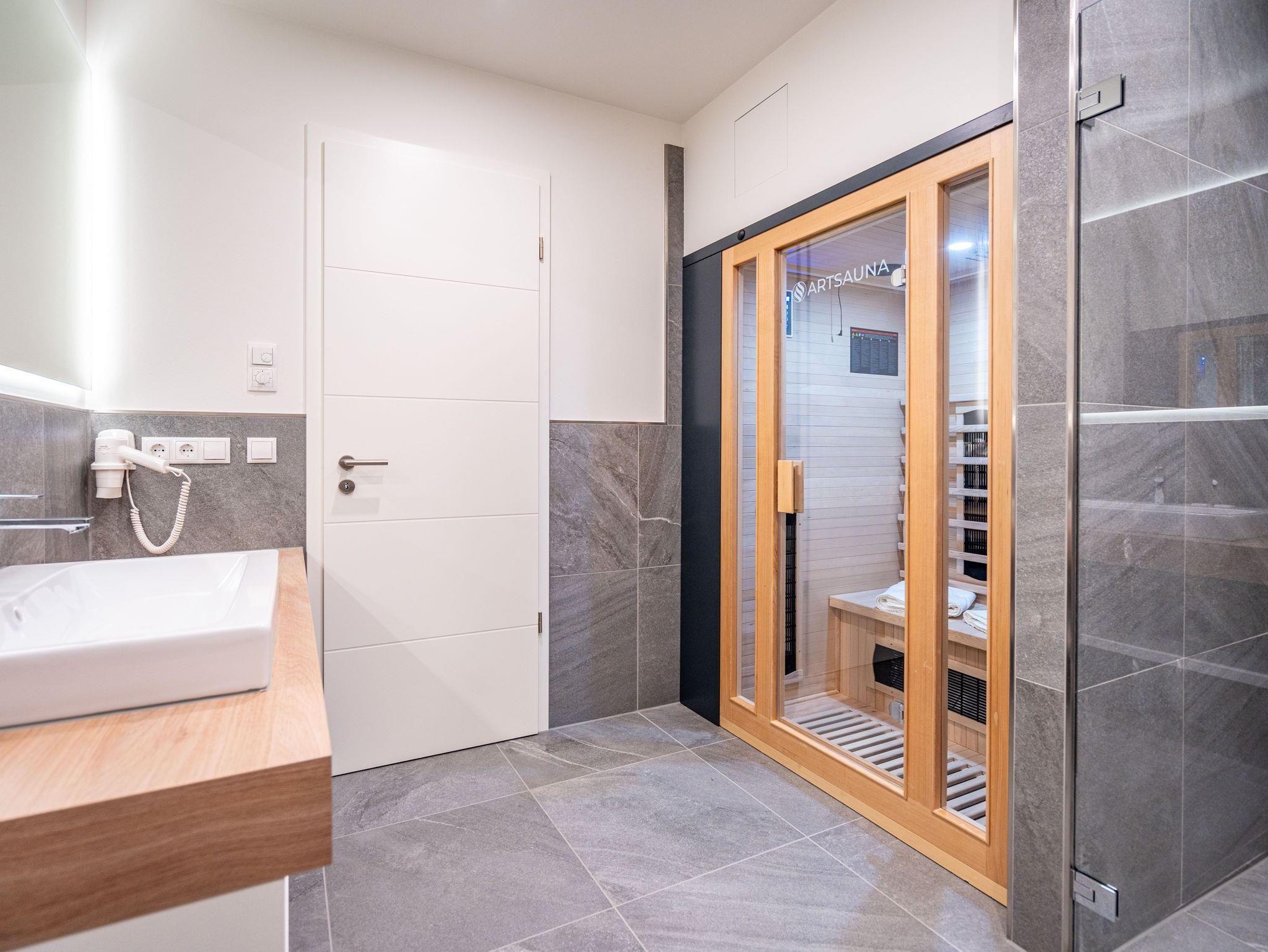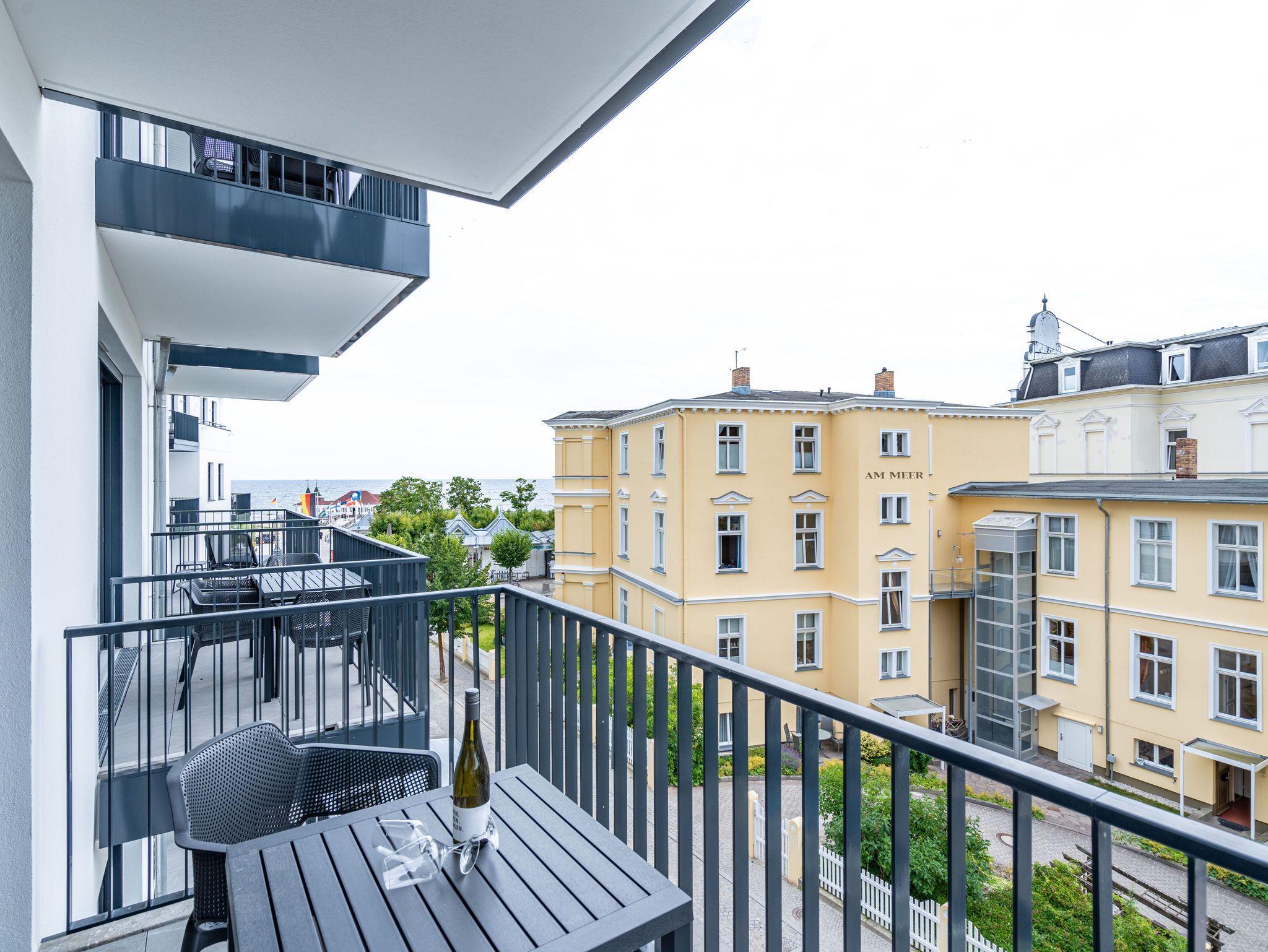 Direkt an der Ostsee mit Blick aufs Wasser ? mehr Meer geht nicht. Diese stilvolle 2-Raum-Wohnung B 2.3 im zweiten Obergeschoss der Strandterrasse ist mit ihren 77 Quadratmeter ein ideales Urlaubsparadies für bis zu 2 Personen und 1 Kleinkind im Babybett. Hier können Sie gleich von zwei Balkonen die Ahlbecker Seebrücke und die dahinter liegende Ostsee genießen. Dazu bietet das Appartement alle Annehmlichkeiten, die Sie sich wünschen. Das großzügige Wohn-Esszimmer mit der integrierten, offenen Küche ist ein kleines Wohlfühlreich der Extraklasse. Komfortable und stylische Möbel im skandinavischen Design sorgen dafür, dass Sie sich hier rundum geborgen fühlen. Zum ausgiebigen Entspannen vor dem Elektrokamin (ohne Wärmeabgabe) eignet sich das tolle Sofa oder der Sessel bestens. Filmabende werden dank des großen Flat-TV (50 Zoll) zu Heimkinoerlebnissen. Ein gemütlicher Essplatz für 4 Personen lädt zum Verweilen ein, während eine Arbeitsstation den Raum funktional ergänzt. Die Küchenzeile ist mit allem ausgestattet, was man zum Kochen und Zubereiten der Mahlzeiten brauchen kann. Dazu gehören moderne Elektrogeräte wie ein Backofen, ein 3-Platten-Induktionsherd oder eine Nespresso-Kapselmaschine. Der Zugang zum ersten Süd-Ost-Balkon bietet einen herrlichen Ausblick und ist mit einem Gartentisch und 2 Stühlen ausgestattet. Auf den zweiten Süd-Ost-Balkon können Sie vom Schlafzimmer aus hinaustreten. Auf der dortigen Gartenliege können Sie sich wunderbar an der frischen Brise erfreuen, die vom Meer herüberweht. Das Schlafzimmer verfügt über ein großes Boxspringdoppelbett (2,00m x 2,00m), ein festes Babybett, einen großen Kleiderschrank und einen Flat-TV (50 Zoll). Ihr Badezimmer wird an ungemütlichen Tagen zu einer kleinen Wellnessoase. Denn es verfügt neben der Dusche, dem Waschtisch und dem WC über eine Infrarotsaunakabine, die Auszeitabende in kuschelige Mußestunden verwandelt. In der Tiefgarage gehört zu Ihrer Wohnung ein PKW-Stellplatz. Herzlich Willkommen in dieser charmanten Ferienwohnung. Wir wünschen Ihnen hier eine wunderbar erholsame Zeit.