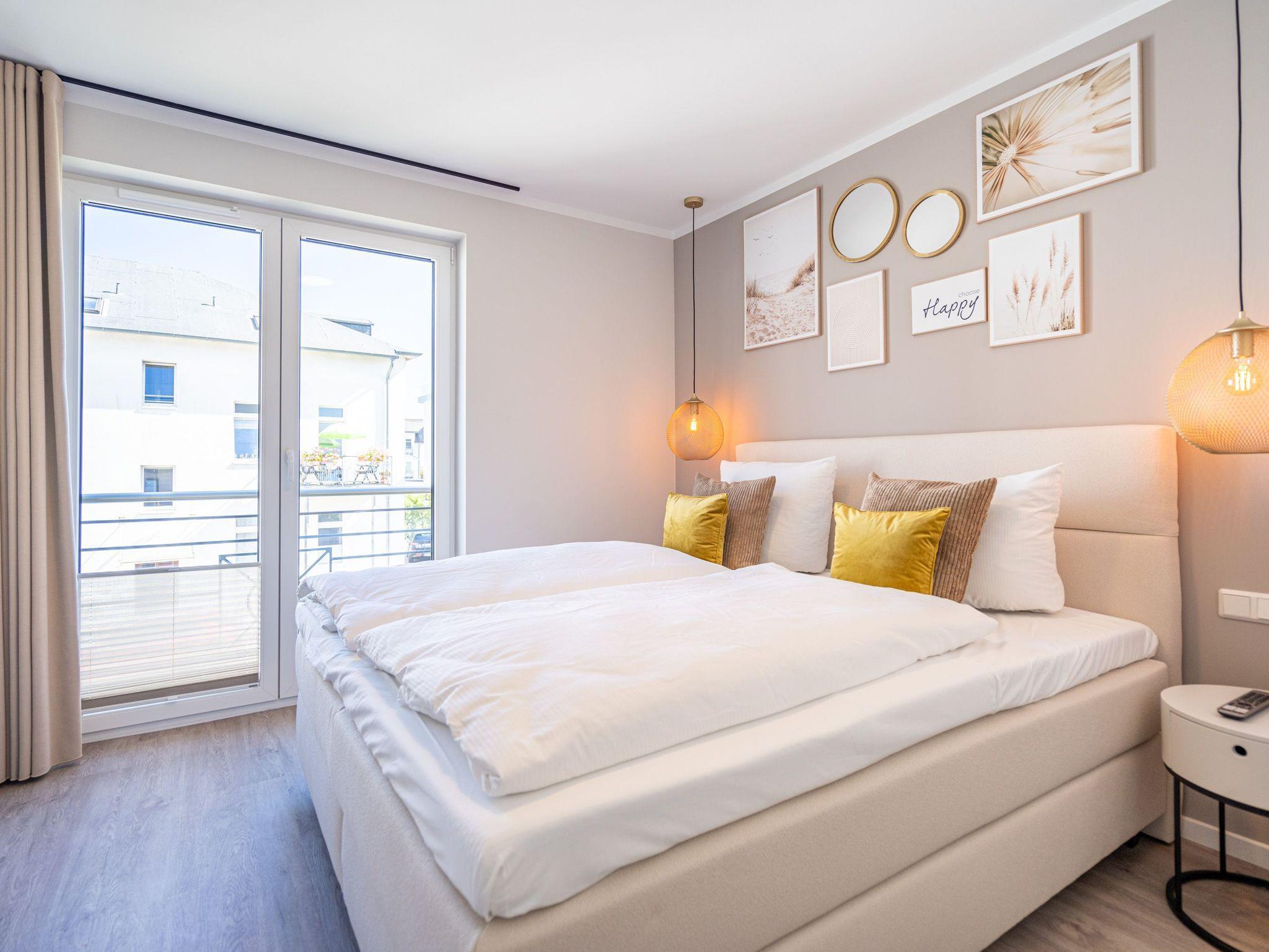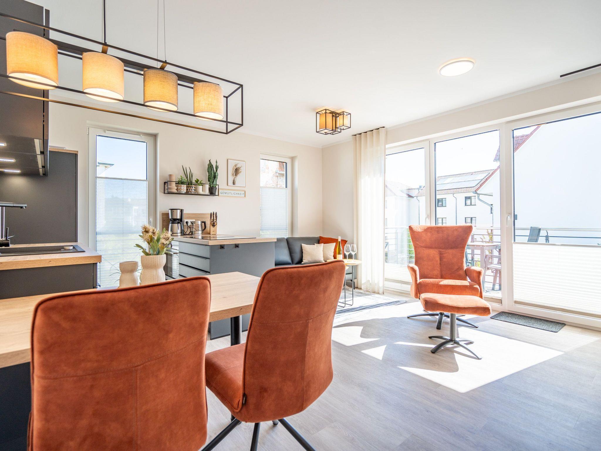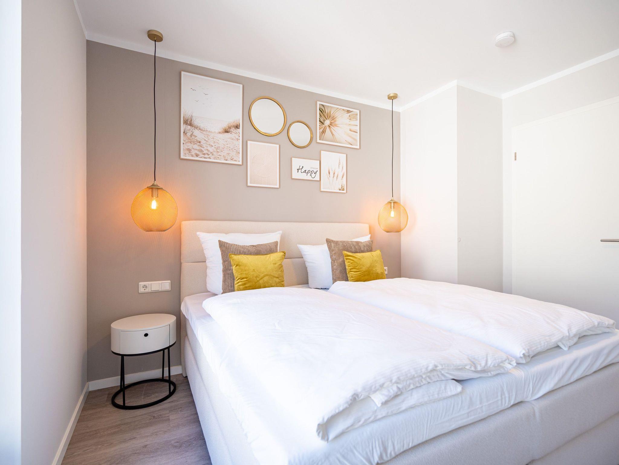 Diese einladende 2-Raum-Ferienwohnung N° 07 im Quartier 6 bietet auf 55 Quadratmetern in der ersten Etage ein komfortables Zuhause für bis zu 2 Personen und ein Kleinkind (im Kinderreisebett). Der offene Wohn-Essbereich ist stilvoll gestaltet und umfasst eine voll ausgestattete Küchenzeile mit einem Essplatz sowie einer einladenden Sitzgruppe. Hier können Sie entspannt auf dem 55-Zoll-Flat-TV fernsehen oder den Gaskamin per Fernbedienung genießen. Vom Wohnbereich aus haben Sie Zugang zu einem Süd-Ost-Balkon, der mit Gartenmöbeln ausgestattet ist ? perfekt für ein Frühstück in der Sonne. Im Schlafzimmer erwartet Sie ein komfortables Boxspringdoppelbett (1,80m x 2,00m), ein geräumiger Kleiderschrank, eine Kommode und ein weiterer Flat-TV (43 Zoll). Das Badezimmer ist modern eingerichtet und verfügt über eine Dusche, einen Waschtisch, ein WC und eine finnische Sauna, die Ihnen entspannte Stunden verspricht. Zu den weiteren Annehmlichkeiten gehören die kostenfreie Nutzung einer Waschmaschine sowie ein PKW-Stellplatz in der Tiefgarage. Zusätzlich steht Ihnen ein eigener Kellerraum zur Verfügung, in dem Sie Ihre Fahrräder sicher unterbringen können ? inklusive Lademöglichkeit für E-Bikes. Diese Ferienwohnung bietet alles, was Sie für einen rundum gelungenen Aufenthalt benötigen.