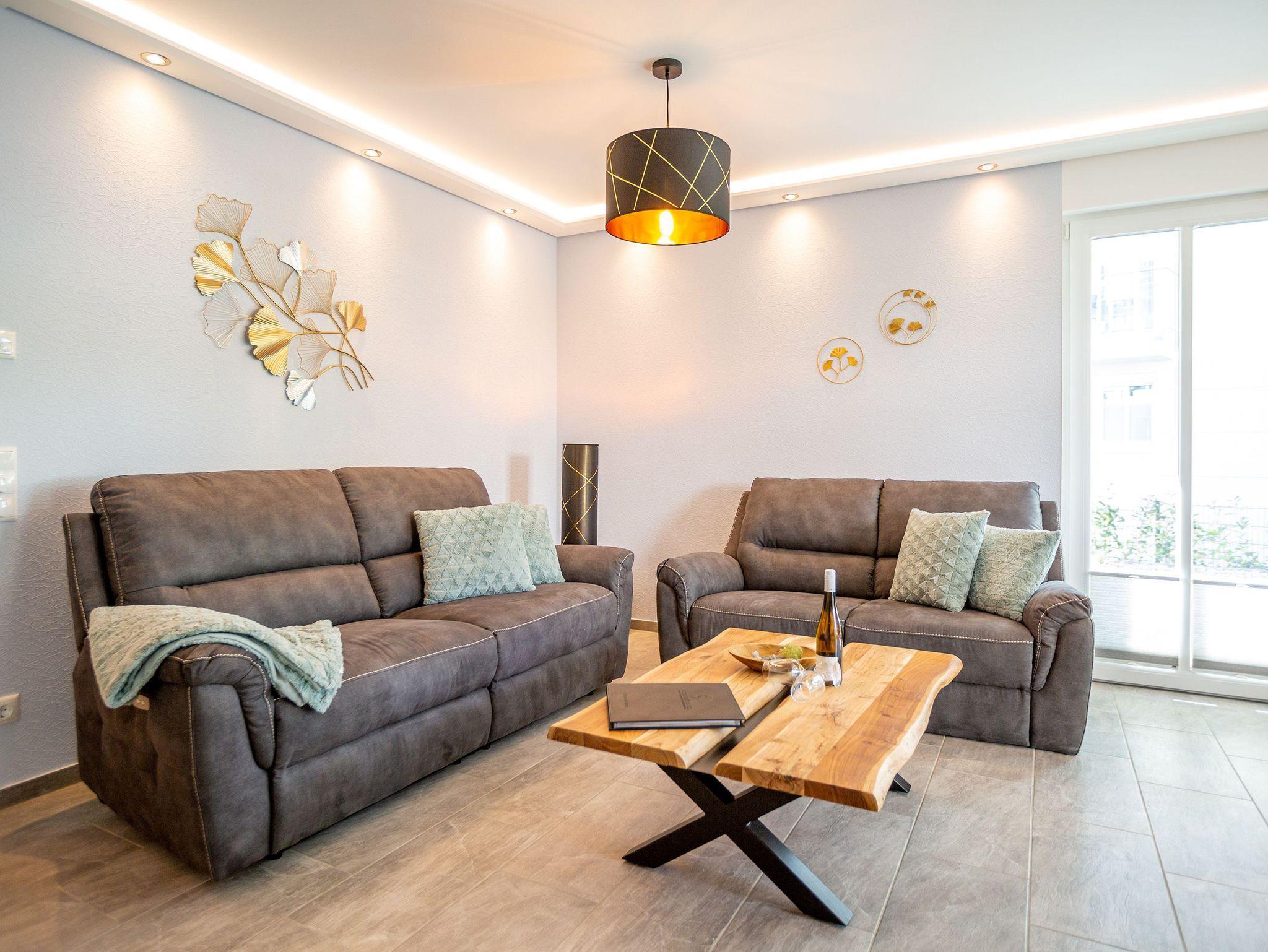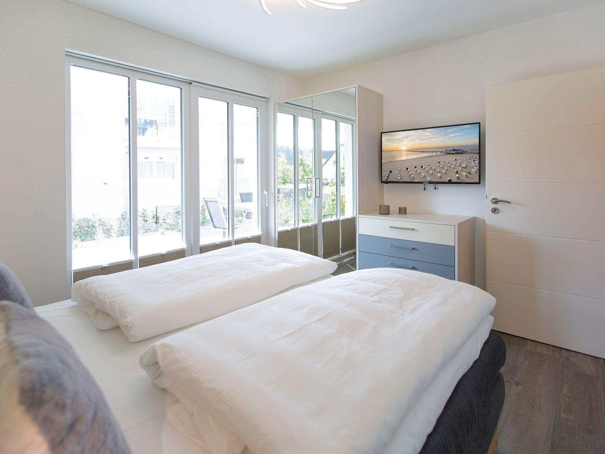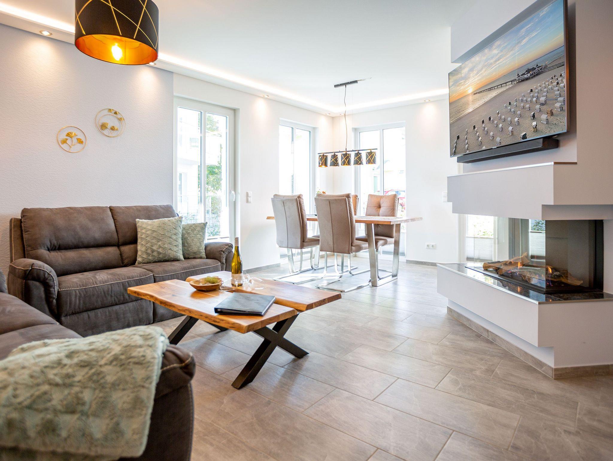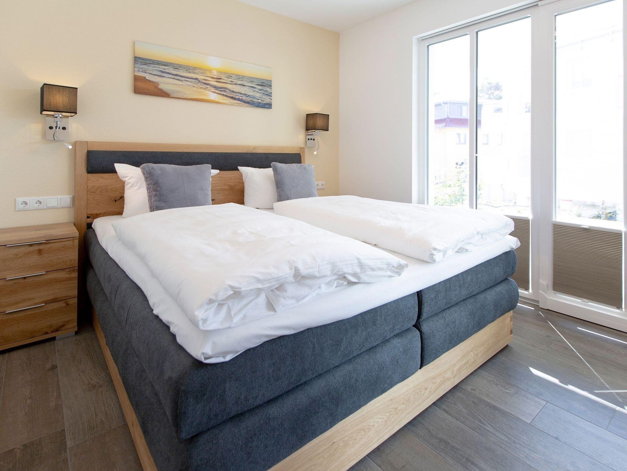 Zum Ausspannen und Wohlfühlen lädt dieses 66qm große Ferienappartement im Erdgeschoss bis zu vier Personen ein. Helle, lichtdurchflutete Räume und ein modernes Interieur sorgen für angenehmen Urlaubsflair während Ihres Ostseeaufenthaltes. Mit dem Fahrstuhl gelangen Sie von der Tiefgarage bequem bis vor das 3-Zimmer-Appartement. Über den großzügigen Flur mit Garderobe und Sitzmöglichkeit erreichen Sie den offen gestalteten Wohn-Essbereich. Für maximalen Komfort sorgen zwei elektrisch einstellbare Sofalandschaften. Verbringen Sie gemütliche Fernsehabende vor dem Flat-TV mit Soundsystem. Ein Highlight dieses Appartements ist der Gaskamin. Dieser sorgt für wohlige Wärme, die besonders nach einem langen Strandspaziergang in den Herbst- und Wintermonaten guttut. Nehmen Sie Platz auf der angrenzenden und großzügigen Süd-Terrasse und hören Sie bei richtiger Windrichtung dem Wellengang der Ostsee zu. Für luxuriösen Schlafkomfort sorgen die bequemen Boxspringbetten (1,80m x 2,00m) in beiden Schlafzimmern. Flat-TVs, geräumige Einbauschränke und ein Safe gehören ebenso zur edlen Ausstattung der Appartement-Schlafzimmer. Die hochwertige Küche mit Marken-Elektrogeräten (Induktionskochfeld, Backofen, Mikrowelle, Spülmaschine) sorgt für alle Annehmlichkeiten, die Sie beim Zubereiten Ihrer Speisen im Urlaub benötigen. Das Masterbad hält als eines von zwei Bädern ein weiteres Highlight für Sie bereit: Neben einem LED-beleuchtetem Waschtisch, beheiztem Badezimmerspiegel und Toilette lädt die Finnische Sauna Sie ein ihrem Körper etwas Gutes zu tun. Bringen Sie anschließend Ihren Kreislauf unter der Regendusche wieder in Schwung. Ein zweites Bad mit Regendusche, Waschtisch und Toilette bietet besonders Familien oder befreundeten Paaren die Möglichkeit einer separaten Nutzung. Kostenfreies W-Lan und ein Stellplatz in der hauseigenen Tiefgarage runden Ihren perfekten Urlaub auf der Insel Usedom ab.