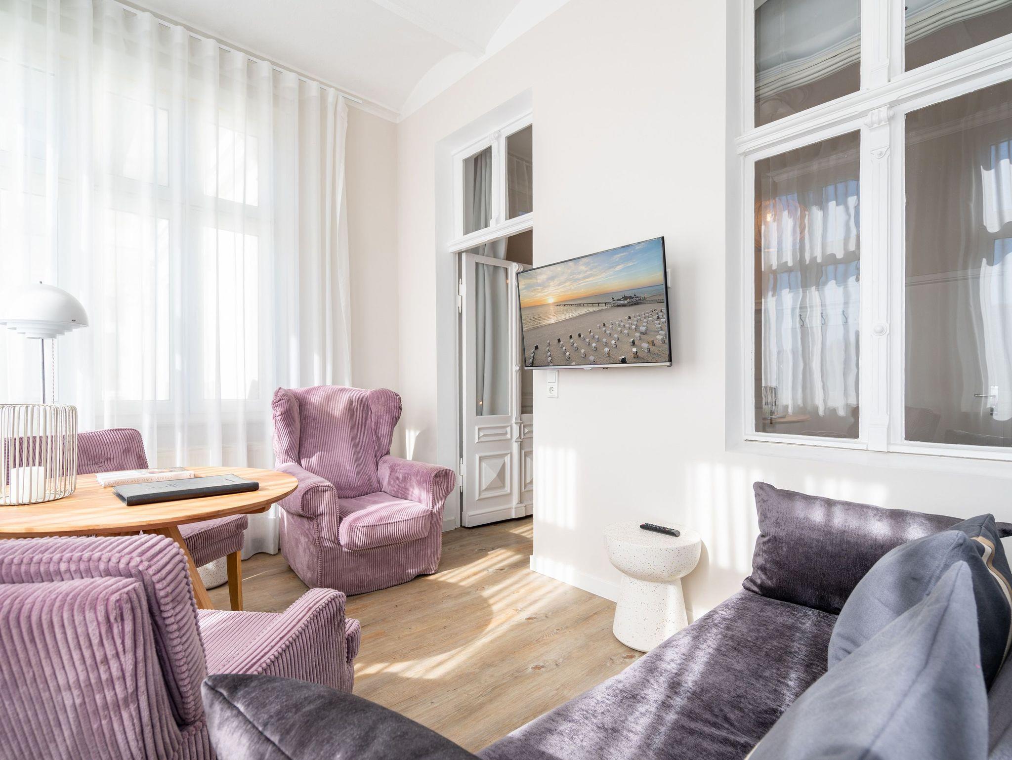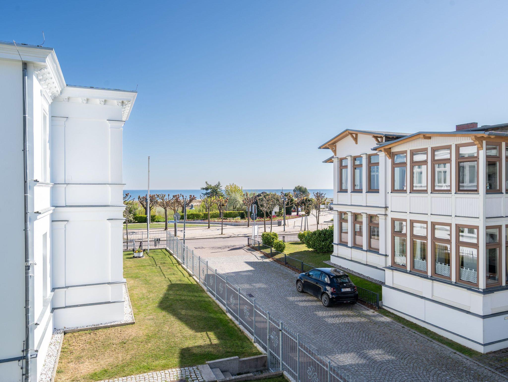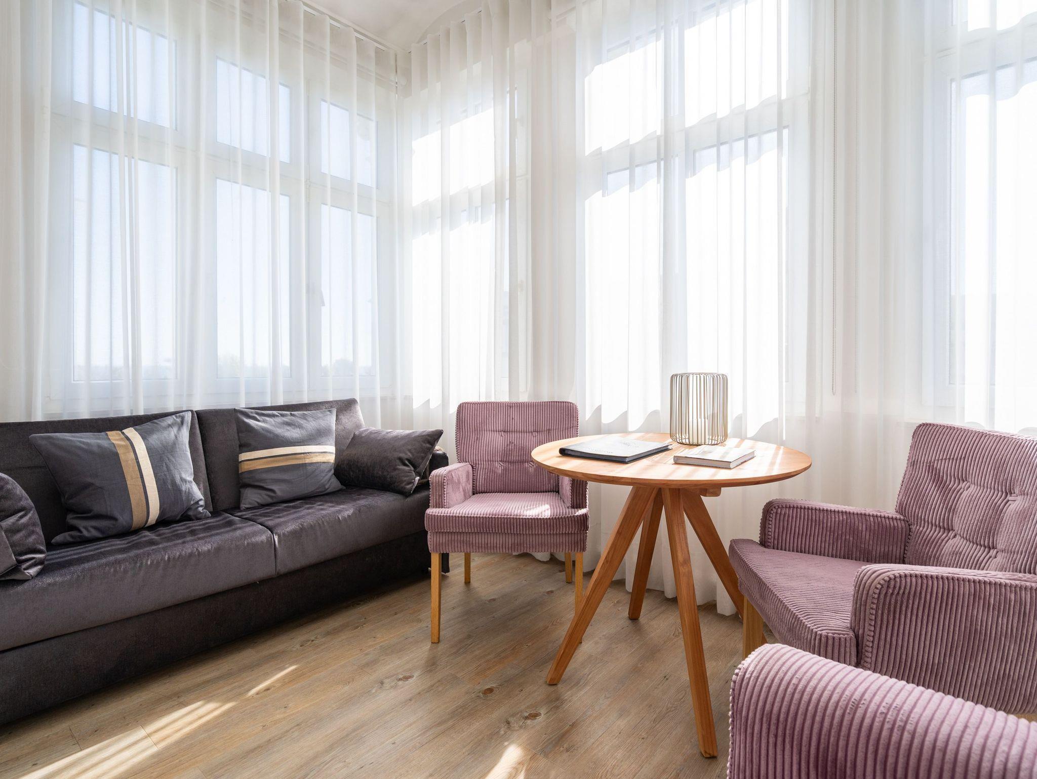 Im 1. Obergeschoss der Villa Albertine befindet sich diese schöne 2-Raum-Ferienwohnung (31 qm) für 2 Personen und ein Kind bis 16 Jahre. Die moderne, helle Einrichtung lässt keine Wünsche offen. Freuen Sie sich auf die schöne und lichtdurchflutete Veranda, in der sich der Wohnbereich mit Schlafsofa (hier kann ein Kind zusätzlich aufgebettet werden), modernem Flat-TV und ein kleiner Essplatz mit schönem, jahreszeitlich abhängigen Blick auf die Ostsee, befindet. Der Schlafbereich ist mit einem komfortablen Boxspringdoppelbett (1,60m x 2,00m) [&] Flat-TV ausgestattet. Im Eingangsbereich ist die kleine Küche integriert, die durch gekonnte Detaillösungen komplett ausgestattet ist (2-Platten-Induktionsfeld, Geschirrspüler, Mikrowelle). Ergänzt wird das Appartement durch ein Bad mit Dusche und WC. Ein PKW-Stellplatz Nr. 6 befindet sich auf dem Grundstück.