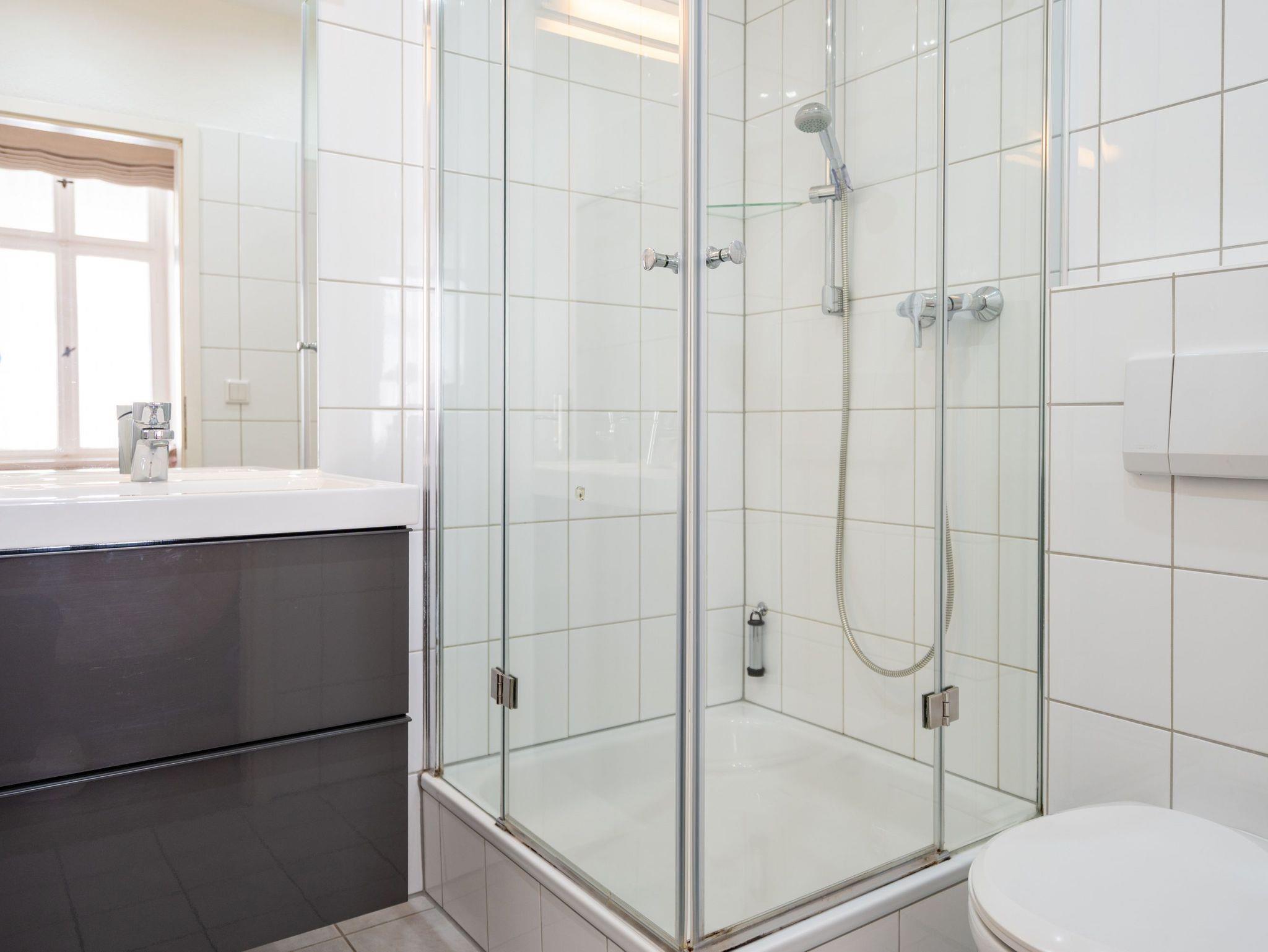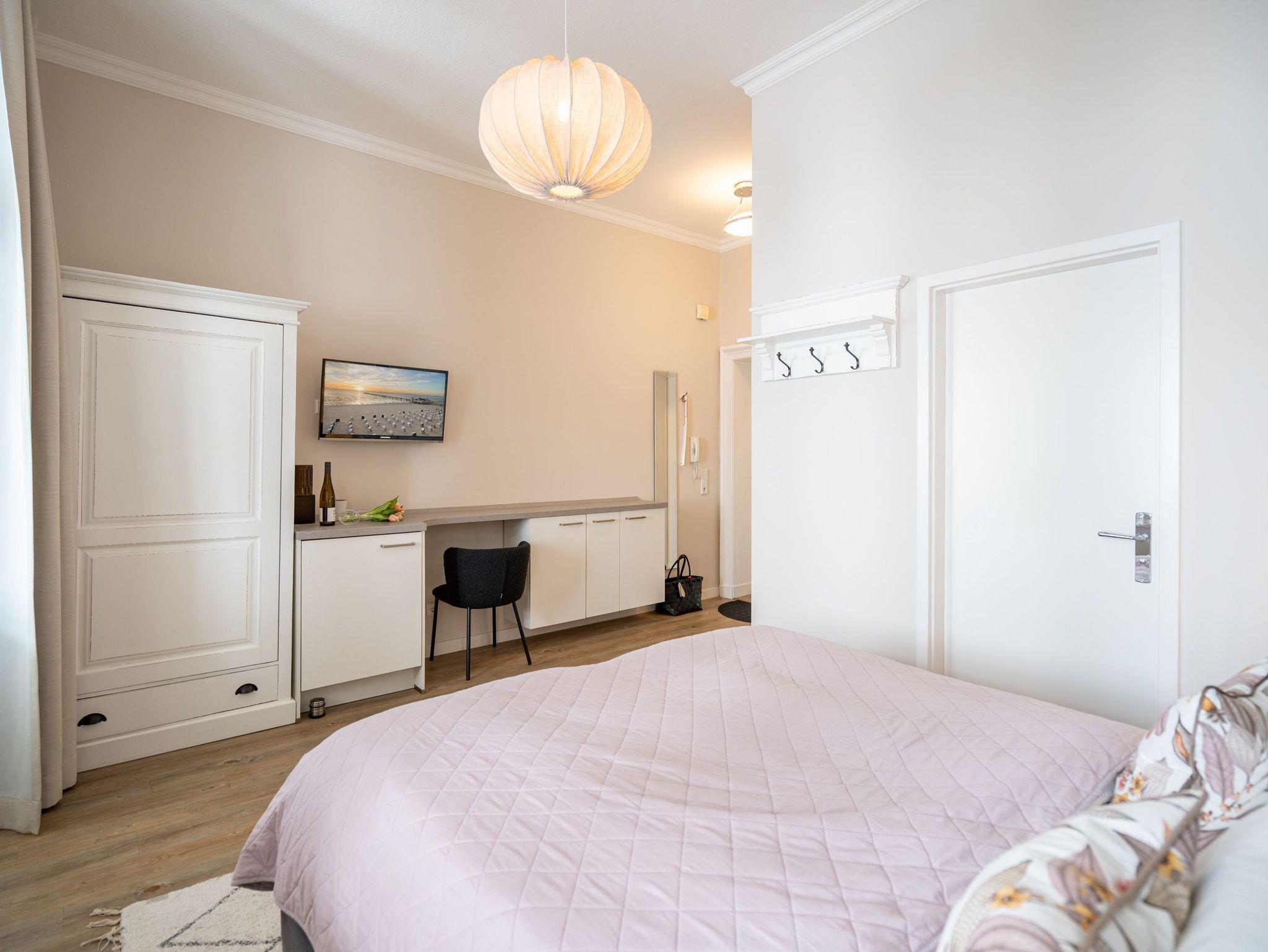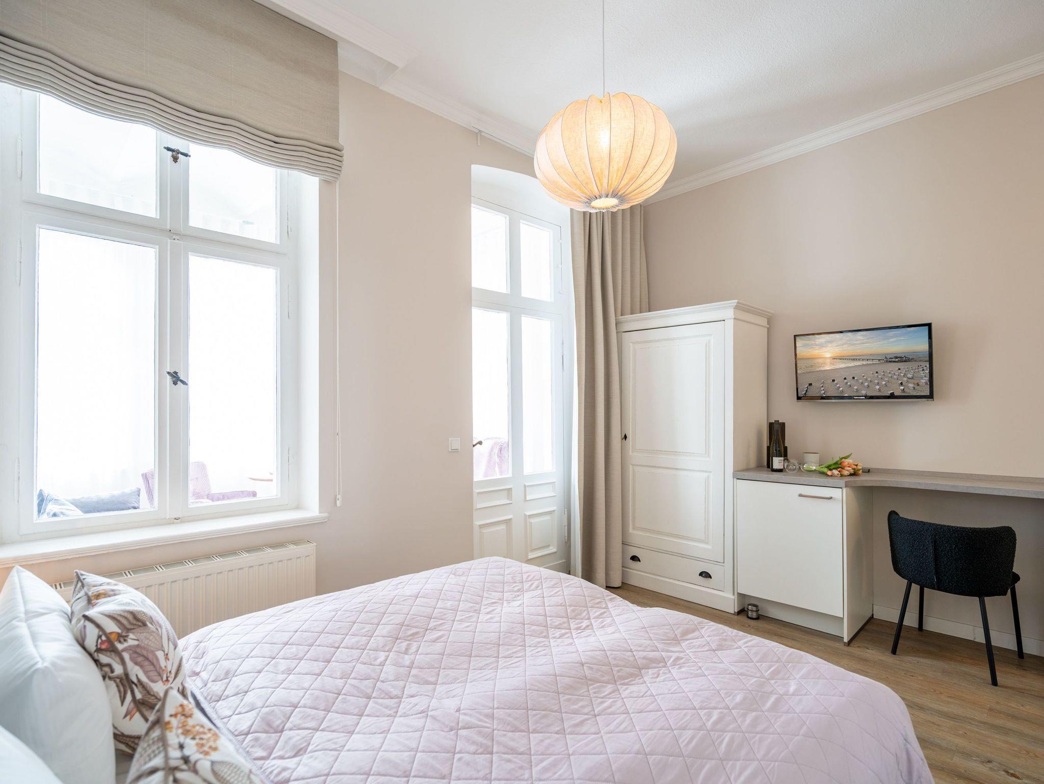 Im 1. Obergeschoss der Villa Albertine befindet sich diese schöne 2-Raum-Ferienwohnung (31 qm) für 2 Personen und ein Kind bis 16 Jahre. Die moderne, helle Einrichtung lässt keine Wünsche offen. Freuen Sie sich auf die schöne und lichtdurchflutete Veranda, in der sich der Wohnbereich mit Schlafsofa (hier kann ein Kind zusätzlich aufgebettet werden), modernem Flat-TV und ein kleiner Essplatz mit schönem, jahreszeitlich abhängigen Blick auf die Ostsee, befindet. Der Schlafbereich ist mit einem komfortablen Boxspringdoppelbett (1,60m x 2,00m) [&] Flat-TV ausgestattet. Im Eingangsbereich ist die kleine Küche integriert, die durch gekonnte Detaillösungen komplett ausgestattet ist (2-Platten-Induktionsfeld, Geschirrspüler, Mikrowelle). Ergänzt wird das Appartement durch ein Bad mit Dusche und WC. Ein PKW-Stellplatz Nr. 6 befindet sich auf dem Grundstück.