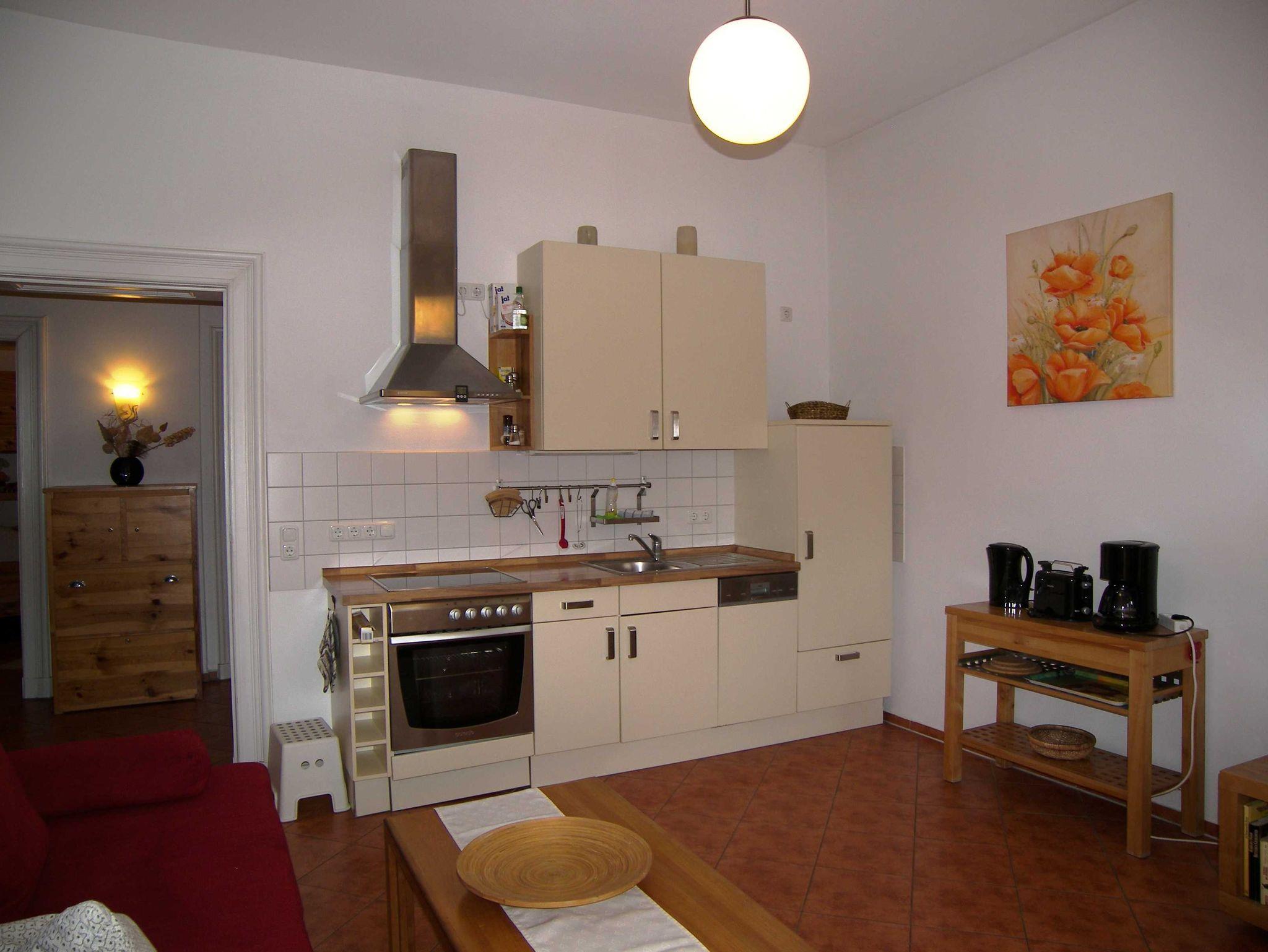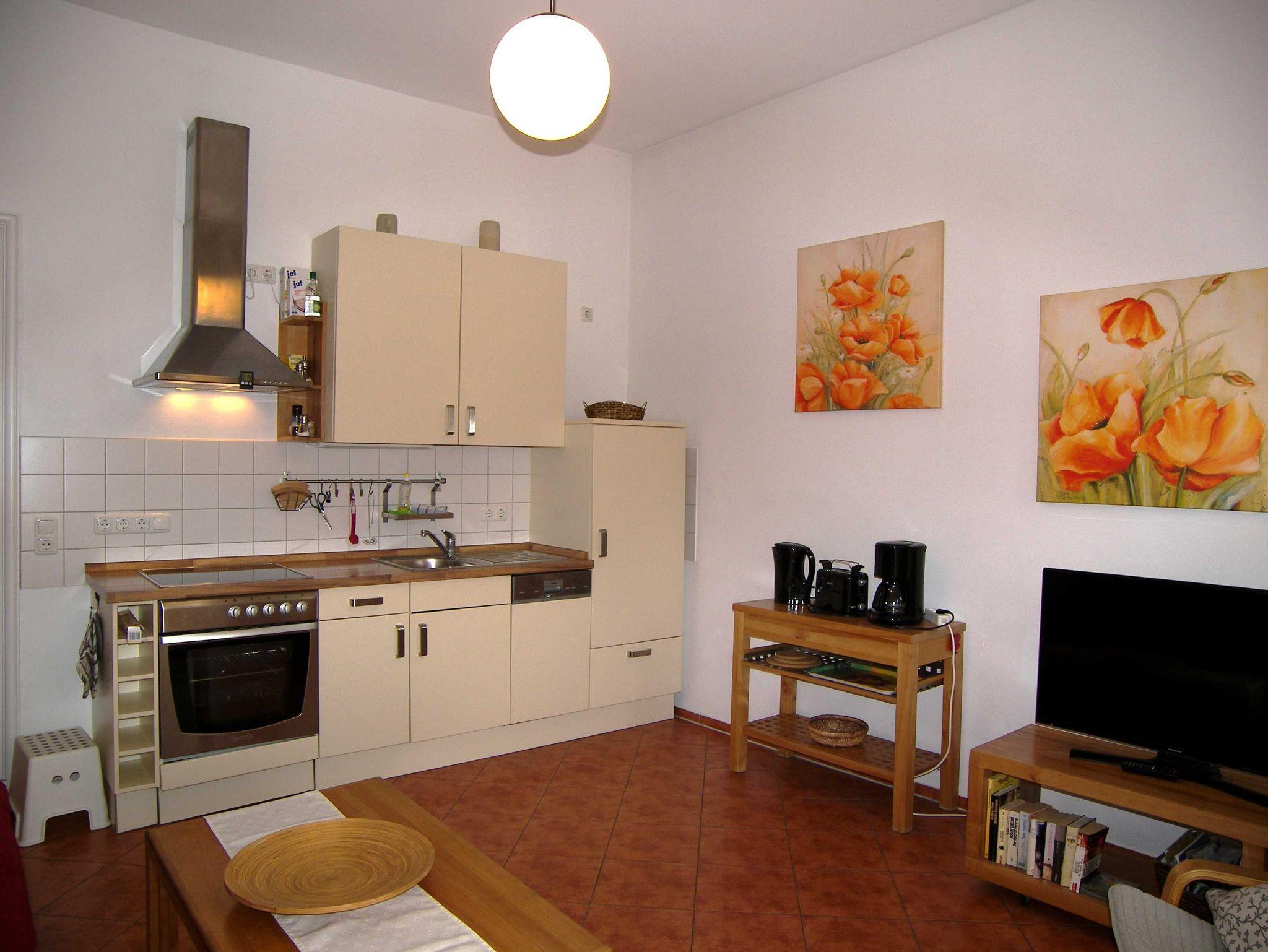 Die Wohnküche ist ausgestattet mit einen gemütlichen Schlafsofa (Liegefläche 1,15 x 1,90 m), Couchtisch, Flachbild-Fernseher und Relax-Sessel. Die moderne Küchenzeile verfügt über ein 4-Platten-Cerankochfeld, Backofen, Spülmaschine, Kühlschrank, Kaffeemaschine, Toaster, Wasserkocher und Geschirr. Vom Wohnzimmer aus gelangen Sie in den schönen Wintergarten mit Esstisch, bequemen Polsterstühlen + Sitzbank. Von hier aus können Sie den schönen seitlichen Seeblick genießen und das Treiben auf der Promenade beobachten.