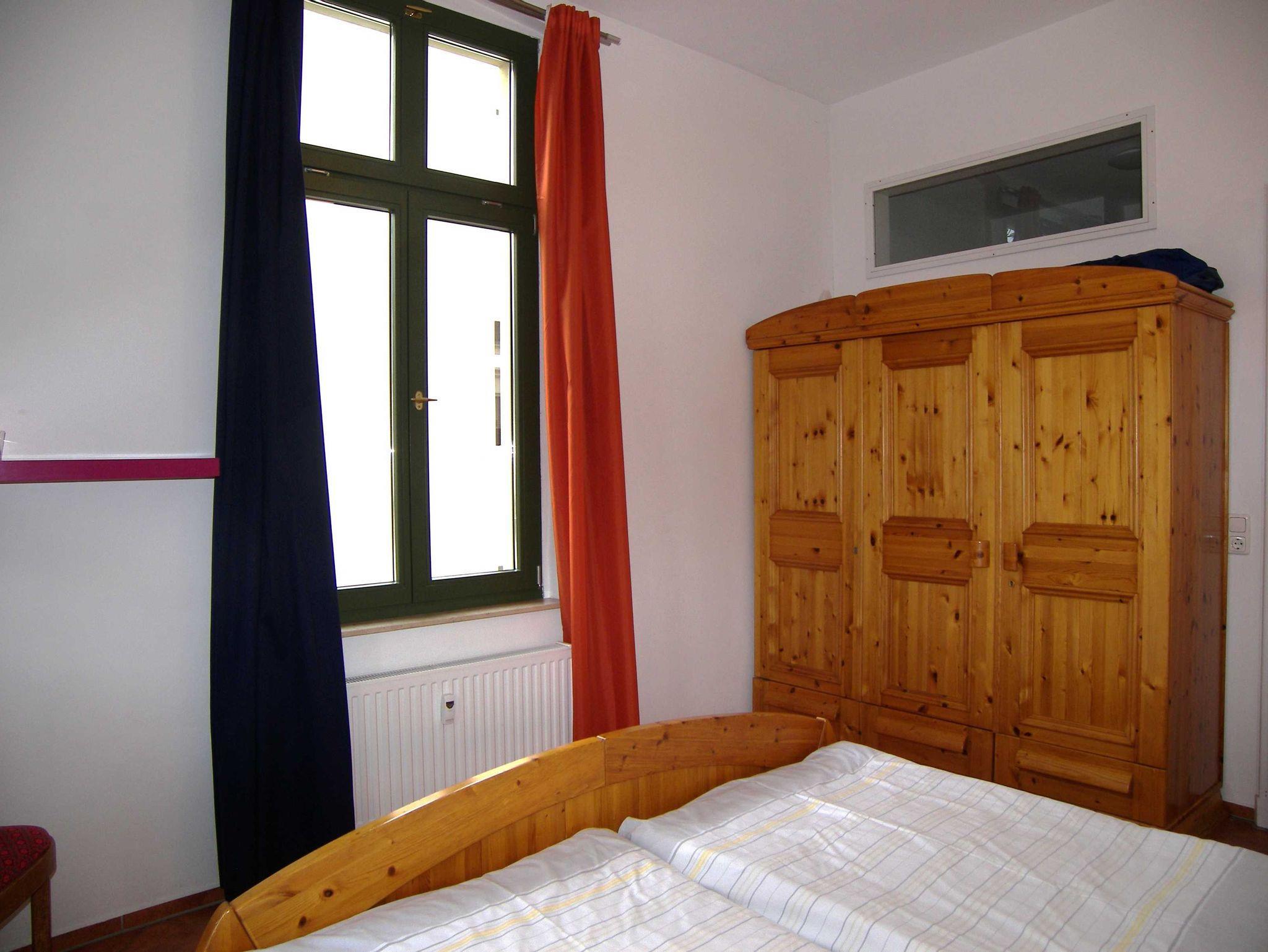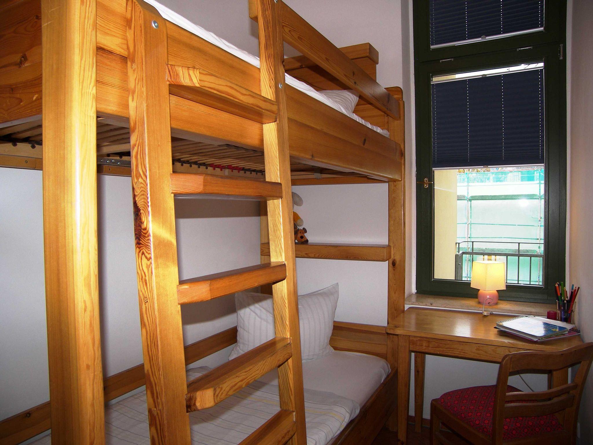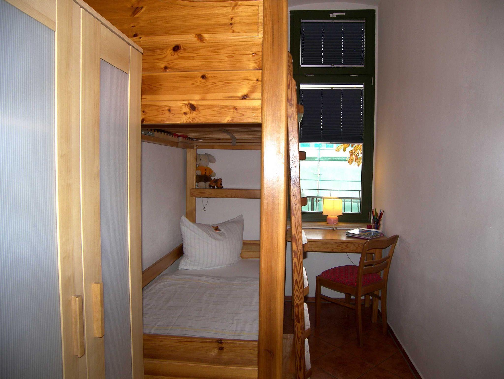 Das große Schlafzimmer ist mit einem Doppelbett und Kleiderschrank ausgestattet. Vom Schlafzimmer aus gelangen Sie auf den Balkon der zur Ostseite liegt. Das kleine Schlafzimmer verfügt über ein Etagenbett, Schreibtisch und Kleiderschrank.