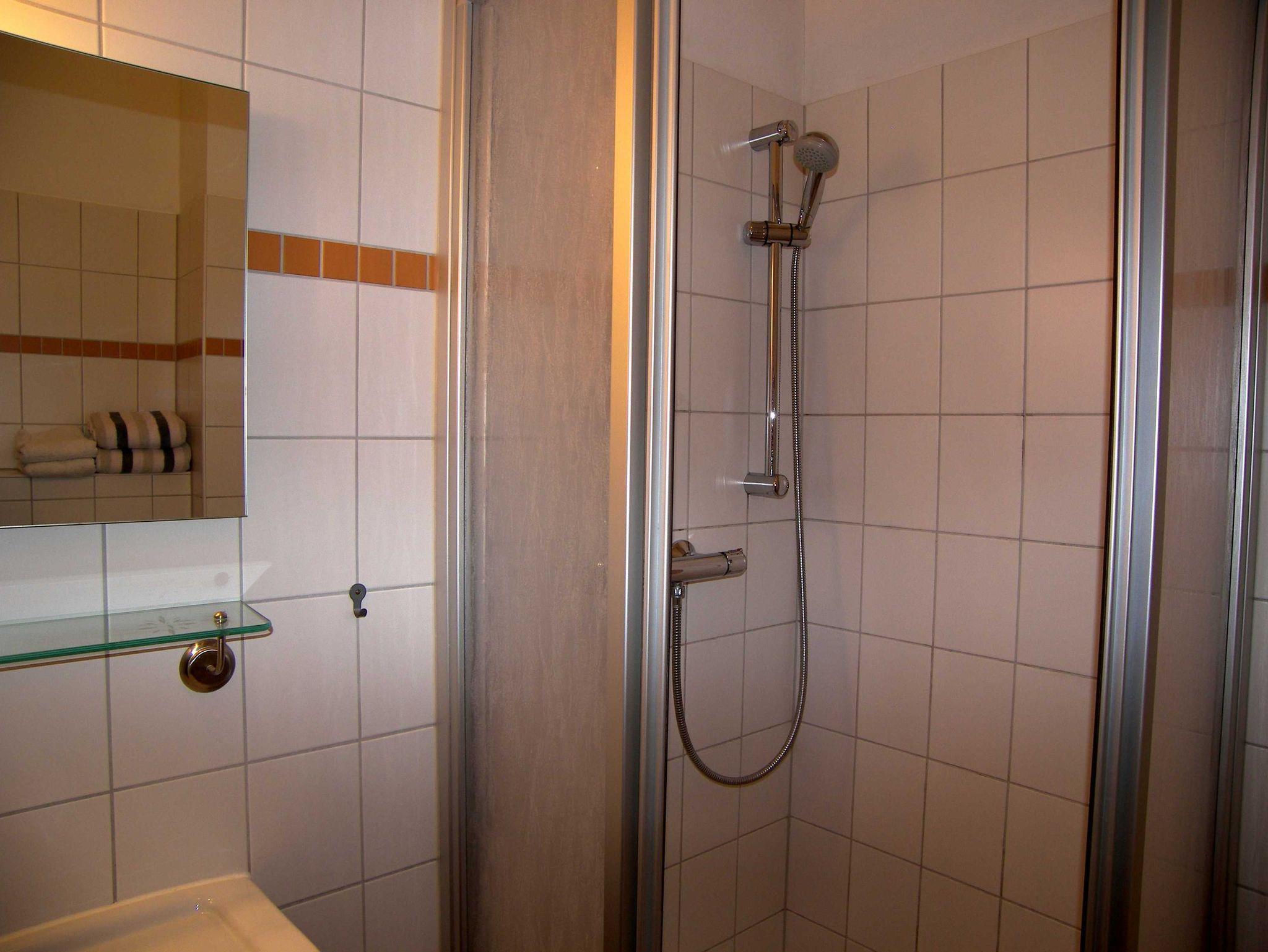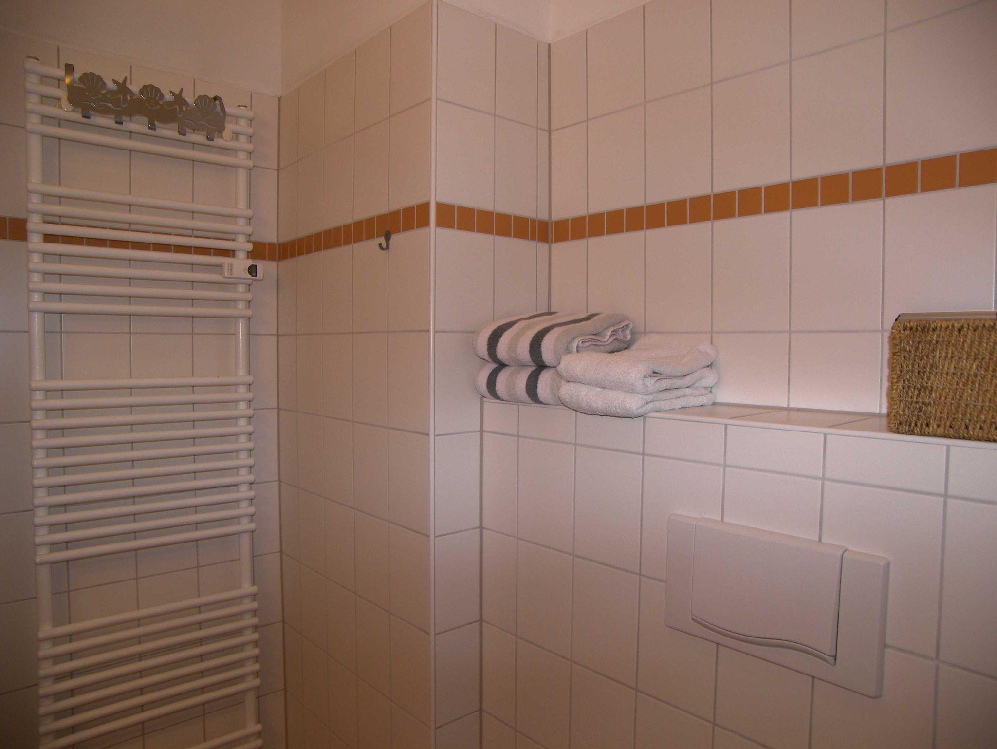 Im Badezimmer befindet sich eine Dusche, WC, Waschbecken und eine Fußbodenheizung für warme Füße. Die gesamte Wohnung ist mit terracottafarbenen Fliesen ausgestattet.