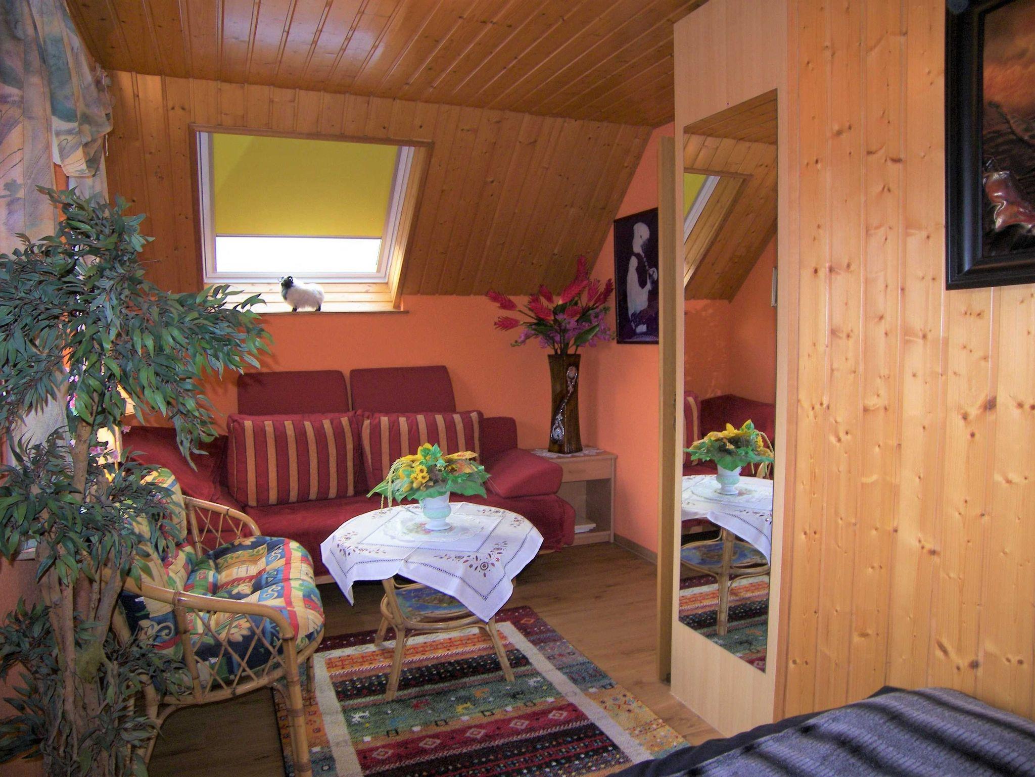 Eine zweite Couch, die als Schlafcouch umgebaut werden kann mit einer Breite von 1,20 m, befindet sich ebenfalls im Zimmer. Die Räume im Obergeschoß haben holzgetäfelte Dachschrägen.
