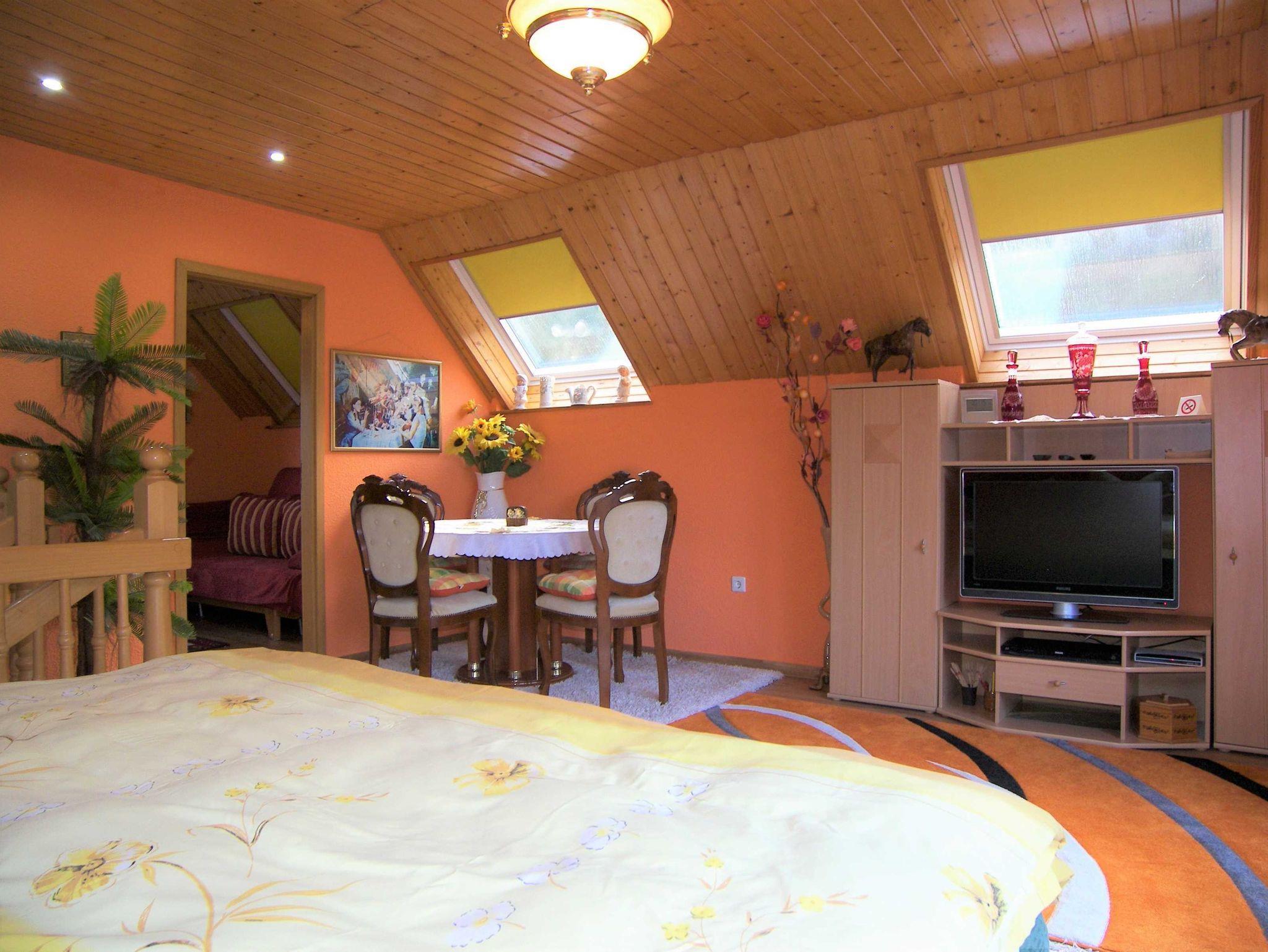 Über eine Treppe erreicht man das Obergeschoss (nicht durch eine Tür abgetrennt). Hier befinden sich ein Schlafraum mit einem Doppelbett (1,80 x 2,00 m), eine Sitzgruppe mit Tisch und ein zweites TV-Gerät. Von diesem Zimmer hat man zutritt zum Balkon mit einem schönen Blick ins Grüne.