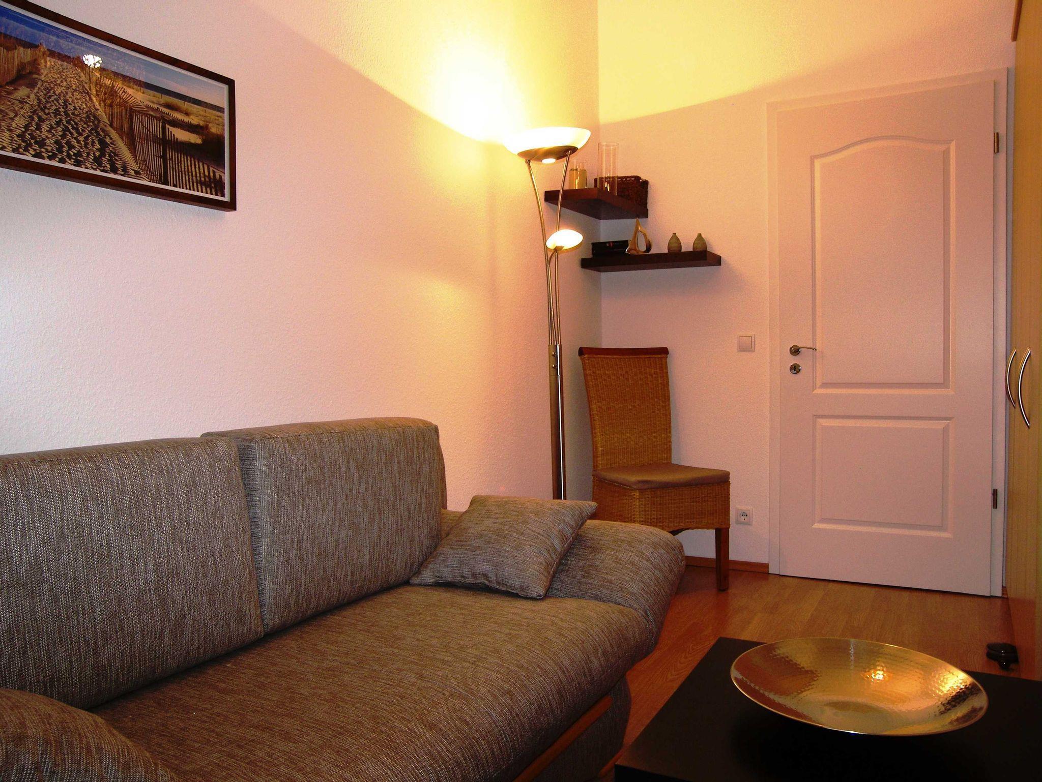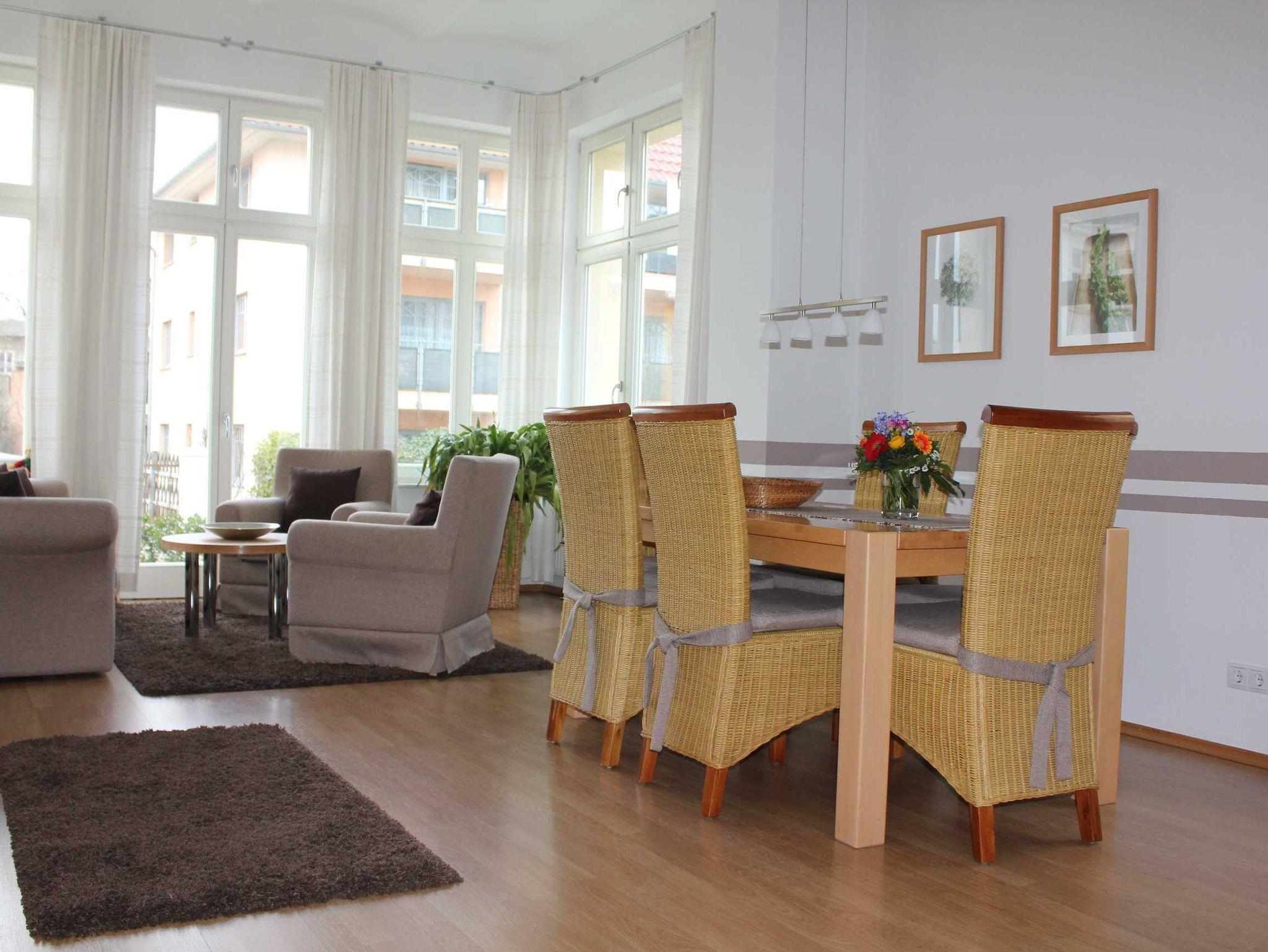 Im Erdgeschoss der Villa befindet sich die 76 m² große, modern und geschmackvoll eingerichtete Dreizimmer- Nichtraucherwohnung, die über ein geräumiges Wohnzimmer mit Küchenzeile, zwei Schlafzimmer und ein Badezimmer mit Dusche und WC verfügt. Vom 2. Schlafzimmer aus haben Sie Zutritt zum Balkon. Verleben Sie Ihren Urlaub hier bequem zu viert. In der Veranda mit ihren großen Fenstern können Sie bei jedem Wetter die Lichtstrahlen genießen.Von dort aus betreten Sie auch die Terrasse, die Sie bei sonnigem Wetter zum Verweilen einlädt. Kostenloser W-LAN Zugang vorhanden!