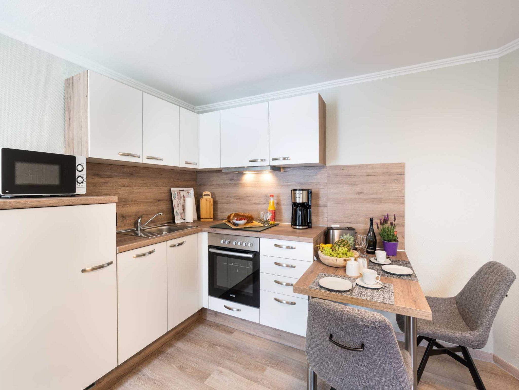• Küchenbereich: Offen, Backofen, Kühlschrank