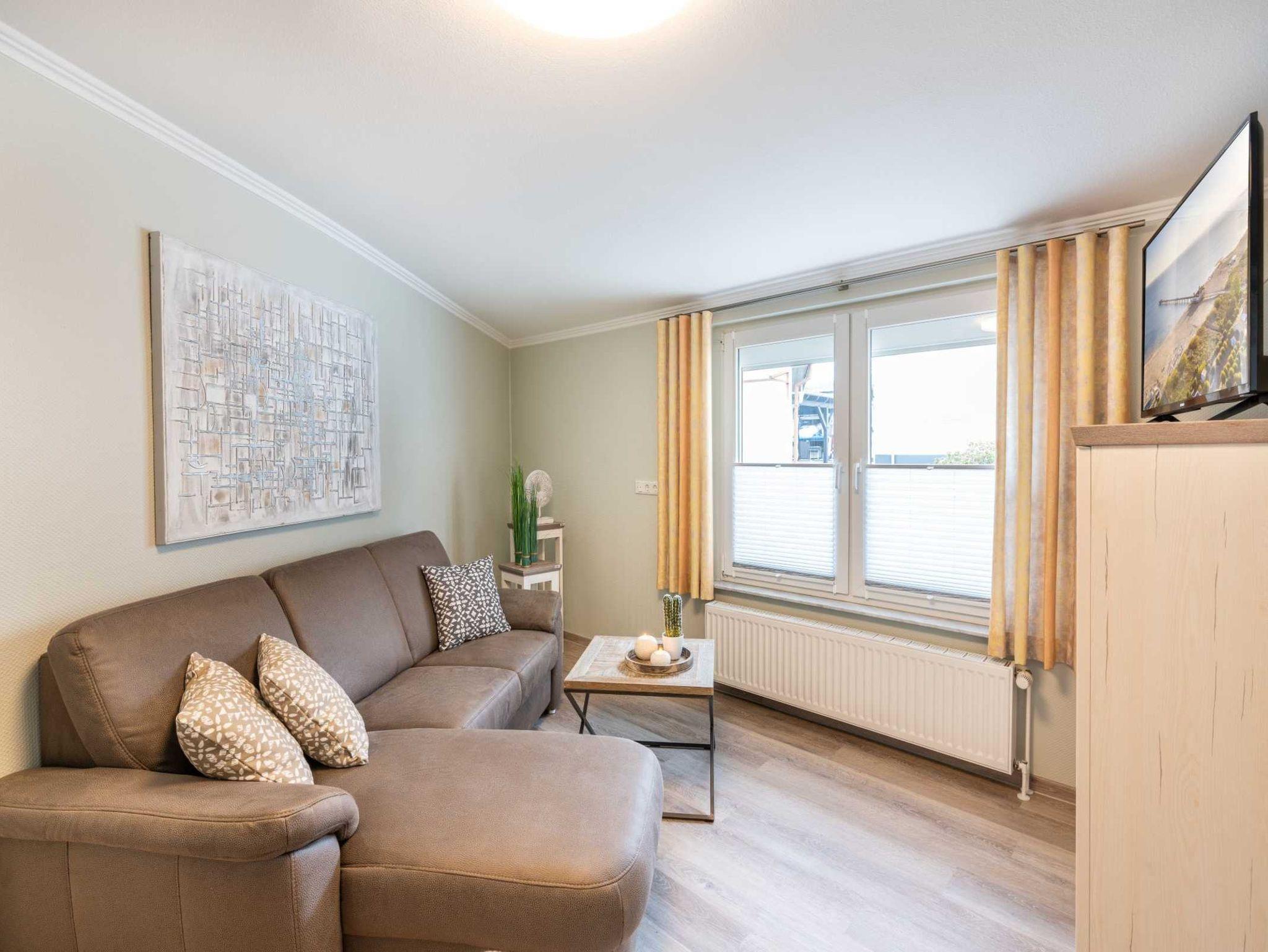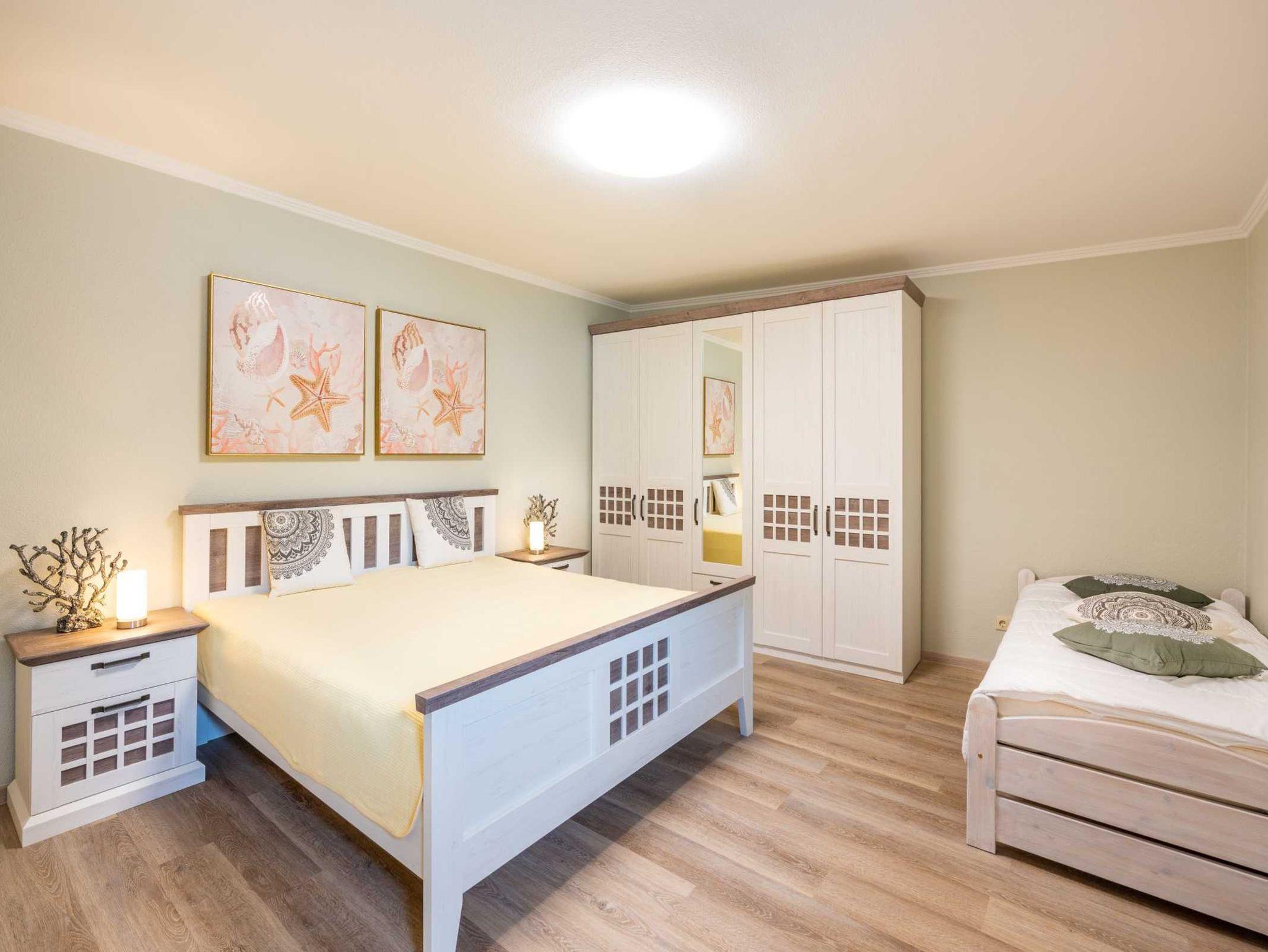 Im angrenzenden Schlafzimmer mit einem Doppelbett (180 x 200cm/getrennte Matratzen) können im Kleiderschrank Ihre persönlichen Dinge unterbringen. Auf der Schlafcouch im Wohnzimmer haben Sie besten Sitz- und Schlafkomfort für die 3. Person.