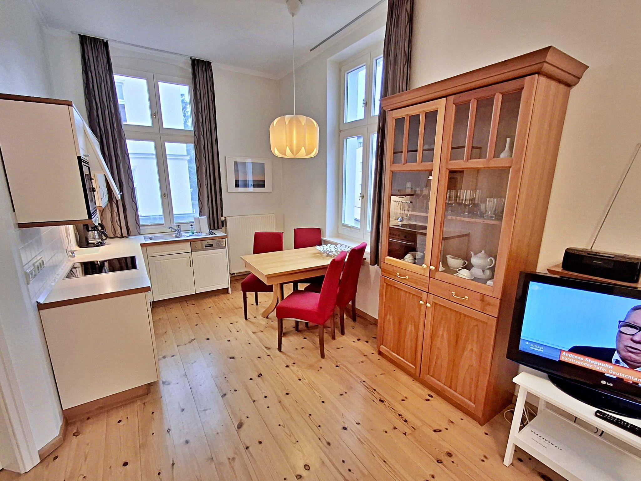 Die schöne 2-Zimmer-Wohnung Dierhagen mit Balkon im 1. Obergeschoss für max. 3 Erwachsene und 1 Kind bis 8 Jahre befindet sich in der stilvoll restaurierten Villa Ahlbeck - nur wenige Schritte von der Promenade und dem Strand entfernt. Im hellen Wohnbereich befinden sich neben einer gemütlichen Couch (Aufbettungsmöglichkeit für 2 Personen) auch ein Esstisch mit 4 Stühlen, der genügend Platz für 4 Personen bietet. Das Highlight der Wohnung ist der Balkon in West-Ausrichtung. Hier können Sie bereits morgens Ihren Kaffee genießen oder den Abend bei einem Glas Wein ausklingen lassen. Die moderne Küchenzeile mit Ceranherd, Backofen, Geschirrspüler, Mikrowelle, Kaffeemaschine, Wasserkocher und Toaster lässt keine Wünsche offen. Für die Unterhaltung sorgen ein Flachbild-TV, Radio-CD-Player und kostenfreies W-LAN. Das Schlafzimmer verfügt über ein Doppelbett und das Badezimmer hat Badewanne/WC.