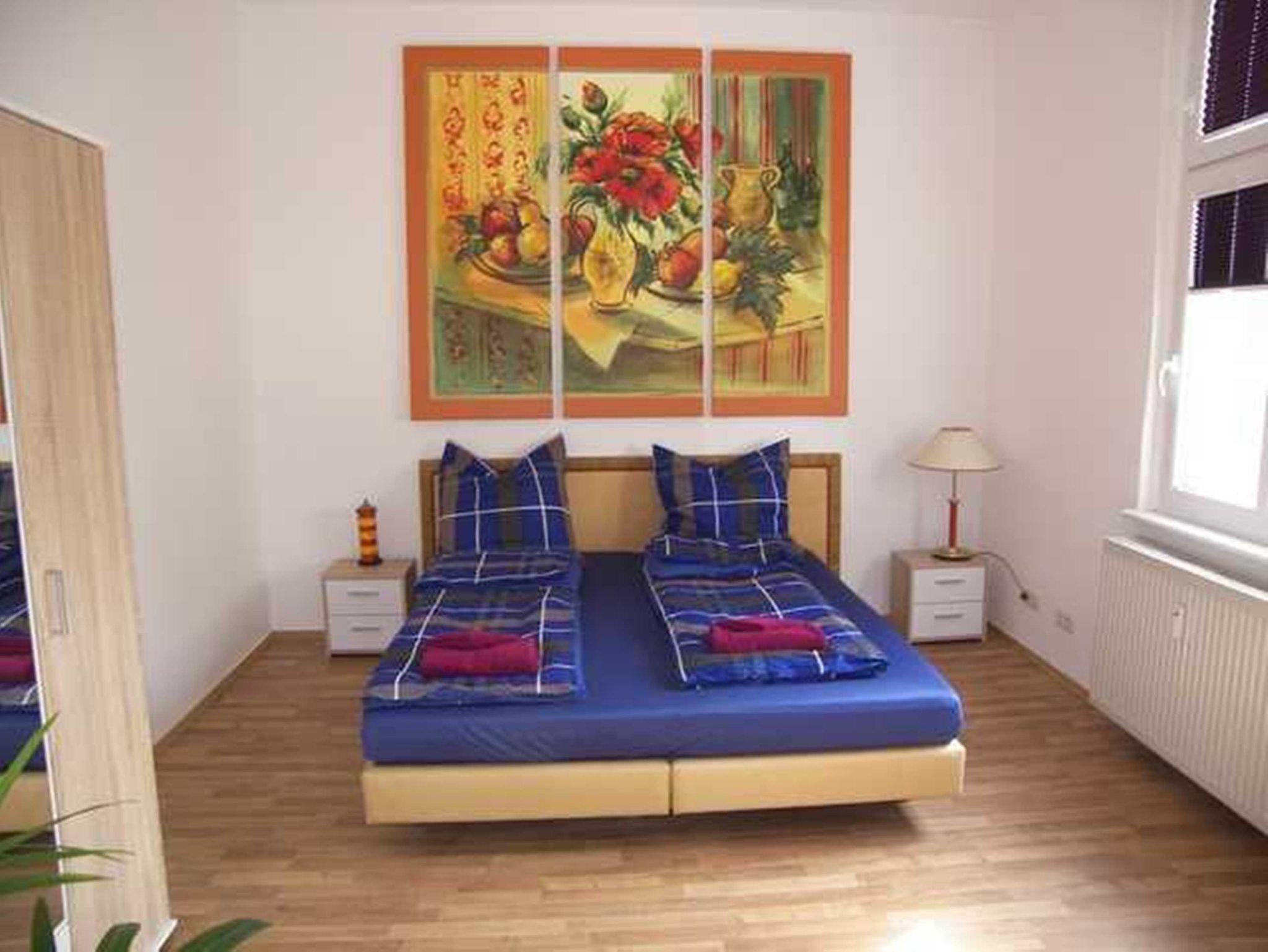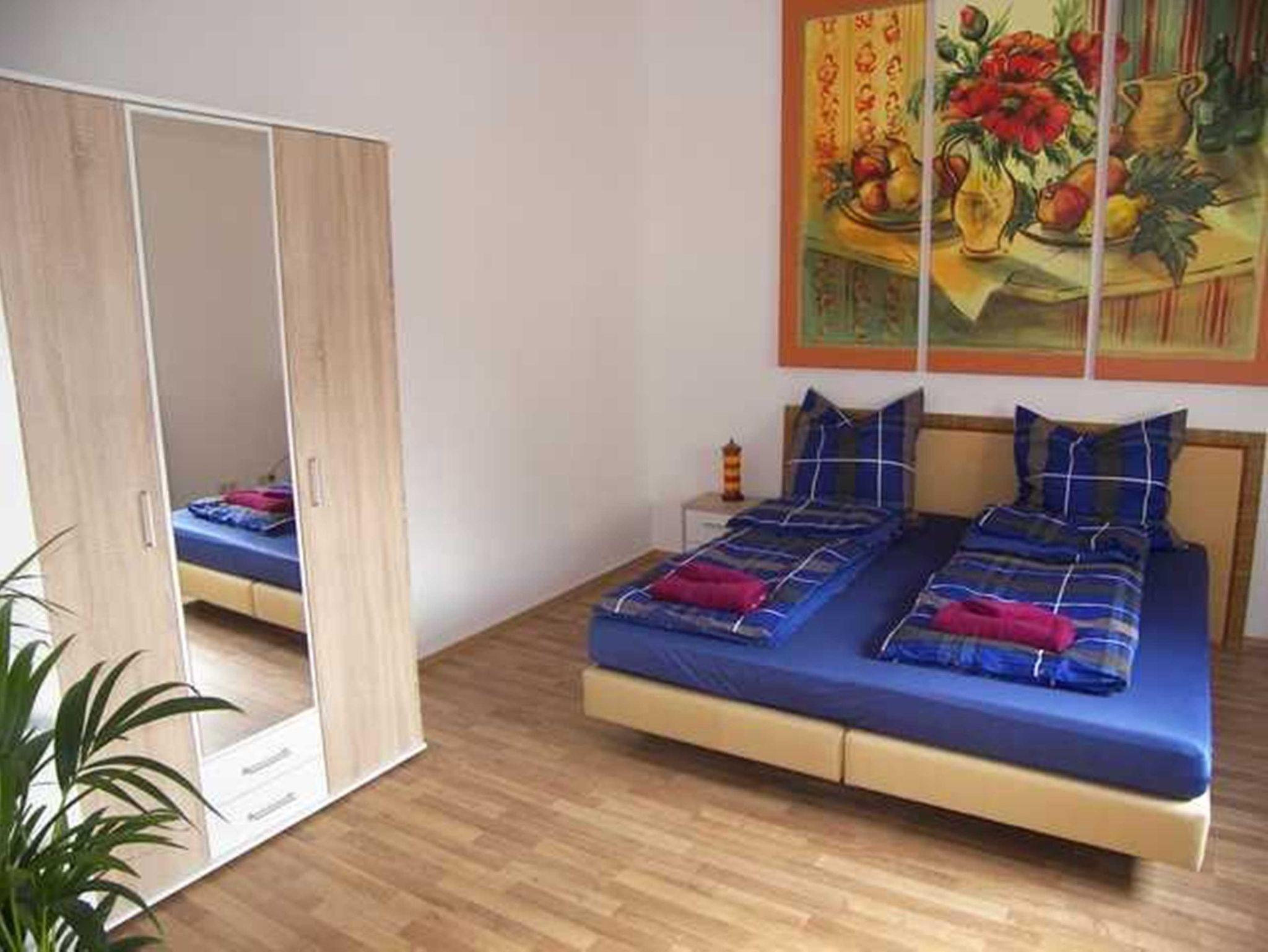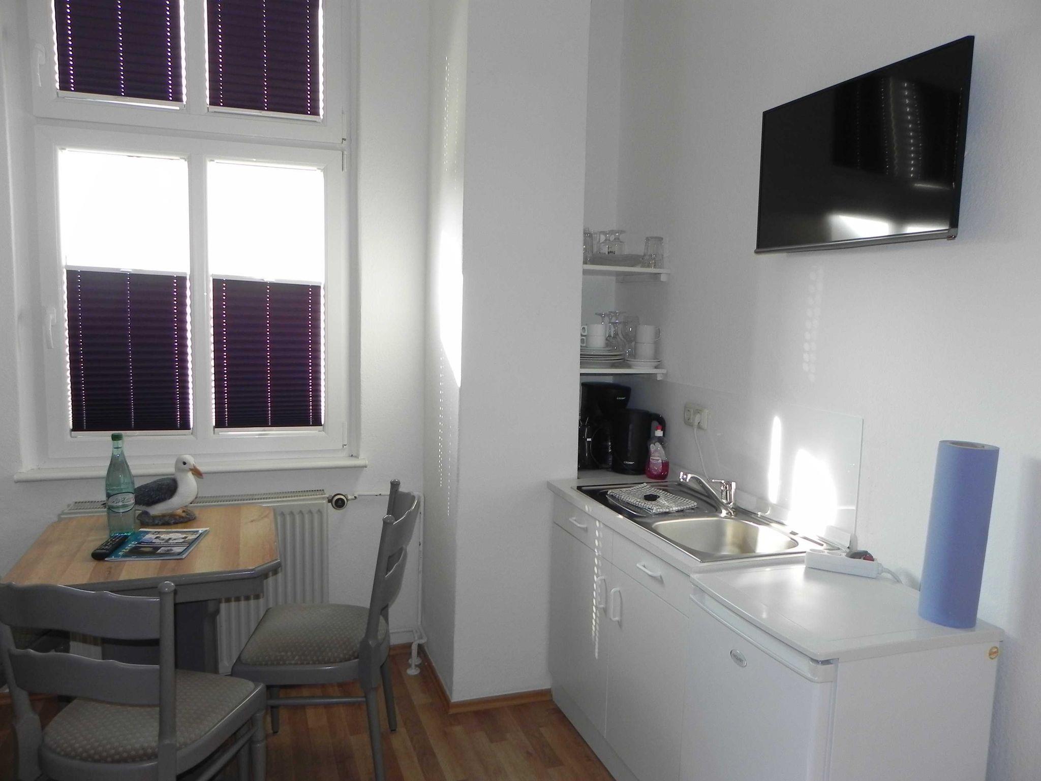 Die ca. 23 qm große neu renovierte 1 Raum Ferienwohnung befindet sich im Obergeschoss und ist ideal für 2 Personen geeignet. Der Schlafbereich mit Doppelbett und Kleiderschrank befindet sich in dem offenen Wohnraum, optisch von der Sitzecke getrennt. Innerhalb der Ferienwohnung befindet sich eine kleine Küchzeile ohne Kochmöglichkeit. Diese verfügt über ein Kühlschrank, Spüle, Wasserkocher, Toster und Geschirr. Das große Bad mit Fenster verfügt über eine große Dusche und WC. Die Erstausstattung Bettwäsche und Handtücher ist im Preis enthalten.