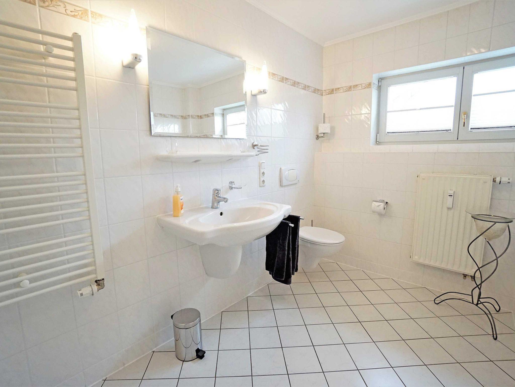 Desweiteren befindet sich im Obergeschoss das Badezimmer mit Dusche, Badewanne und WC.