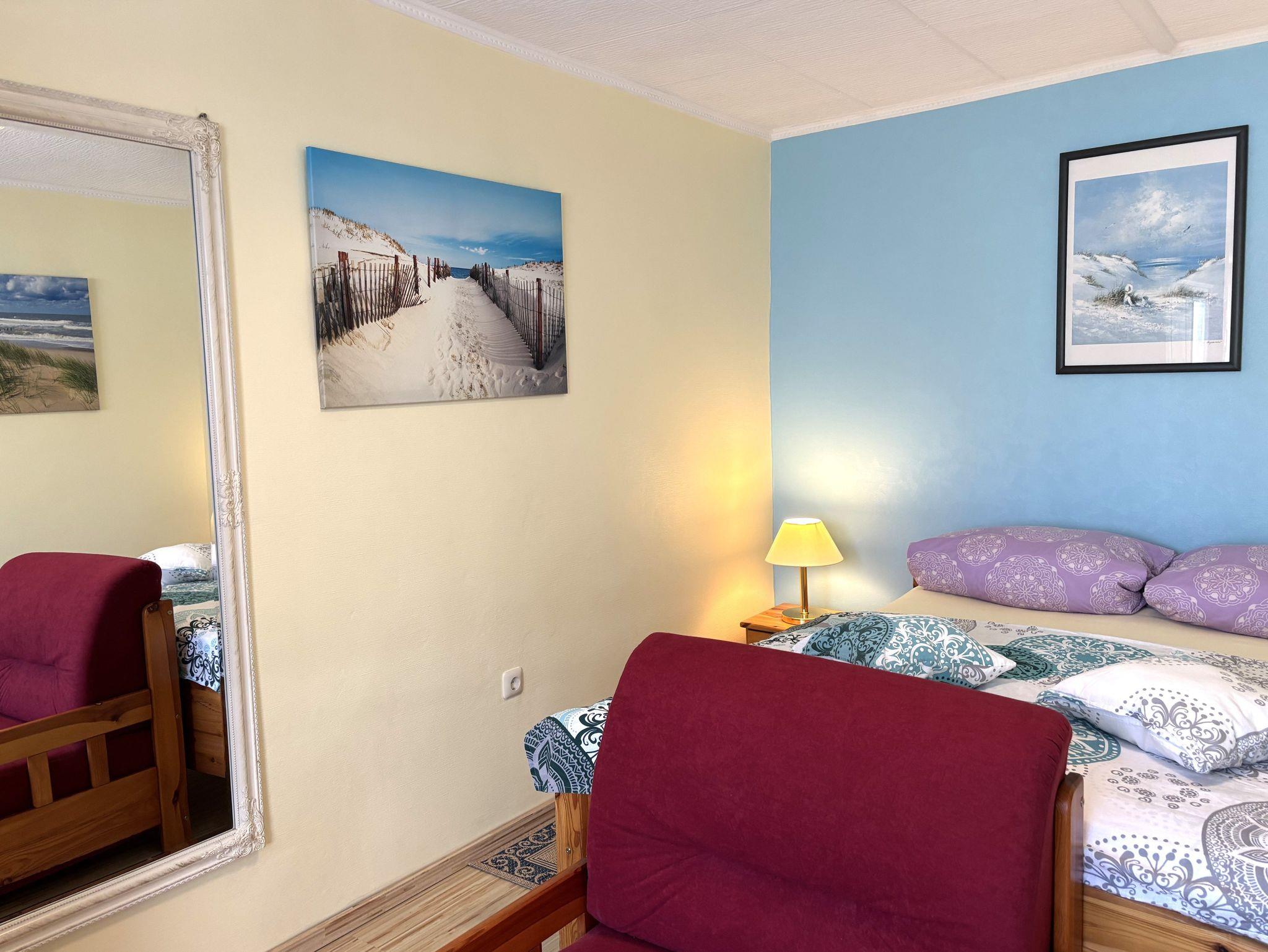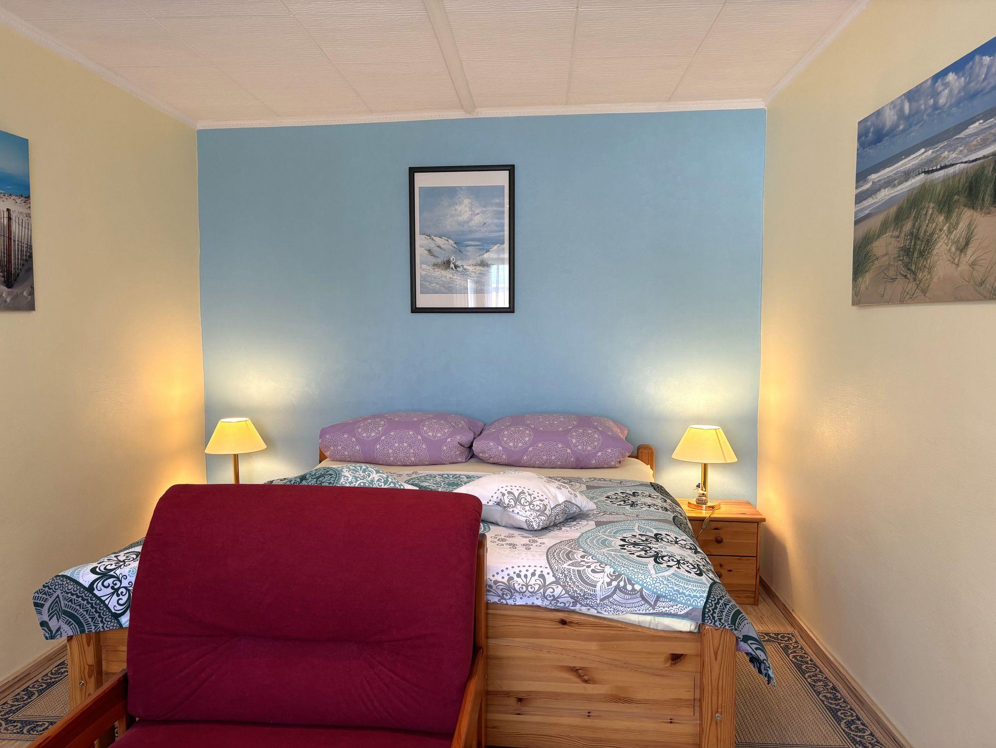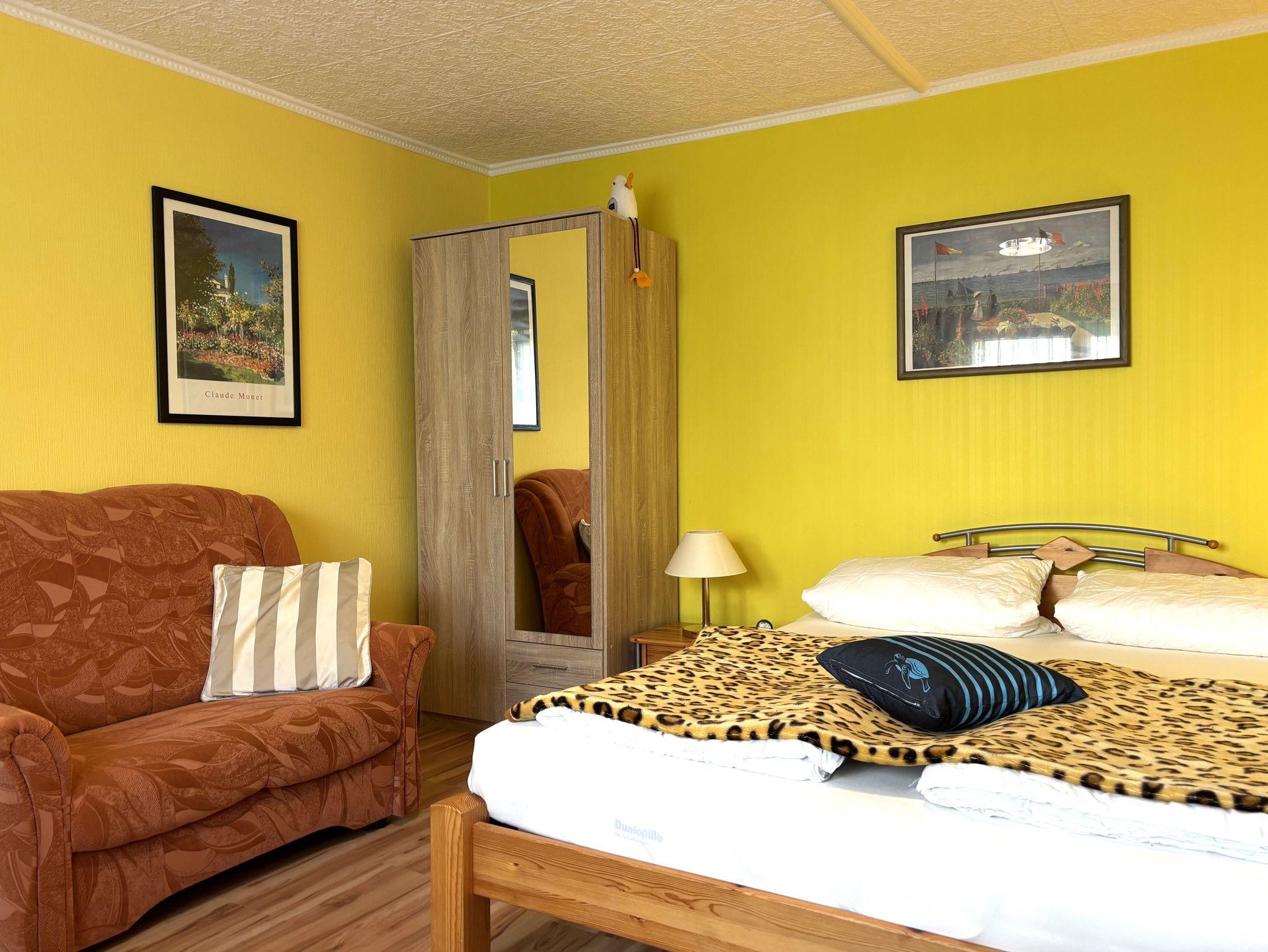 Ein Schlafzimmer ist mit einem Doppelbett ausgestattet und dient gleichzeitig als kombiniertes Wohn- und Schlafzimmer. Hier finden Sie zusätzlich eine gemütliche Couch sowie einen Fernseher für entspannte Abende.