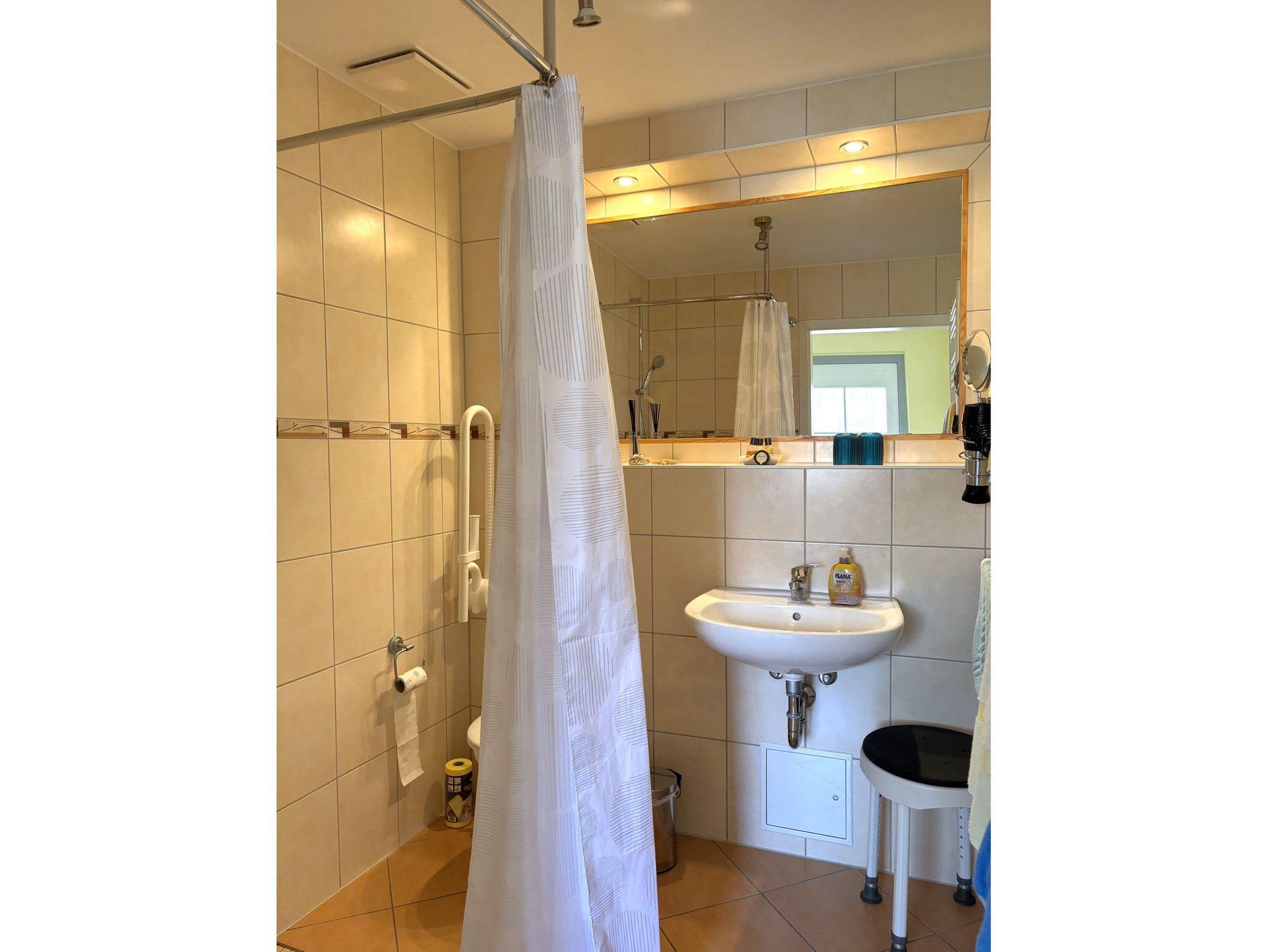 Das Badezimmer ist mit einer ebenerdigen Dusche, einem Waschbecken und einer Toilette ausgestattet. Für zusätzlichen Komfort und Sicherheit sorgen Haltegriffe in der Dusche und neben der Toilette.