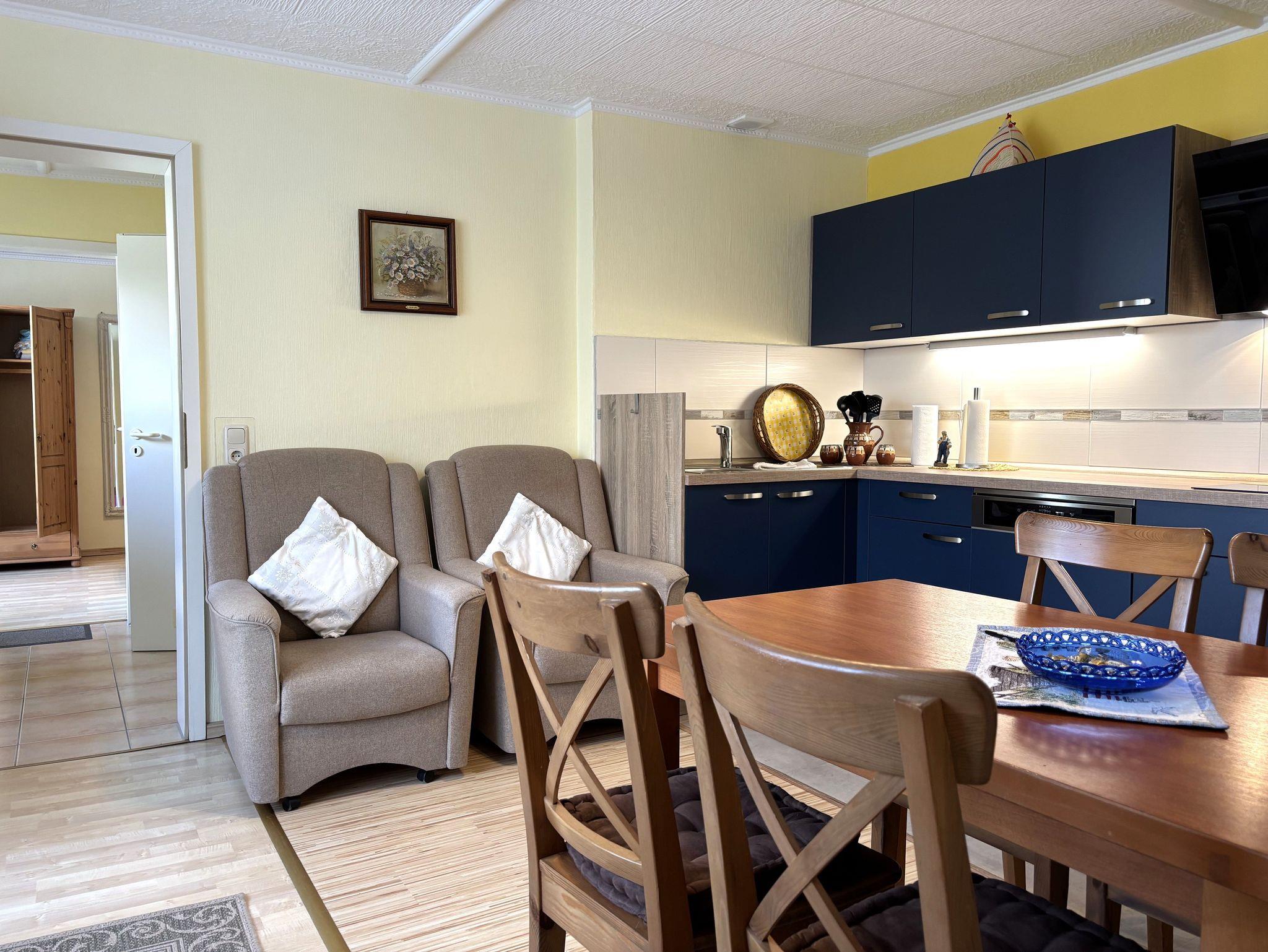 Die offene Küche ist vollständig ausgestattet und lässt keine Wünsche offen: Backofen, Herd, Geschirrspüler, Kühlschrank mit Gefrierfach, Kaffeemaschine, Toaster und Wasserkocher stehen Ihnen zur Verfügung. Neben dem Essplatz befinden sich in der Küche auch zwei bequeme Sessel sowie ein weiterer Fernseher, sodass auch hier ein gemütlicher Aufenthaltsbereich entsteht.