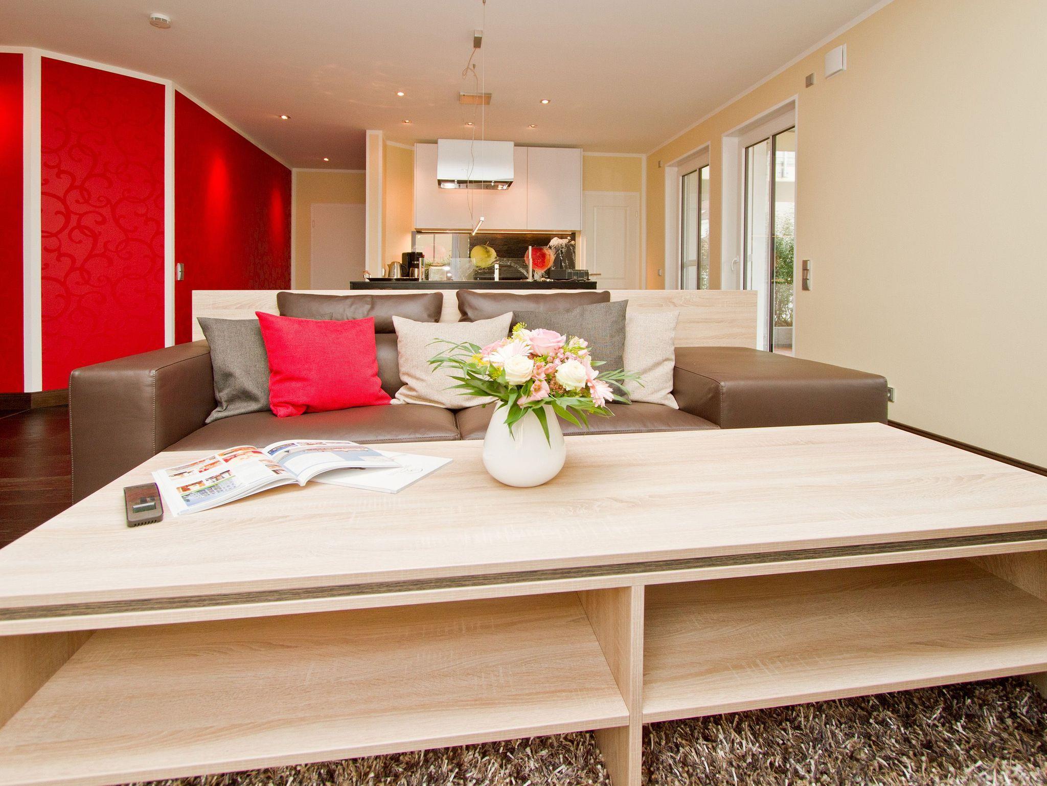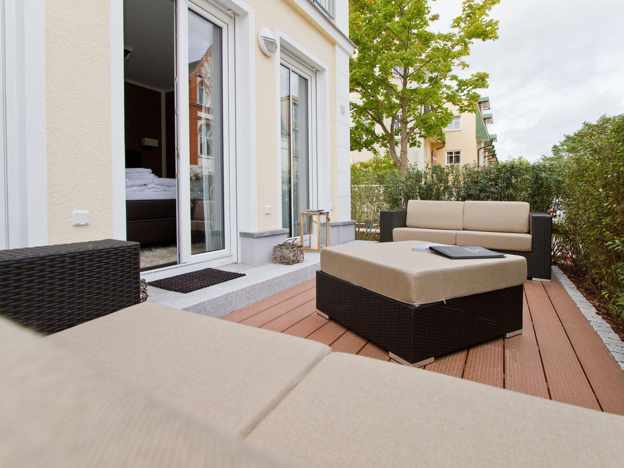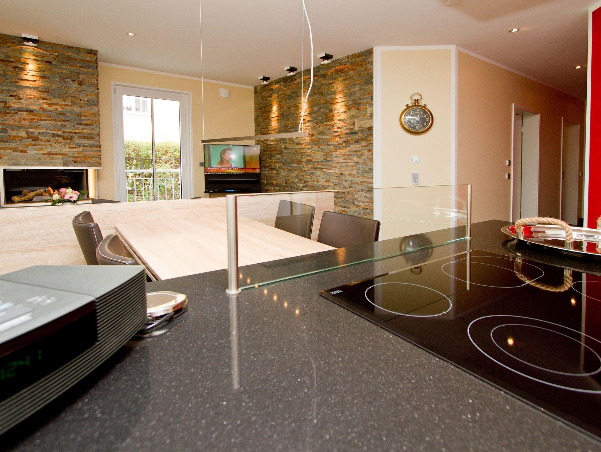 Stylische Farben und ein besonderer Look versprühen sofort das passende Urlaubsfeeling. Die schöne 3-Raum-Ferienwohnung (93 qm) befindet sich im Erdgeschoss des Hauses und bietet Platz für 4 Personen (inklusive Kleinkind bis 3 Jahre). An den schön gestalteten Wohnbereich mit bequemer Ledercouch, Flat TV, Blue-Ray-Player und modernem Design-Gaskamin (per Fernbedienung zu nutzen) schließt sich die offene Küche mit Essplatz an. Zwei Schlafzimmer mit Einbauten und hochwertigen Boxspringbetten der Firma Royal Auping (1,80m x 2,20m und 1,60m x 2,00 m) sorgen für bequemen Schlafkomfort (1 Schlafzimmer mit Flat TV). Im Bad mit Doppelwaschtisch und WC ist die wohnungseigene Sauna integriert, ein Highlight nicht nur in der kalten Jahreszeit. Auf der Terrasse zur Nordseite (Zugang vom Schlafzimmer) lässt es sich besonders gut in den Loungemöbeln Relaxen, die Südterrasse mit Gartenmöbeln und zwei Liegen lädt zusätzlich zum Verweilen ein. Für die Wohnung steht ein PKW-Stellplatz mit E-Ladestation am Haus zur Verfügung, ein WLAN- Netz im Haus kann kostenfrei genutzt werden. Für Ihren Komfort steht die Erstausstattung Wäsche für Sie bereit. Für Kleinkinder können ein Babyreisebett (ohne Matratze und Kinderbettzeug) und ein Kinderhochstuhl gegen einen Aufpreis bestellt werden.