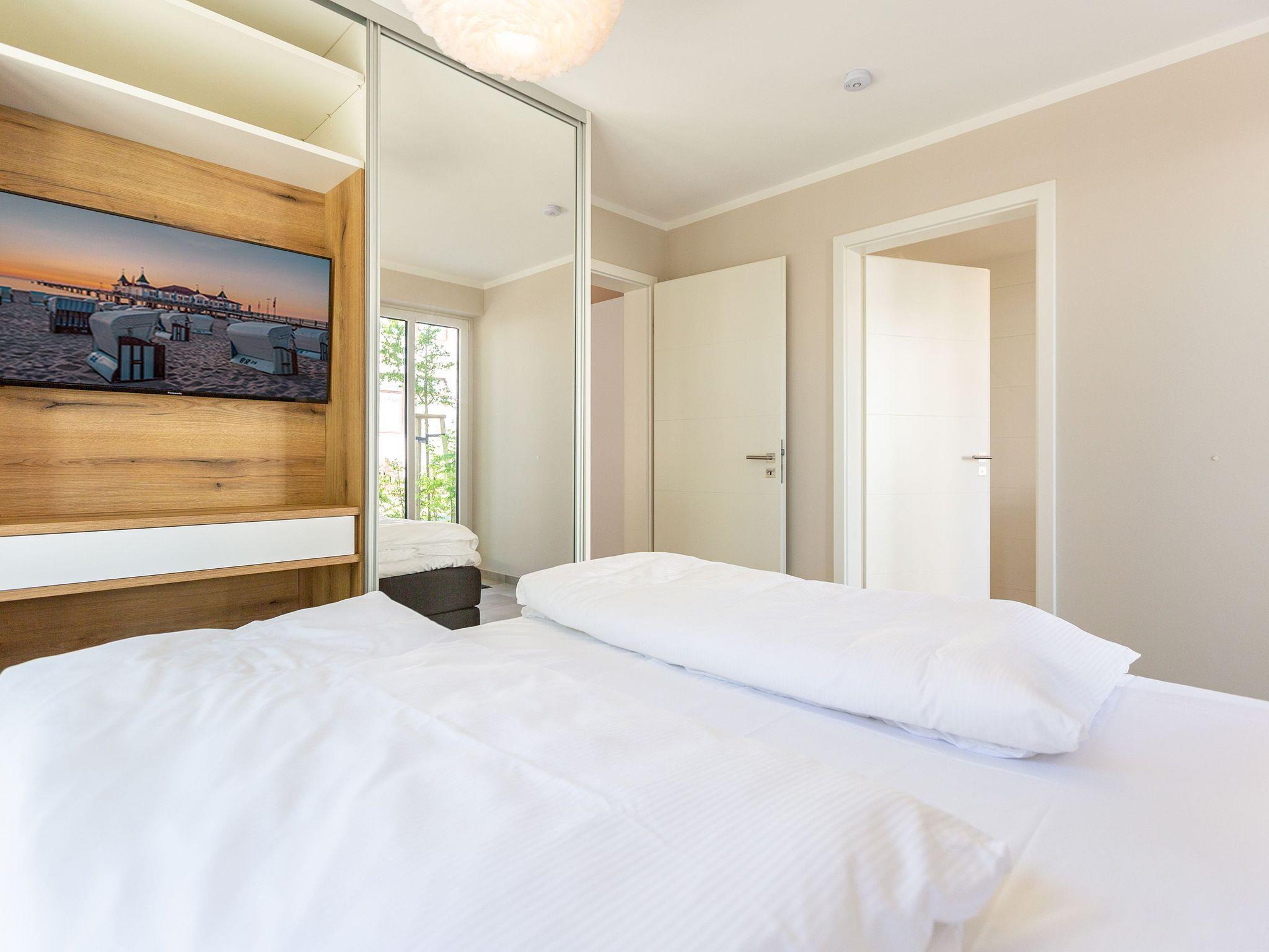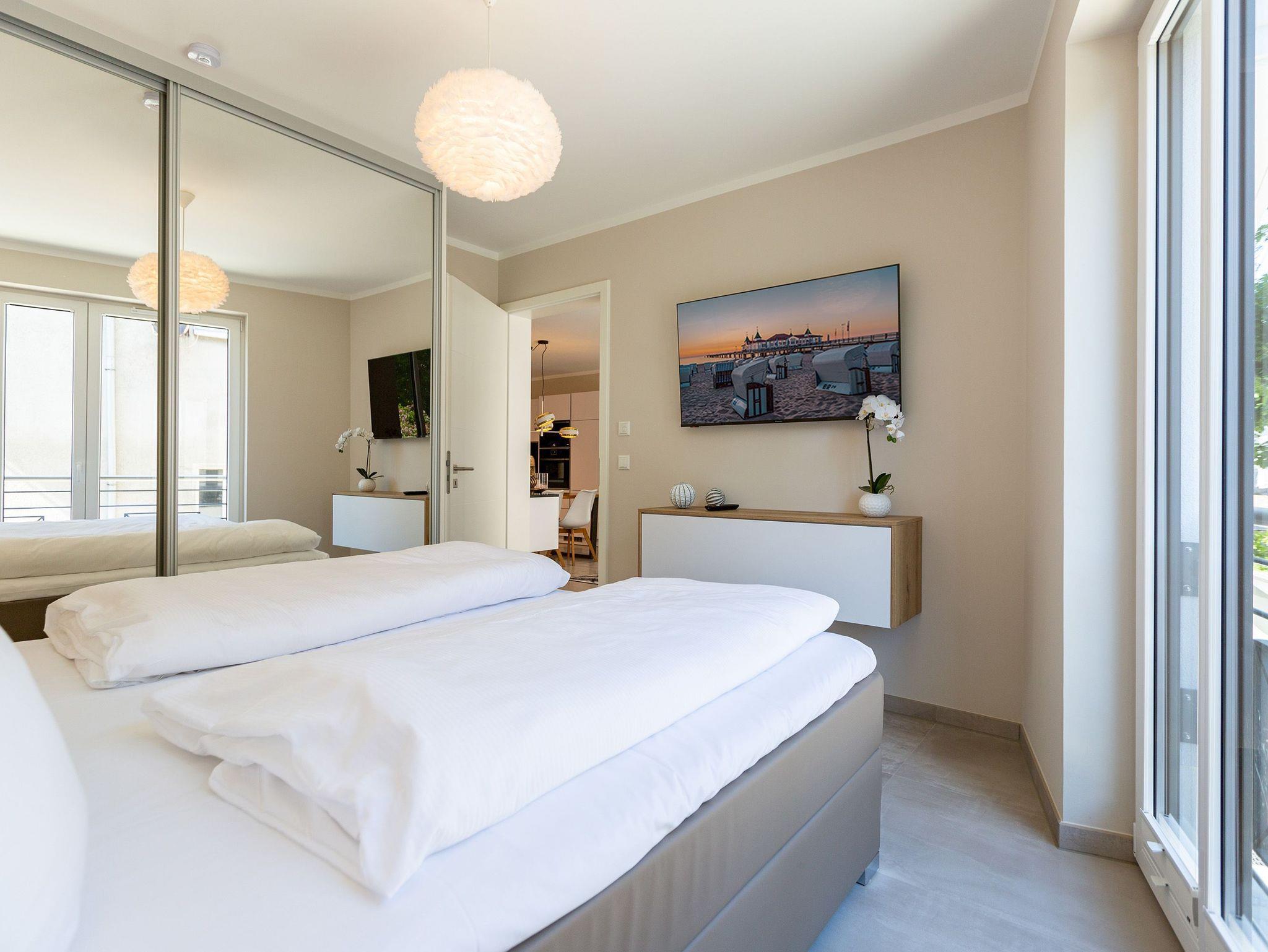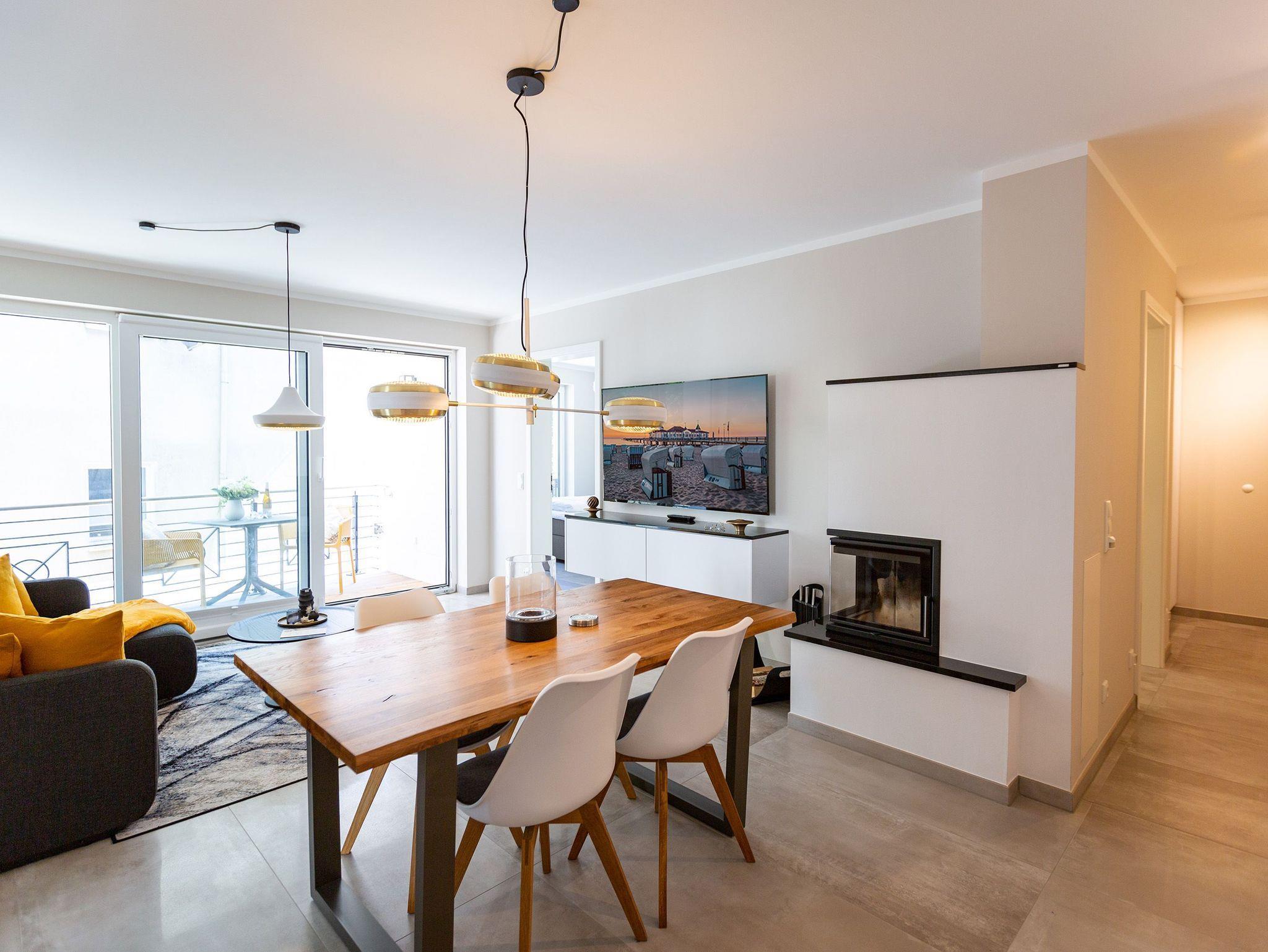Balkon oder doch lieber Terrasse? Dieses wunderschöne, moderne und helle 3-Zimmer-Appartement im Erdgeschoss vom Quartier Sieben bietet bis zu vier Personen die Qual der Wahl. Denn idyllisch und sonnenüberflutet sind sowohl der Süd-Ost-Balkon (5 Quadratmeter) als auch die großzügige Süd-West-Terrasse mit Gartenmöbeln (22 Quadratmeter). Auch sonst finden Sie in den 69 Quadratmetern Wohnfläche alles vor, was Sie sich für eine entspannte Auszeit an der Ostsee nur vorstellen können. Ein großes, offenes Wohn-Esszimmer ist der Treffpunkt zum Entspannen und Genießen. Ein stylisches, aber überaus gemütliches Sofa wird zusammen mit dem großen Flat-TV zum Home-Kino. Das WLAN-Netz ist kostenfrei nutzbar. An kühlen Abenden schenkt der Kamin eine kuschelige Atmosphäre. Ausgefallen und ein echter Hingucker ist das Design-Lampenkonzept. Die ins Wohnzimmer integrierte Küche ist Highend vom Feinsten. Hochwertige Markengeräte machen das Kochen und Zubereiten der Mahlzeiten zu einem Kinderspiel. Es ist alles vorhanden: Ein Induktionsherd, eine Spülmaschine, eine Mikrowelle und vieles mehr. Edles Geschirr finden Sie in den Schränken. Zum Essen und für gemeinsame Stunden ist der hölzerne Esstisch ideal. Zwei Schlafzimmer mit je einem großen und bequemen Boxspringdoppelbett (1,80 m x 2,00 m), Flat-TV und Kleiderschrank dienen als lauschige Rückzugsorte. Das Appartement verfügt über zwei Bäder. Beide sind mit einer Dusche und einem WC ausgestattet. Darüber hinaus besitzt eines der Bäder sogar eine finnische Sauna und einen Waschtrockner. Bei Anreise sind die Betten bezogen und Handtücher liegen bereit. Die Wohnung hat Fußbodenheizung. In der Tiefgarage ist für Ihren Pkw der Stellplatz Nr. 3 reserviert.