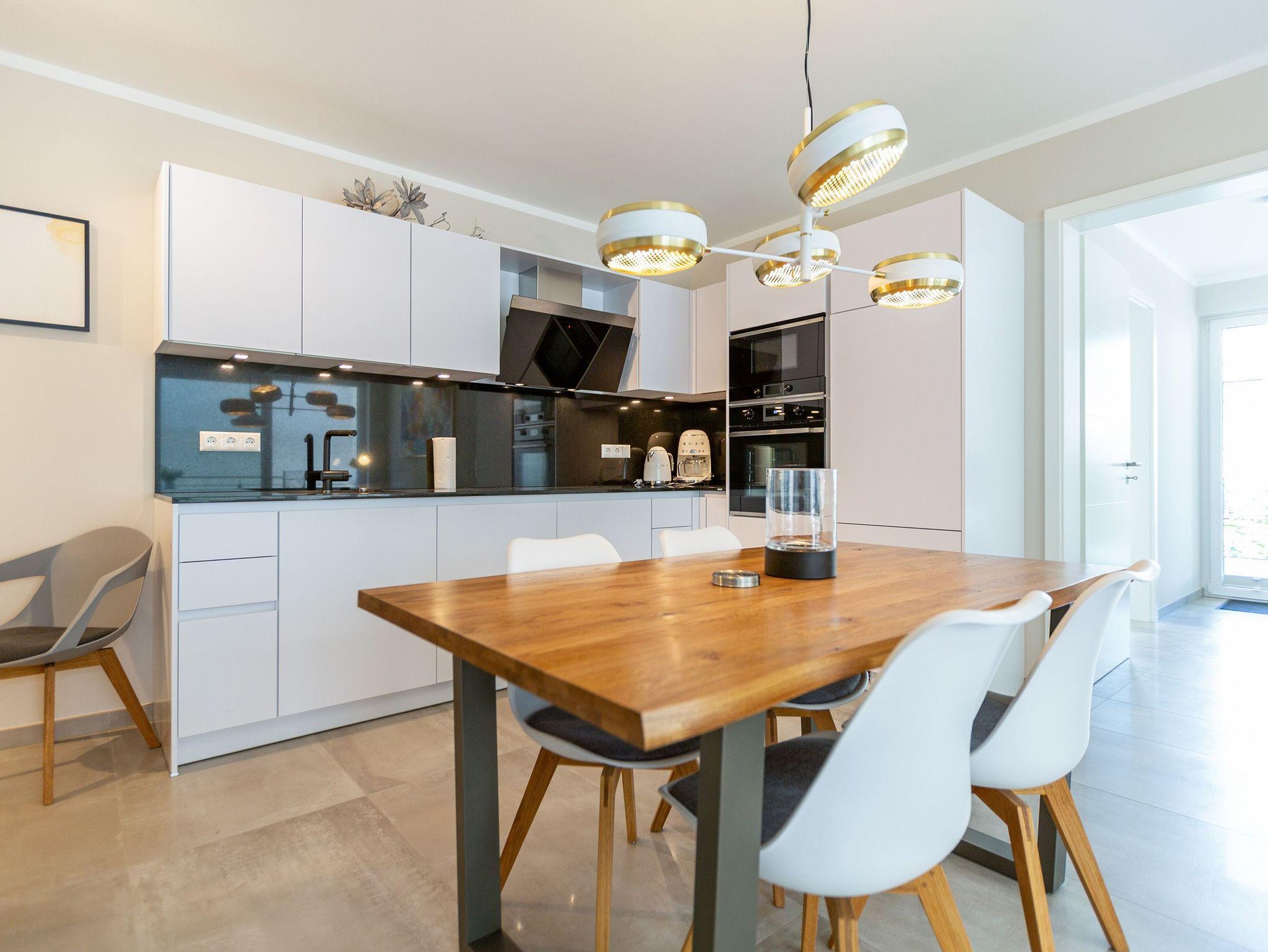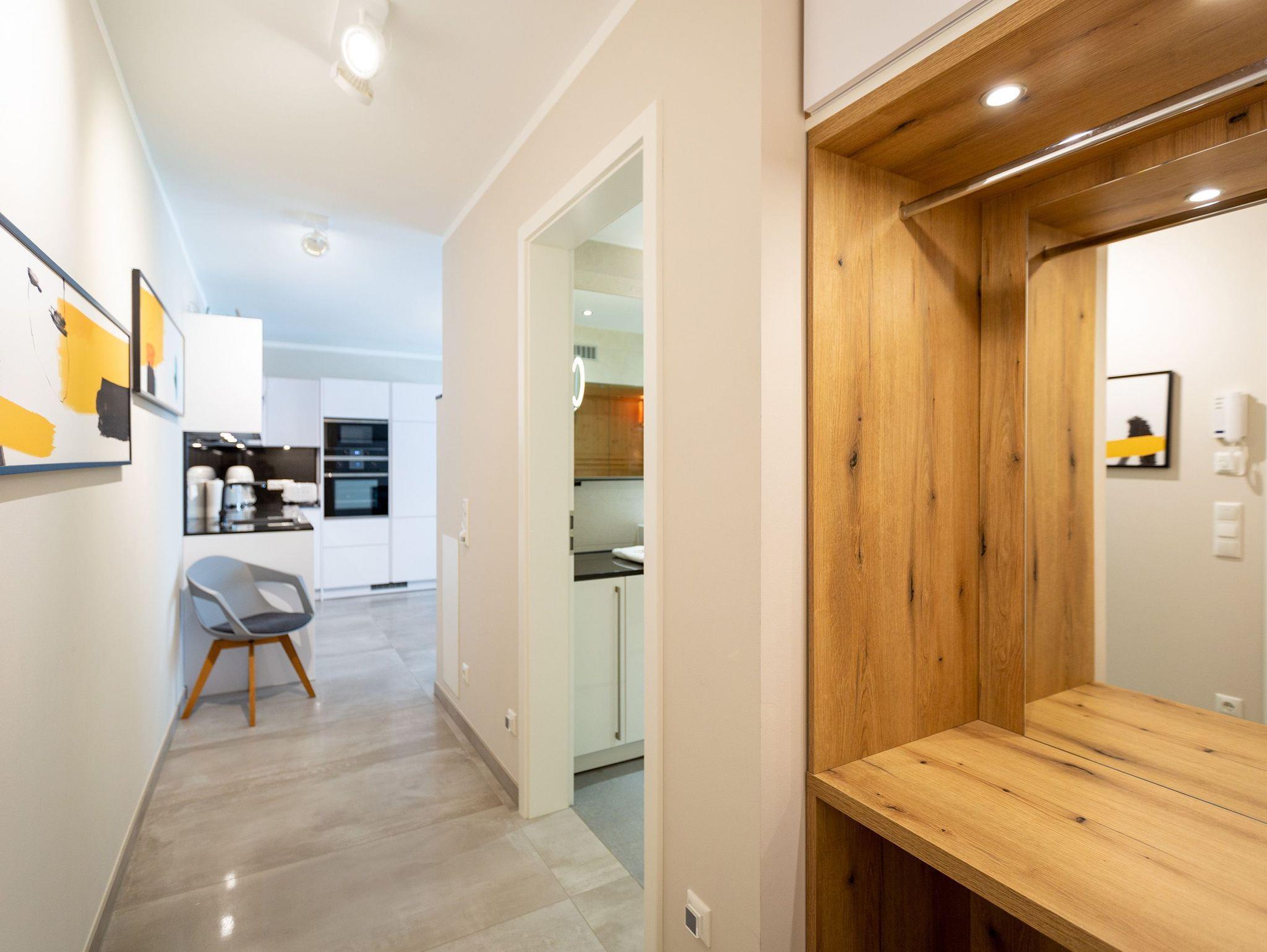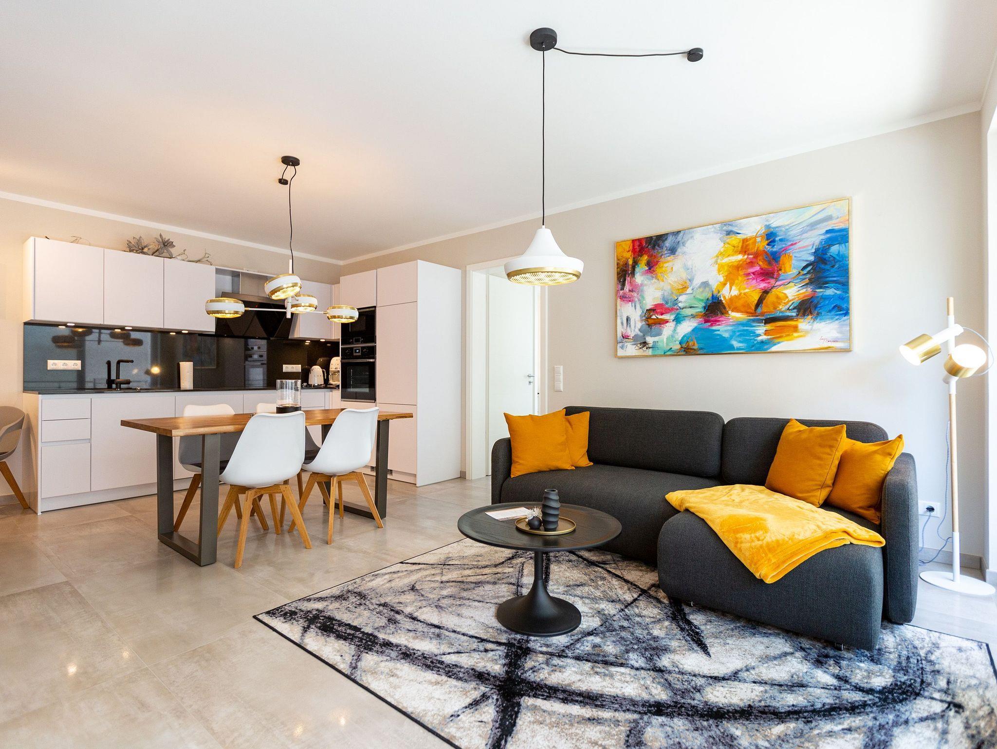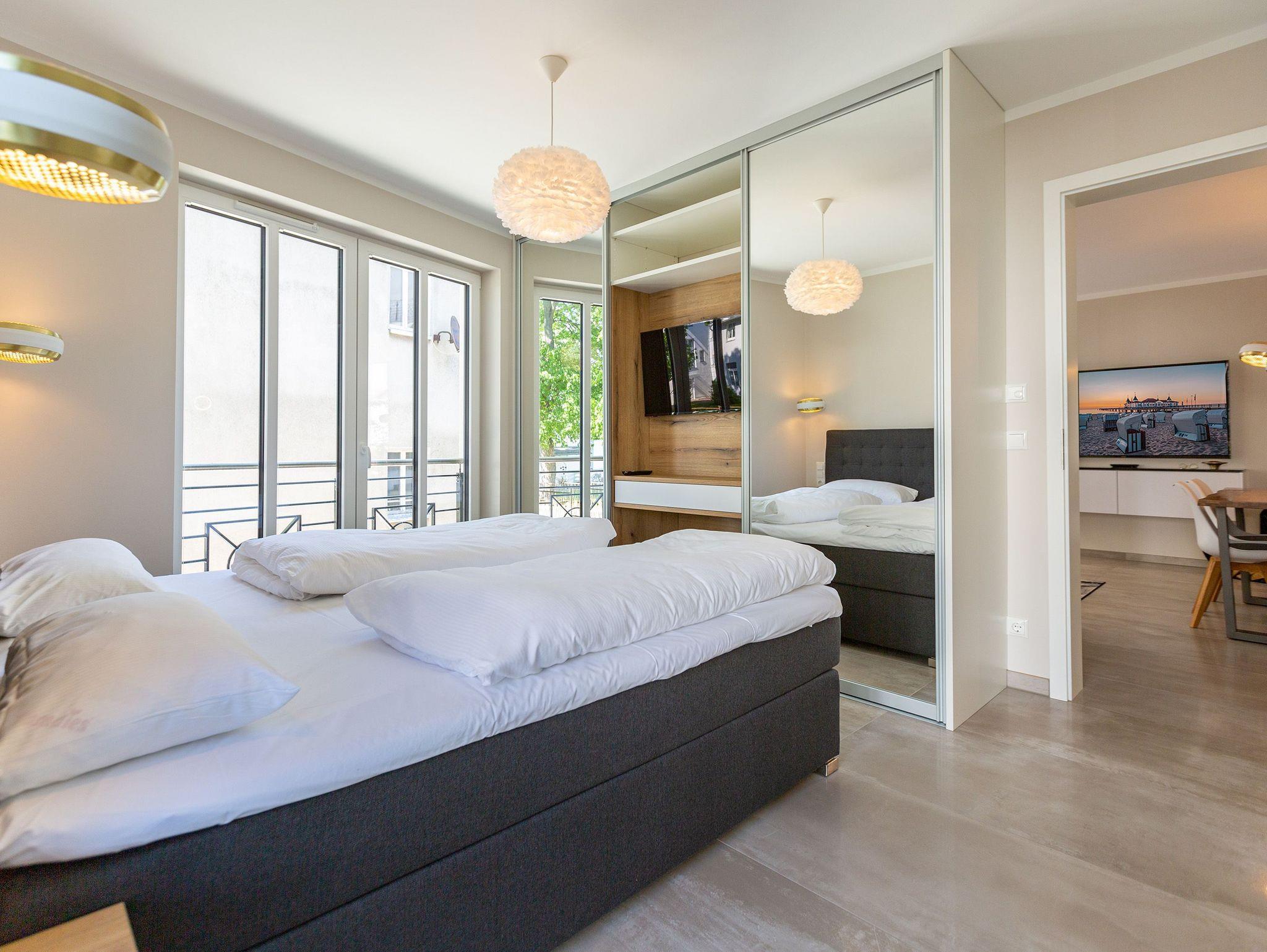 Balkon oder doch lieber Terrasse? Dieses wunderschöne, moderne und helle 3-Zimmer-Appartement im Erdgeschoss vom Quartier Sieben bietet bis zu vier Personen die Qual der Wahl. Denn idyllisch und sonnenüberflutet sind sowohl der Süd-Ost-Balkon (5 Quadratmeter) als auch die großzügige Süd-West-Terrasse mit Gartenmöbeln (22 Quadratmeter). Auch sonst finden Sie in den 69 Quadratmetern Wohnfläche alles vor, was Sie sich für eine entspannte Auszeit an der Ostsee nur vorstellen können. Ein großes, offenes Wohn-Esszimmer ist der Treffpunkt zum Entspannen und Genießen. Ein stylisches, aber überaus gemütliches Sofa wird zusammen mit dem großen Flat-TV zum Home-Kino. Das WLAN-Netz ist kostenfrei nutzbar. An kühlen Abenden schenkt der Kamin eine kuschelige Atmosphäre. Ausgefallen und ein echter Hingucker ist das Design-Lampenkonzept. Die ins Wohnzimmer integrierte Küche ist Highend vom Feinsten. Hochwertige Markengeräte machen das Kochen und Zubereiten der Mahlzeiten zu einem Kinderspiel. Es ist alles vorhanden: Ein Induktionsherd, eine Spülmaschine, eine Mikrowelle und vieles mehr. Edles Geschirr finden Sie in den Schränken. Zum Essen und für gemeinsame Stunden ist der hölzerne Esstisch ideal. Zwei Schlafzimmer mit je einem großen und bequemen Boxspringdoppelbett (1,80 m x 2,00 m), Flat-TV und Kleiderschrank dienen als lauschige Rückzugsorte. Das Appartement verfügt über zwei Bäder. Beide sind mit einer Dusche und einem WC ausgestattet. Darüber hinaus besitzt eines der Bäder sogar eine finnische Sauna und einen Waschtrockner. Bei Anreise sind die Betten bezogen und Handtücher liegen bereit. Die Wohnung hat Fußbodenheizung. In der Tiefgarage ist für Ihren Pkw der Stellplatz Nr. 3 reserviert.