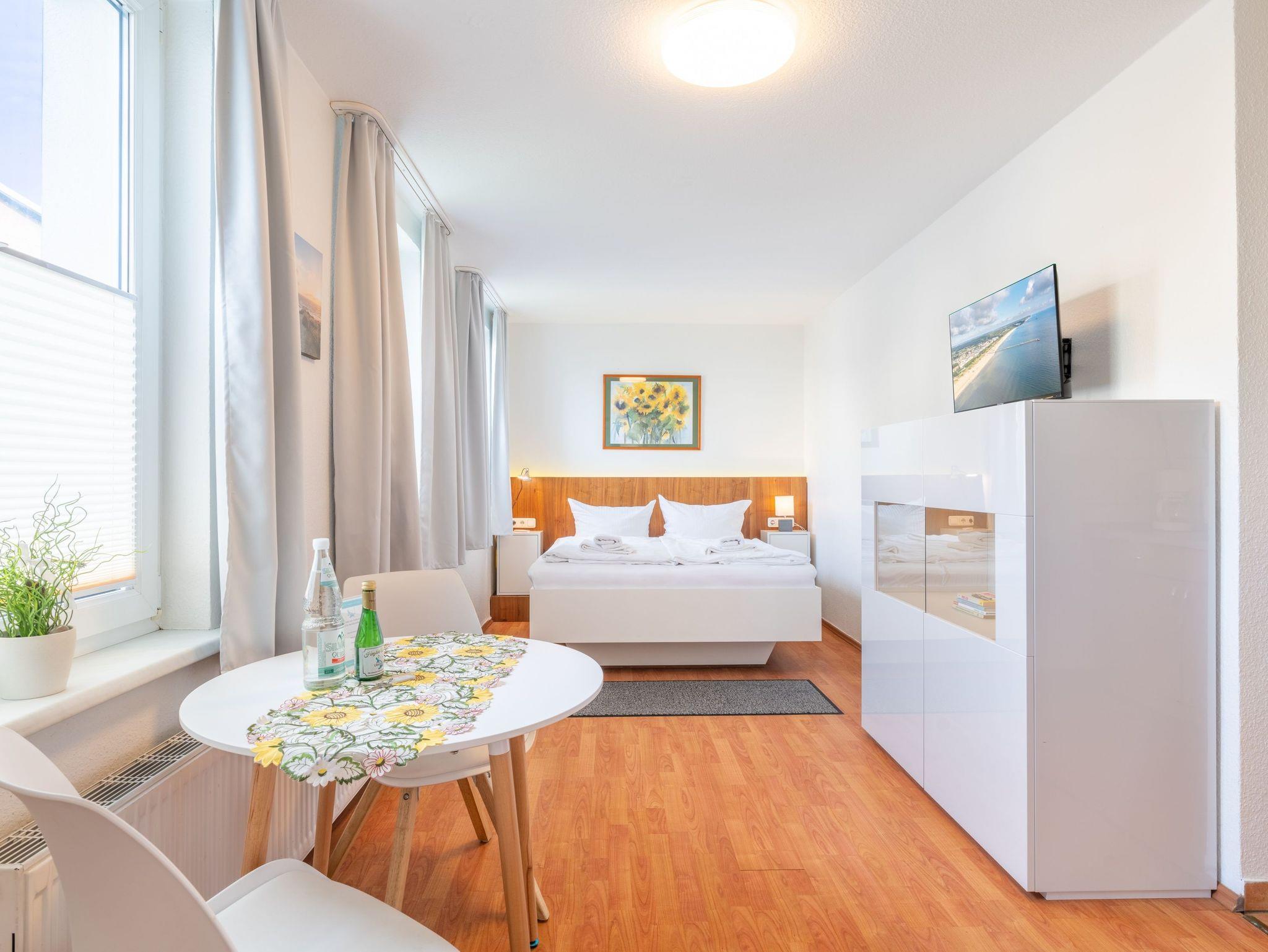 Das kuschelige 27 qm große Appartement im Erdgeschoss verfügt über einen kombinierten Wohn-/Schlafraum mit Doppelbett und Essplatz. Die offene Küchenzeile, ausgestattet mit 2-Platten-Herd, Kühlschrank, Mikrowelle mit Grillfunktion und vielen weiteren Küchenutensilien. Bad mit Dusche und WC. Eine Gemeinschaftssitzecke auf dem Hof steht zur Nutzung zur Verfügung.