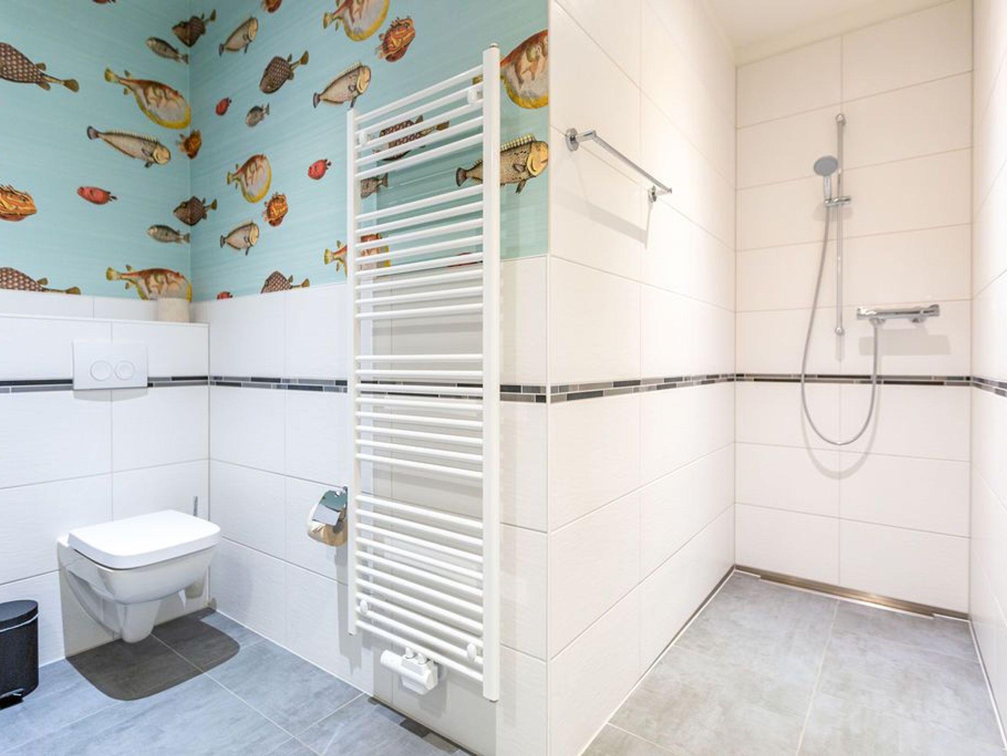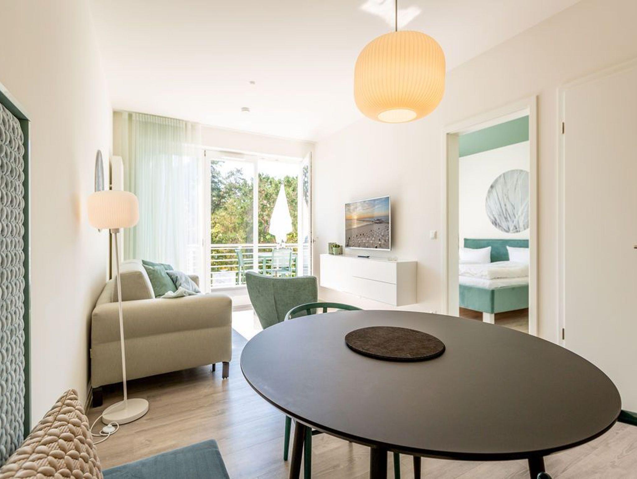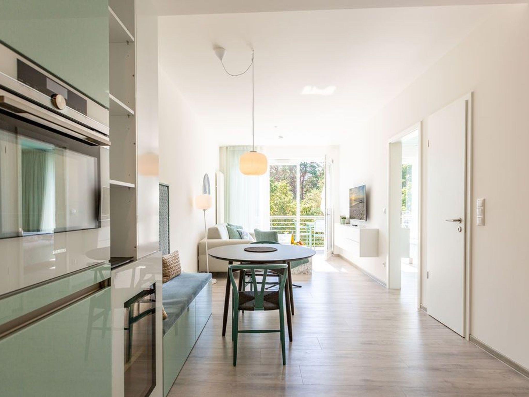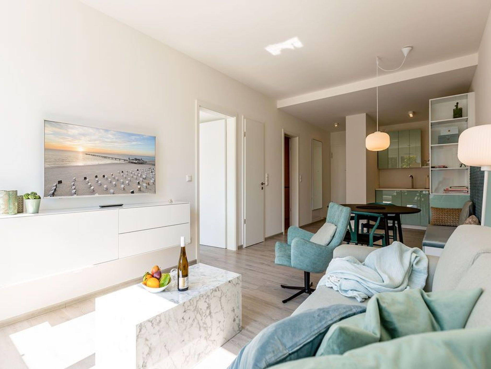 Dichter am Meer ist nur noch im Wasser. In diesem kuscheligen Appartement in der 3. Etage finden Sie Entspannung und Ruhe für Körper und Seele. Meeresrauschen ist hier inklusive. Bis zu drei Personen nebst geliebtem Haustier können es sich in den 53 Quadratmetern gut gehen lassen. Für die dritte Person besteht eine Aufbettungsmöglichkeit auf einem Schlafsofa im Wohnzimmer. Keine Sorge, Sie müssen keine Treppen bis in Ihr Urlaubsdomizil steigen. Es sei denn, Sie möchten es. Ansonsten trägt der Fahrstuhl Sie bis fast vor die Wohnungstür. Ab da heißt es nur noch licht- und luftige Leichtigkeit atmen und Hektik und Stress einfach hinter sich lassen. Die relaxte Urlaubsatmosphäre des Appartements hilft Ihnen ganz sicher dabei abzuschalten. Die Farben der Ostsee mit ihrem feinen Strandsand und dem hellen Dünengras durchziehen das gesamte Appartement. Eine komplette Glasfront erhellt das große und geschmackvoll eingerichtete Wohn-Esszimmer. Durch die bodentiefen Fenster können Sie auf den sonnenüberfluteten Süd-Balkon (7 Quadratmeter) hinaustreten. Ob Sonnenbad oder Freiluftessen ? wenn der Strand nicht rufen würde, käme man hier gar nicht wieder weg. Das Wohnzimmer wartet mit einem großen Flat-TV und bequemen Sitzmöglichkeiten mit Schlaffunktion auf. Das WLAN ist kostenfrei nutzbar. Genießen Sie die Mahlzeiten am schönen Esstisch. Zubereiten können Sie sie auf dem Induktionsherd oder im Backofen mit Mikrowellenfunktion in der offenen Wohnküche. Die Küche ist mit allen nötigen Geräten in Markenqualität ausgestattet. Auch ein komplettes Geschirr-Set befindet sich in den Schränken. Den Abwasch übernimmt anschließend der Geschirrspüler. Für Liebhaber erlesener Tropfen birgt die Küche noch ein kleines Highlight. In einem Extra-Weinkühlschrank können Sie die edlen Rebensäfte auf der richtigen Trinktemperatur halten. Das Appartement verfügt über ein separates Schlafzimmer mit einem Doppelbett (1,80 m x 2,00 m), einem geräumigen Einbaukleiderschrank und ebenfalls einem Flat-TV. Auch das Schlafzimmer hat einen Zugang zum Balkon. Unter dem Meer ? so könnte das Motto des Badezimmers lauten. Langweilig wird es dank der außergewöhnlichen Wanddekoration hier garantiert nicht. Darüber hinaus ist das Bad auch mit allem, was ein Bad ebenso braucht, ausgestattet: Dusche, Waschtisch und WC. Auch Handtücher liegen schon bereit. Die Betten sind bei Ihrer Anreise bezogen. In der Garage ist im Doppelparker (oben) die Nummer 37 für Sie reserviert (Fahrzeughöhe max. 1,90 m).