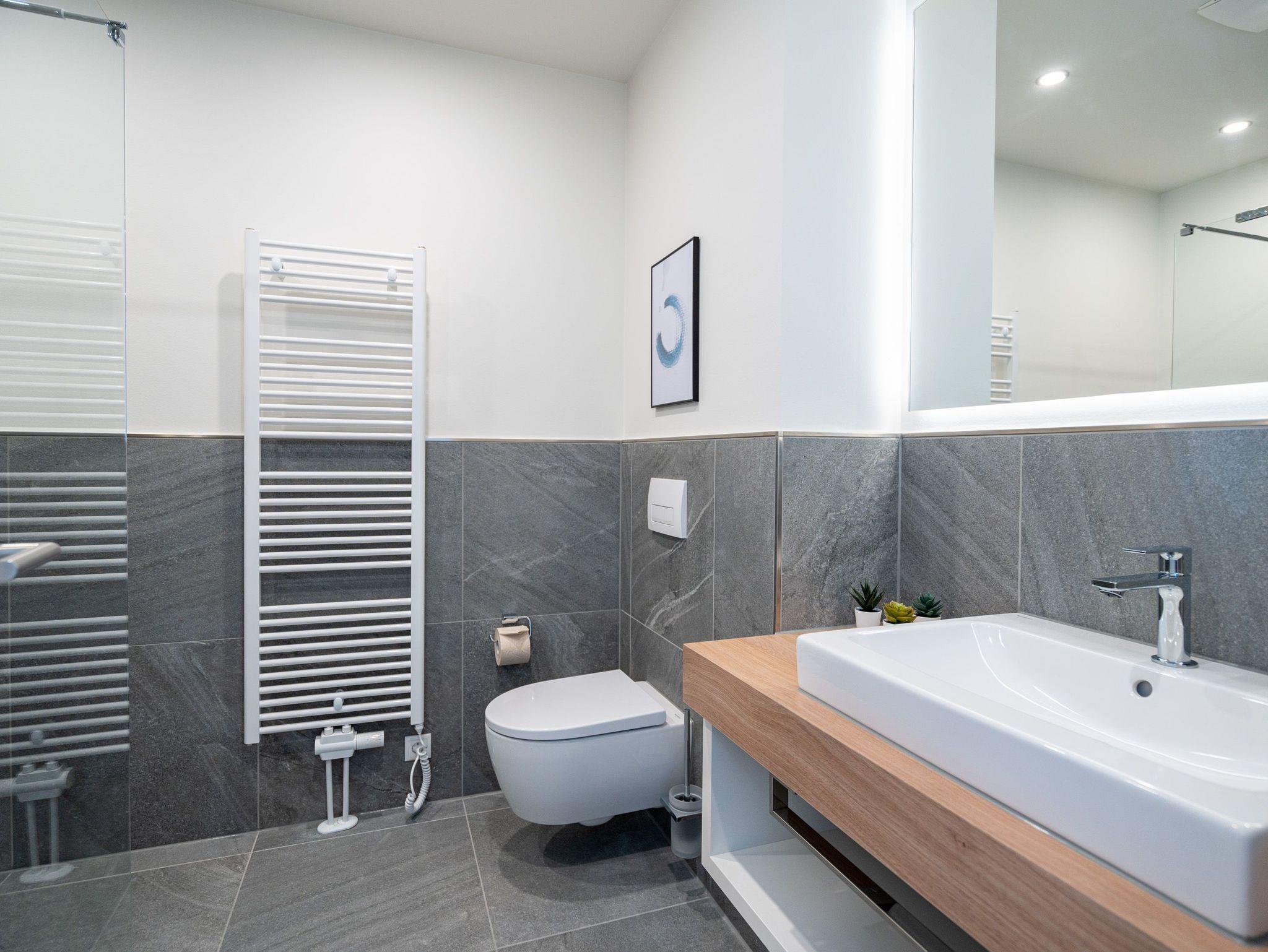 Die 2024 fertig gestellte Strandterrasse liegt direkt an der belebten Strandpromenade und bietet einen einzigartigen Ausblick auf die Grand Dame der historischen Seebrücken sowie die historische Konzertmuschel, einem beliebten Treffpunkt für Kunst und Kultur. Dahinter liegt die Ostsee ? ein Panorama, das zu den schönsten in den Kaiserbädern gehört. Es ist wie das Abtauchen in eine andere Zeit. In eine Zeit, in der man mit Stock, Sonnenschirm und Hut fürs „Sehen und gesehen werden“ über die Promenade schlenderte; aber auch in eine Zeit, in der ? damals wie heute ? Zeit einmal für eine kurze Weile keine Rolle spielt. Weil man angekommen ist im Loslassen, Entspannen und Genießen. Es ist dieser besondere Geruch nach Meeresluft und Freiheit, der in Erinnerung bleibt. Dazu die Bilder, die man mitnimmt. Von langen Strandspaziergängen, vom Lachen in fröhlich schäumenden Ostseewellen, von der Zeit in einem wunderschönen Urlaubsdomizil. Denn genau das ist die Strandterrasse mit ihren 56 modernen und exklusiven Ferienappartements direkt gegenüber der Ahlbecker Seebrücke. Die Ein-, Zwei- oder Dreizimmerwohnungen ? zwischen 40 und 70 Quadratmeter groß ? sind von einer Innenarchitektin gemeinsam mit unserem Erfahrungsschatz an Gästewünschen mit viel Liebe zum Detail und ganz individuell konzipiert worden. Entspannung und Wohlfühlen stehen an erster Stelle. Alles ist aufeinander abgestimmt und sorgt für eine gemütliche Atmosphäre. Wählen Sie zwischen einem Domizil in einem hellen, sandfarbenen Designkonzept oder einem Appartement mit anthrazitfarbenen Farbakzenten. Alle Appartements verfügen gleichermaßen über eine stilvolle und komfortable Einrichtung, die passgenau angefertigt worden ist, sowie über moderne Küchen und Bäder. Jedem Schlafzimmer ist ein eigenes Bad mit Dusche zugeordnet (außer App. B4.5). Die Appartements besitzen fast alle einen Balkon ? viele schauen sogar zur Ostsee hinaus. Die meisten Feriendomizile haben einen Elektrokamin und Infrarotsaunen. Im Erdgeschoss befindet sich ein separater Gemeinschaftsraum für Fahrräder. Außerdem besteht die Möglichkeit, im Gemeinschaftswaschraum 2 Waschmaschinen [&] Trockner zu nutzen. Ergänzt wird das Angebot durch eine Gemeinschaftssauna, die täglich von 11:00 bis 22:00 Uhr nutzbar ist. In der Tiefgarage (Einfahrtshöhe 2,03 Meter) steht für jede Wohnung 1 Pkw-Stellplatz zur Verfügung. Ist alles zur Zufriedenheit untergebracht? Dann kann der Urlaub ja beginnen. Und beim Blick vom Balkon über die Ostsee treffen sich zum Sonnenaufgang das Heute und das Damals. Gelassenheit legt sich beim Gang hinunter an den Strand auf die Seele. Jetzt darf die Zeit stehenbleiben.