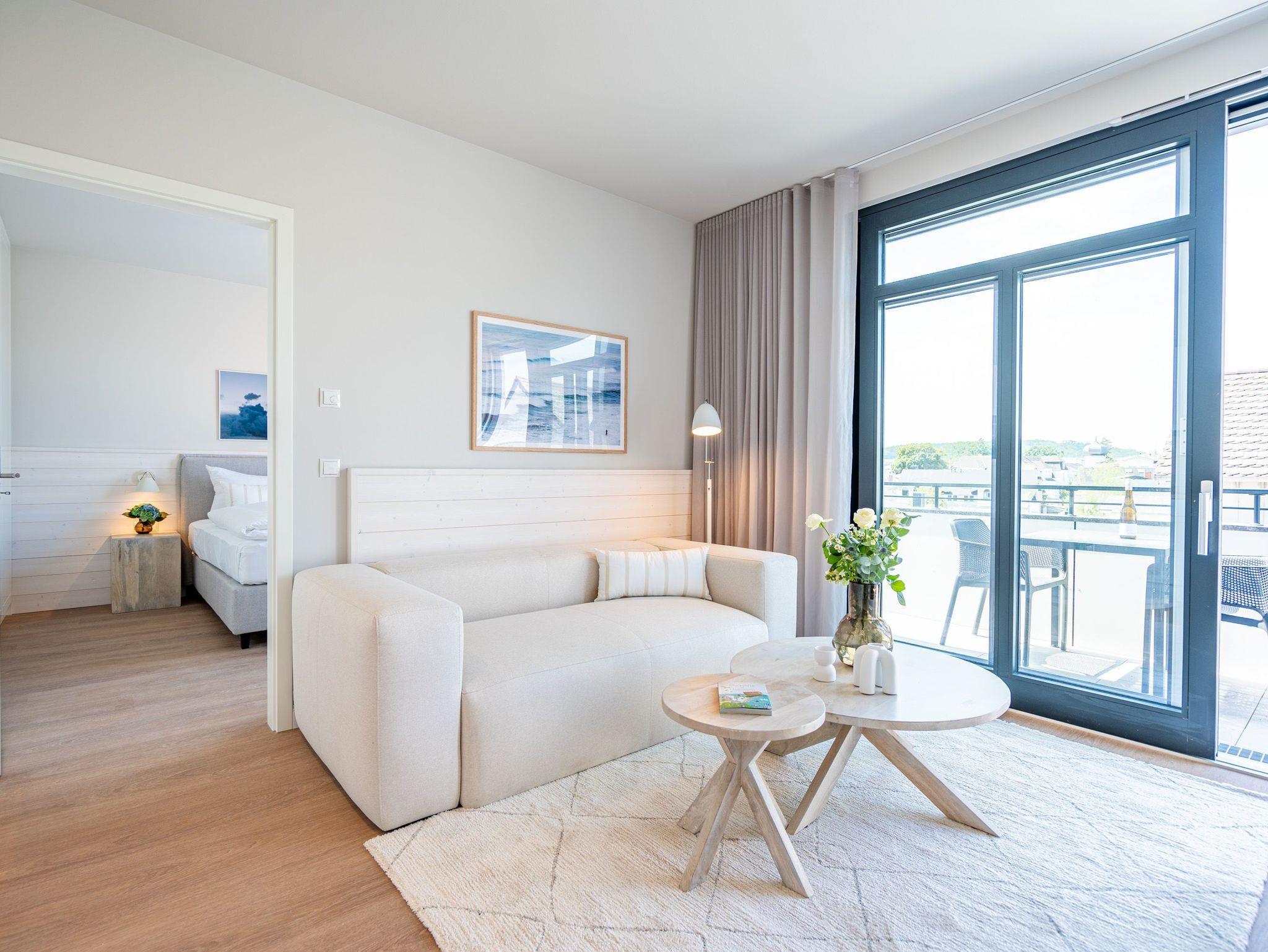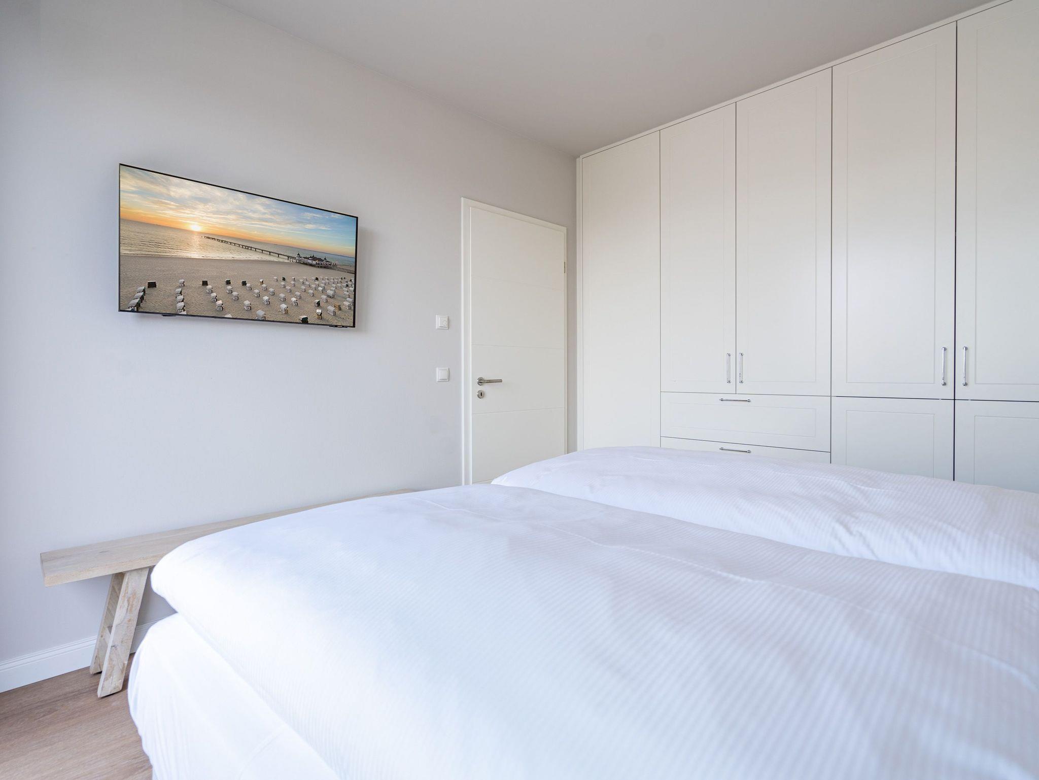 Willkommen im Strandterrasse-Appartement A3.1 (Haus A). Dieses charmante 2-Zimmer-Apartment lädt mit seinen 46 Quadratmetern in der 3. Etage zu einer entspannten Ostseeauszeit für 2 Personen ein. Die großen Fenster lassen viel Licht in dieses exklusive und elegant eingerichtete Feriendomizil der Extra-Klasse. Der offene Wohnbereich begrüßt Sie mit einem schönen, hellen Esstisch, einem kuscheligen Sofa und einem 50-Zoll-Flachbildfernseher. Ein Elektrokamin (ohne Wärmeabgabe) sorgt für eine gemütliche Atmosphäre. Der großzügige Nord-West-Balkon kann sowohl vom Wohnzimmer als auch vom Schlafzimmer aus betreten werden. Hier können Sie bei seitlichem Blick auf die Ostsee von der Sonnenliege oder den Gartenmöbeln aus, Ihre Gedanken bis zum blauen Horizont auf Reisen schicken. Atmen Sie die aerosolhaltige Seeluft tief ein, denn sie ist gesund für die Atemwege und das Immunsystem. In das Wohnzimmer ist eine offene Küche integriert. Die hochwertigen Siemensgeräte wie der Backofen, ein 3-Platten-Induktionskochfeld und eine Geschirrspülmaschine erleichtern das Kochen und anschließende Saubermachen ungemein. Da werden das Genießen und das Entspannen zum Erlebnis. Das Schlafzimmer bietet ein luxuriöses und vor allem äußerst bequemes Boxspringdoppelbett (1,80m x 2,00m), einen geräumigen Kleiderschrank und einen weiteren 43-Zoll-Flachbildfernseher. Das innenliegende Bad ist mit einer Dusche, einem WC und einem Waschtisch ausgestattet. Ein reservierter PKW-Stellplatz in der Tiefgarage sorgt dafür, dass Ihr Fahrzeug sicher untergebracht ist und Sie unbesorgt die Umgebung erkunden können. Erleben Sie unvergessliche Tage am Meer.